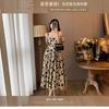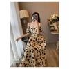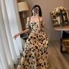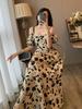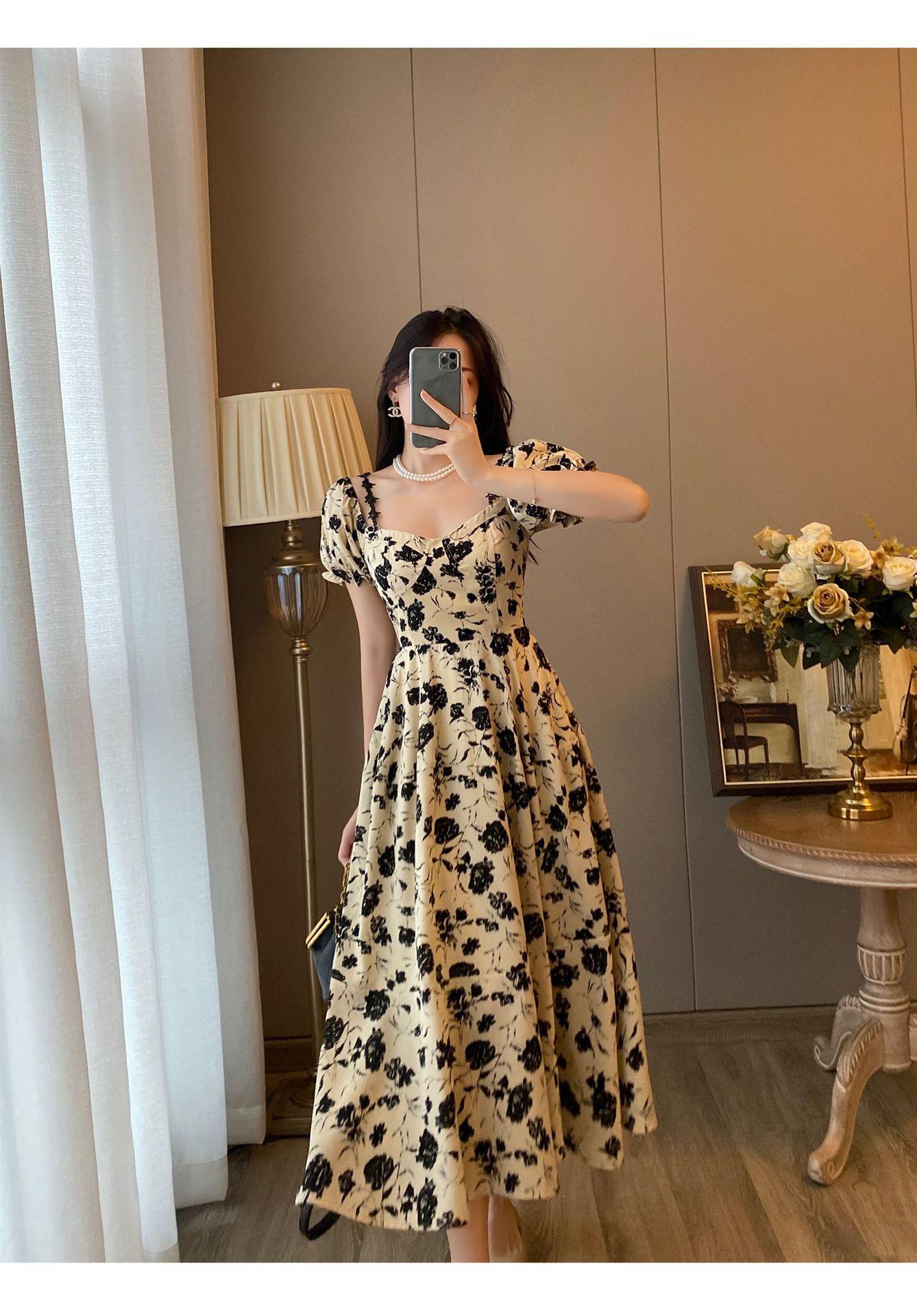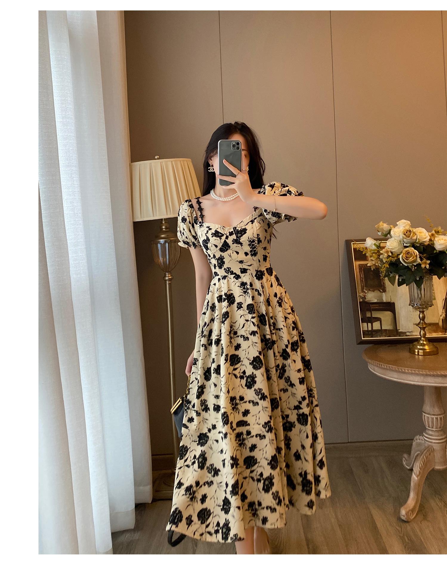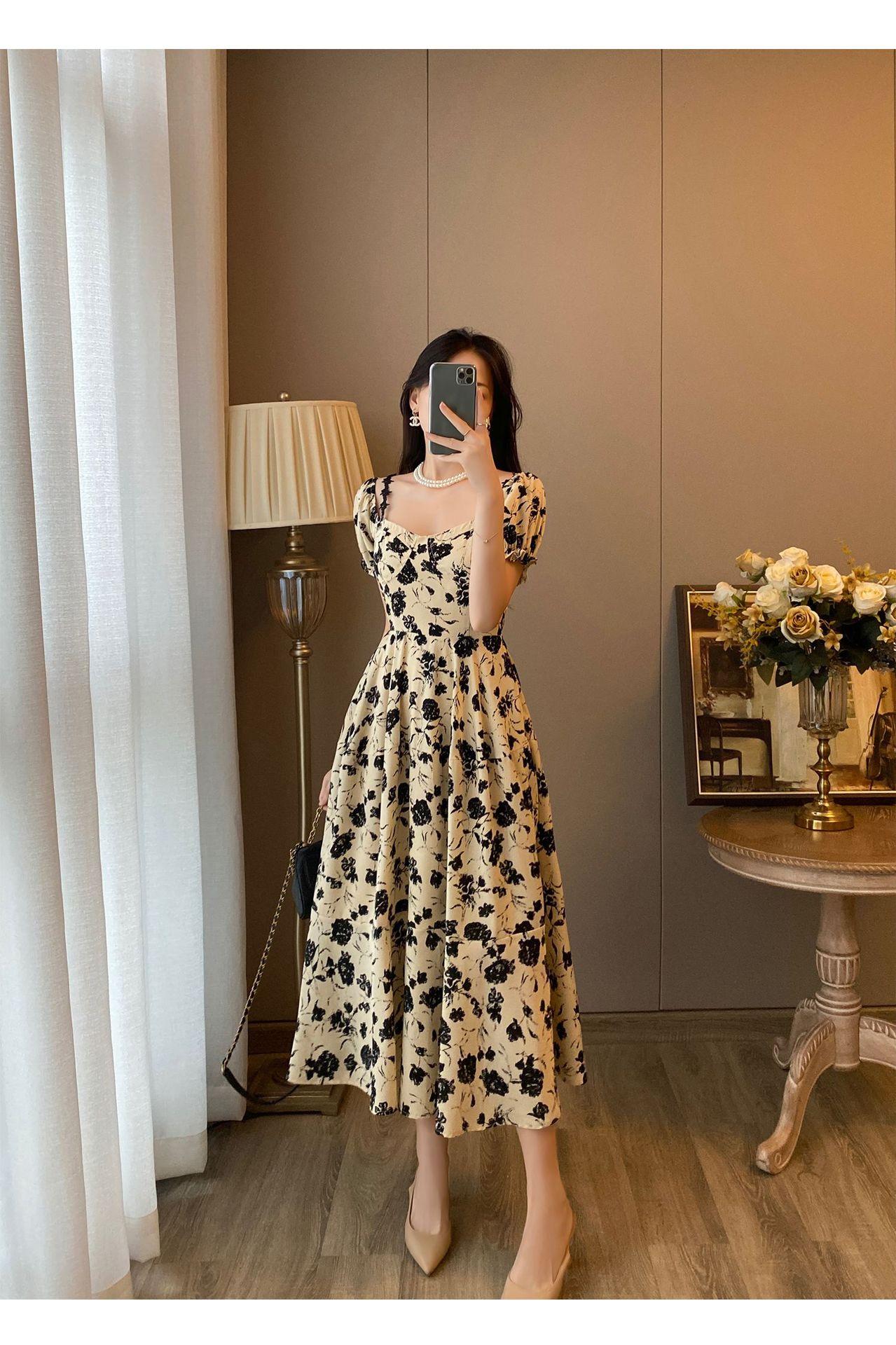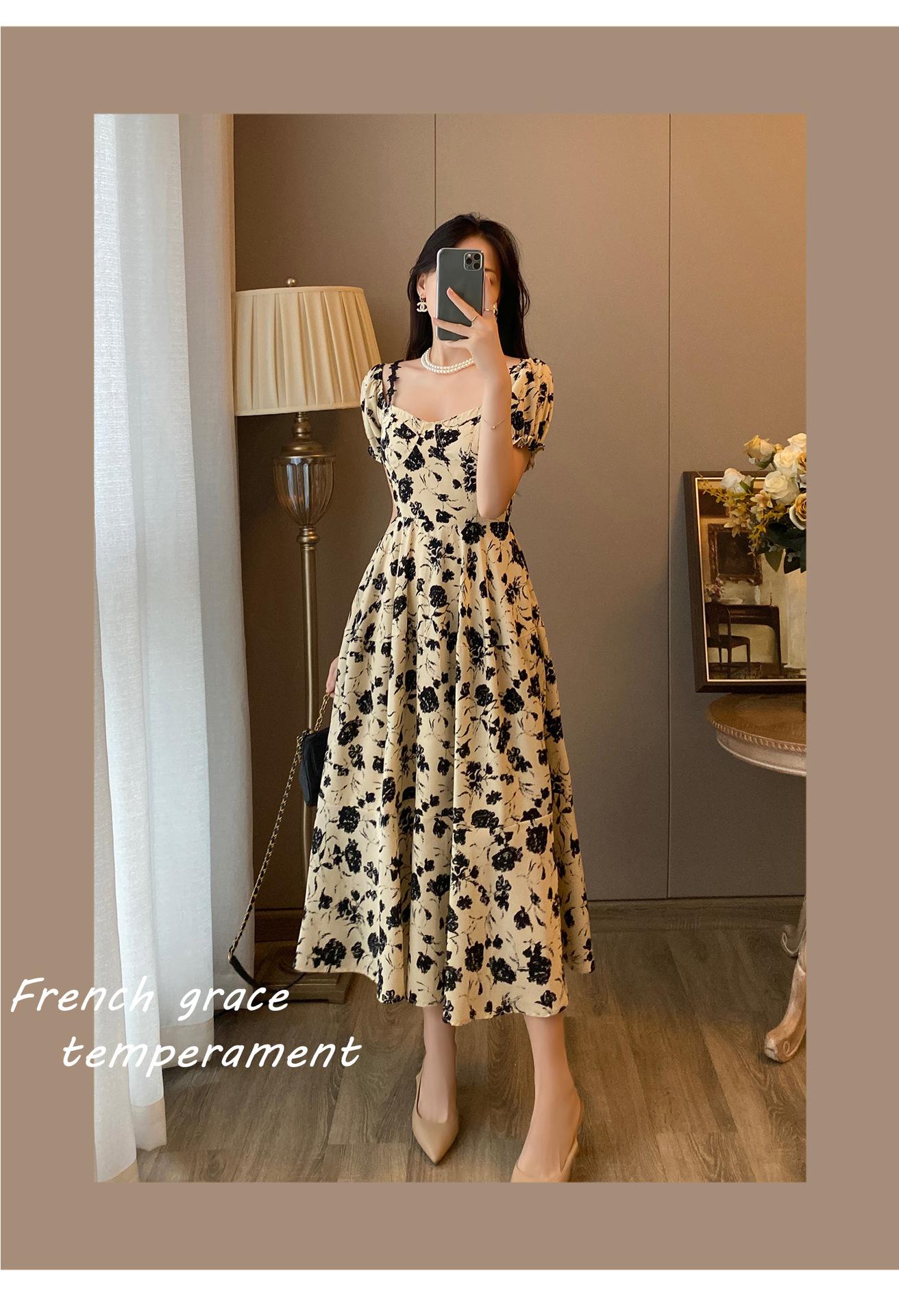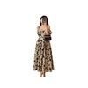 Vestido floral vintage francés estilo Hepburn con hombros descubiertos y falda de manga corta, vestido largo elegante de verano con cintura nueva.
