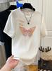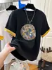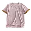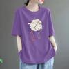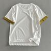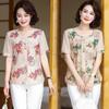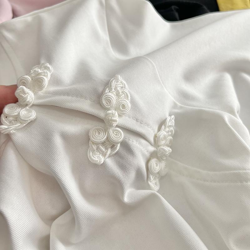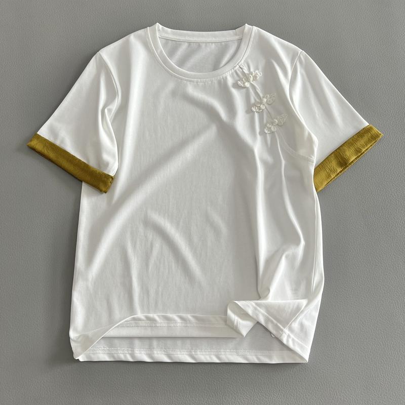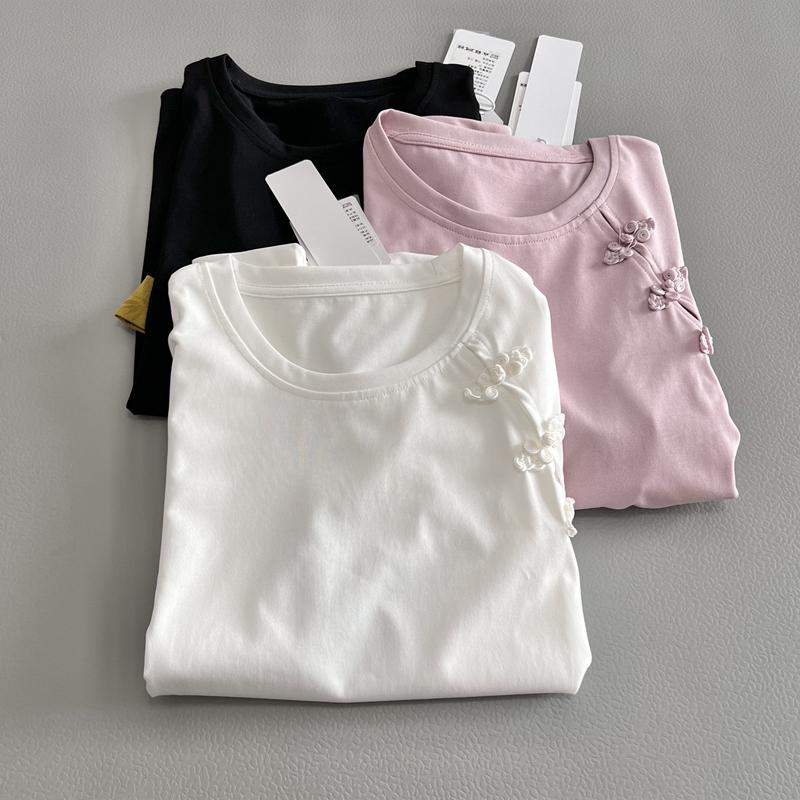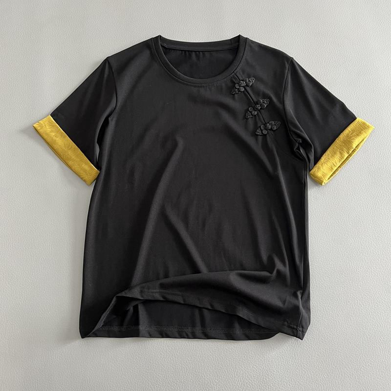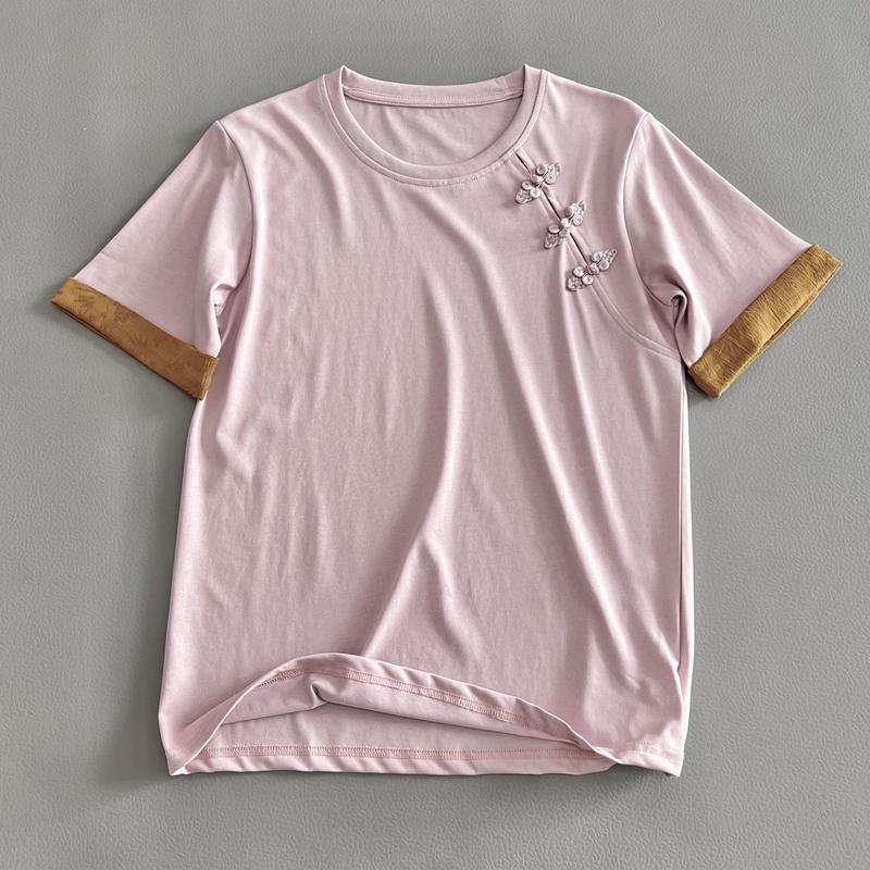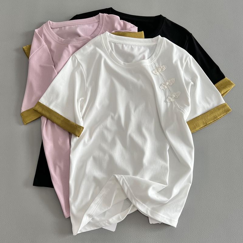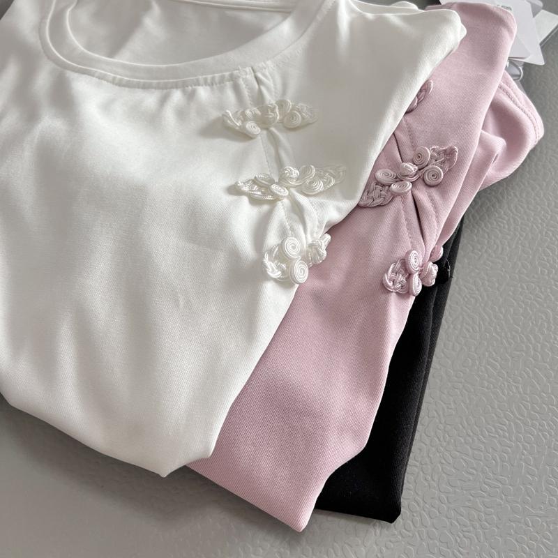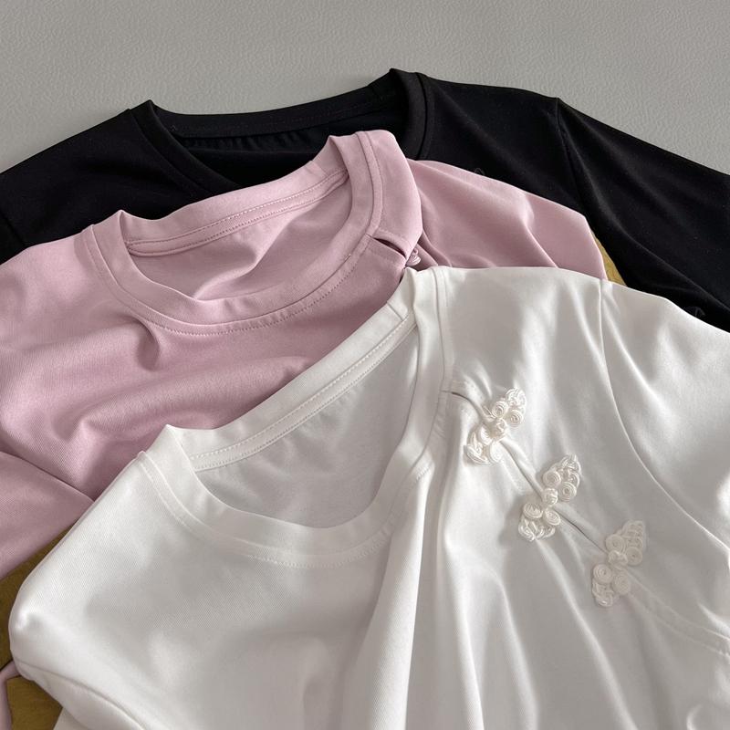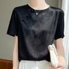 Camiseta de manga corta estilo chino para mujer, estilo nacional, con hebilla en el cuello, para verano, holgada, informal, de media manga y cuello redondo.