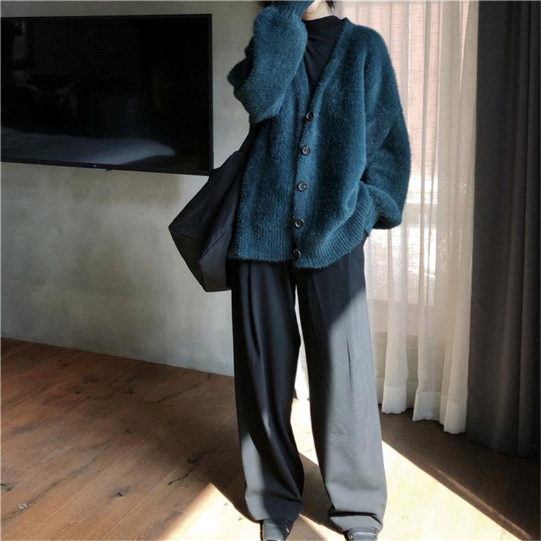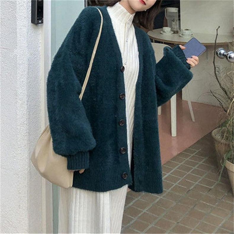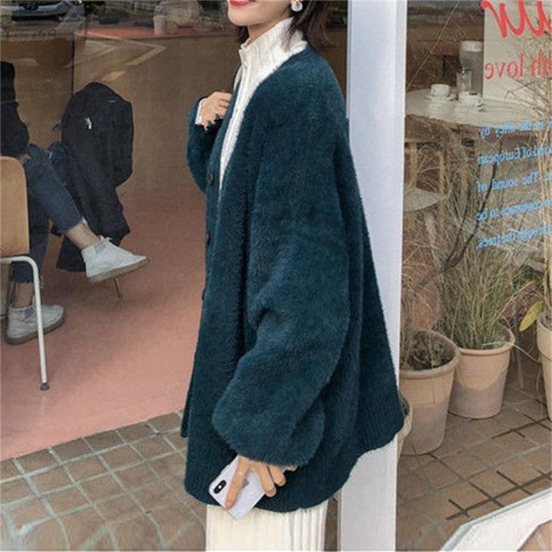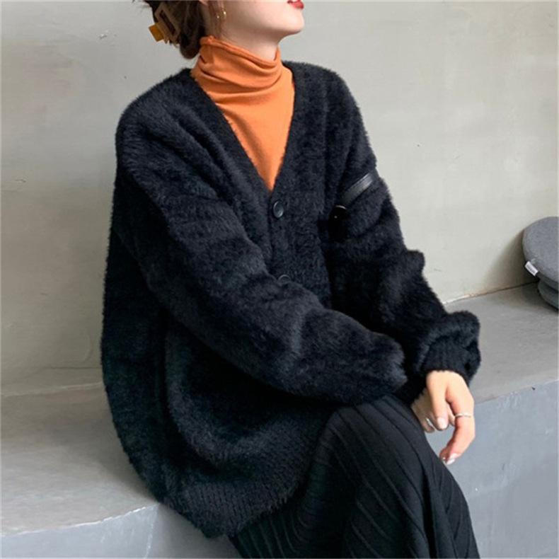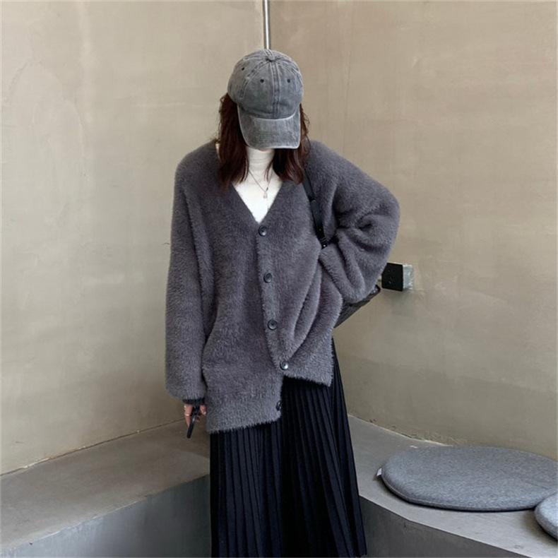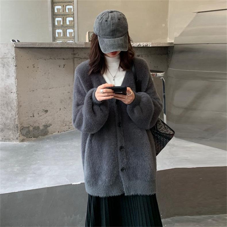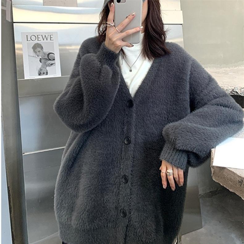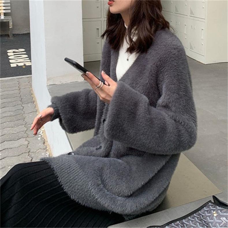 Suéter de Terciopelo Visón Imitación para Mujer Abrigo para Mujer Otoño e Invierno Nuevo Estilo Holgado Exterior Adelgazante Punto Cuello en V Cárdigan de Punto para Mujer