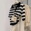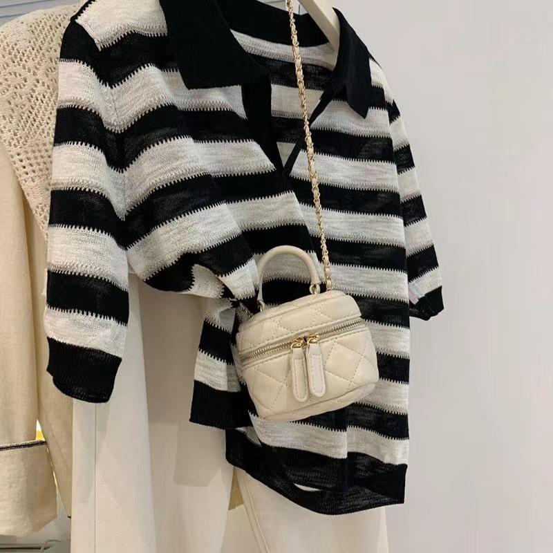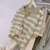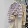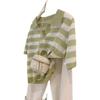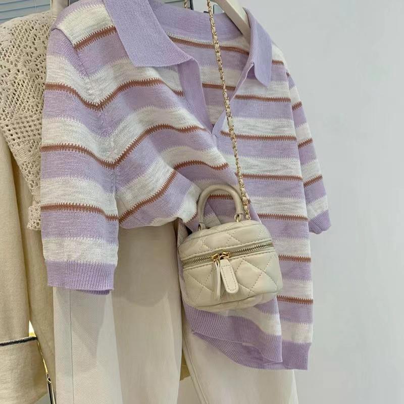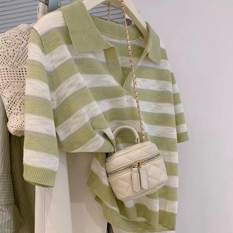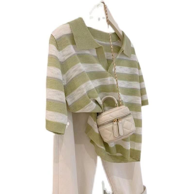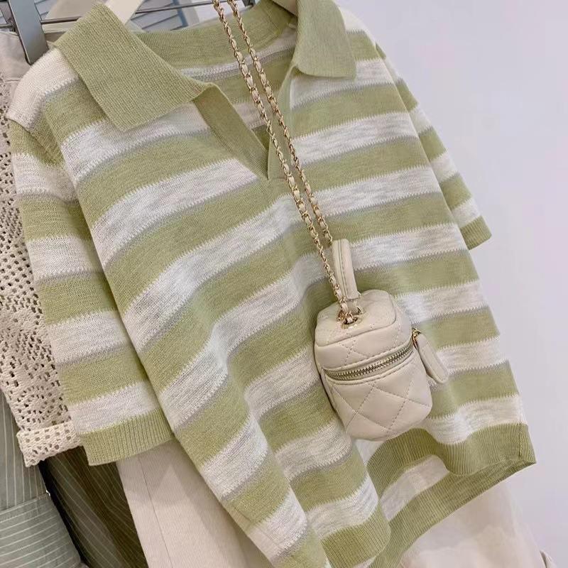 Polo de cuello de seda de hielo de hombro recto a rayas de manga corta para mujer, diseño de verano de nicho, camiseta tejida holgada, top