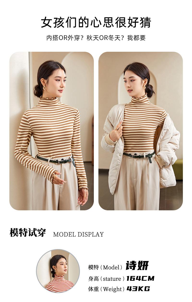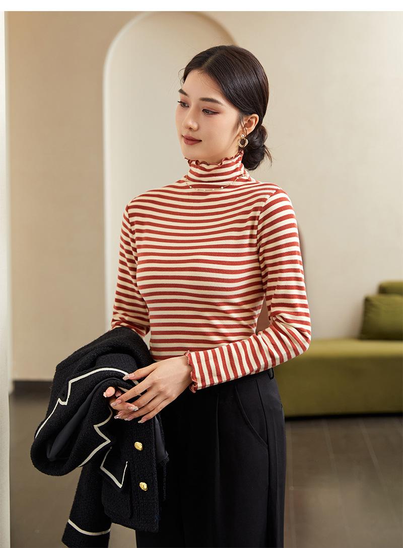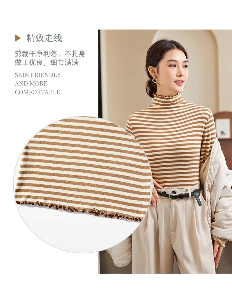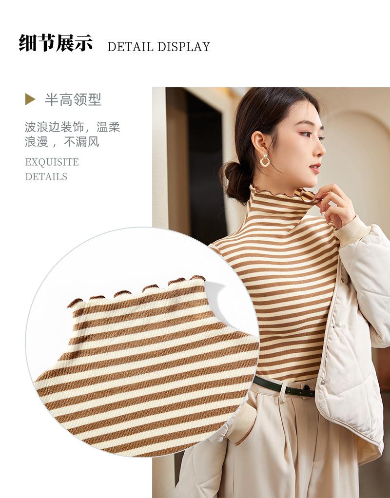 Camisa de base de rayas de terciopelo para mujer, otoño e invierno, con forro polar interior, gruesa, cálida, camiseta de manga larga, ropa de punto superior