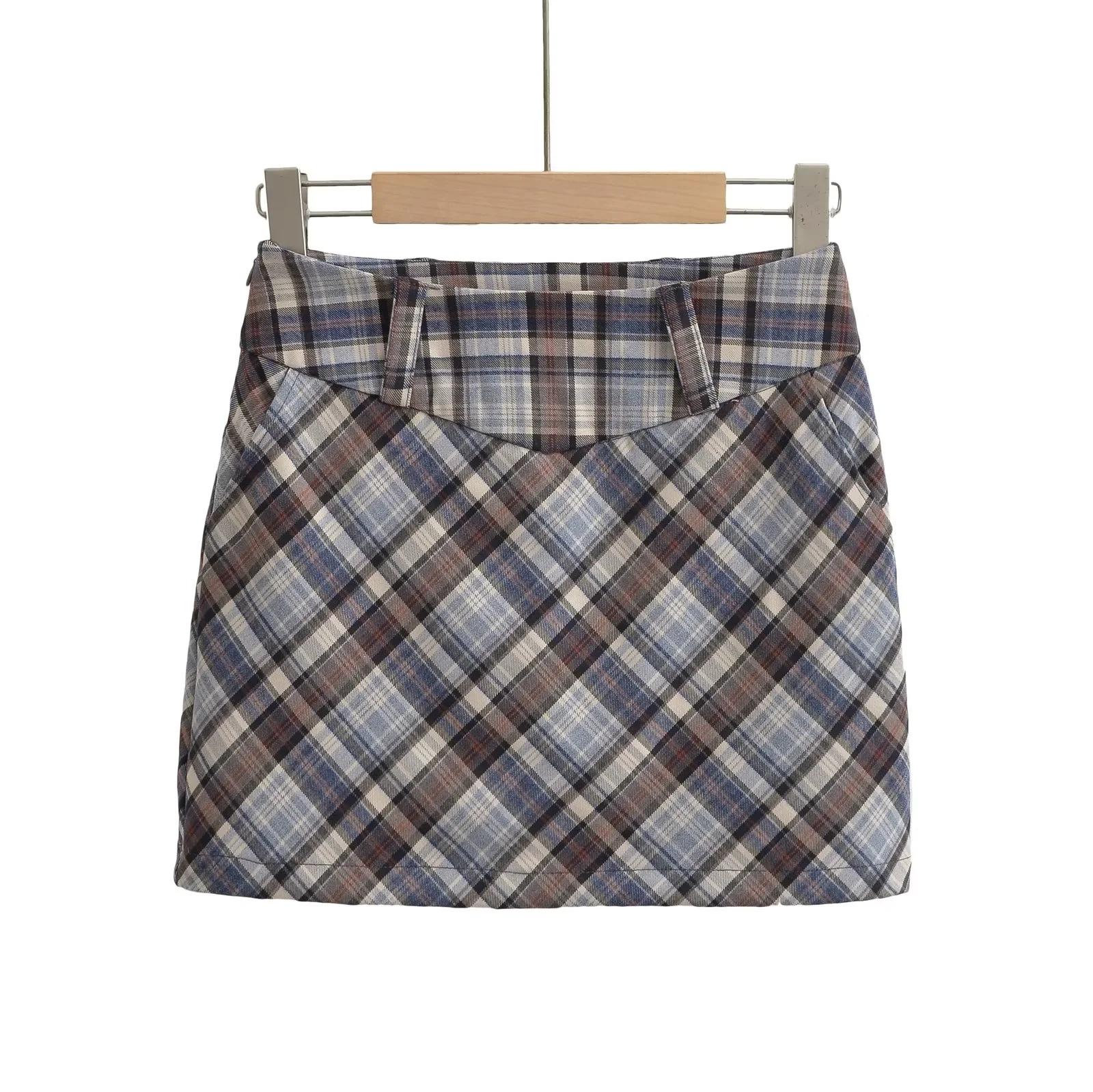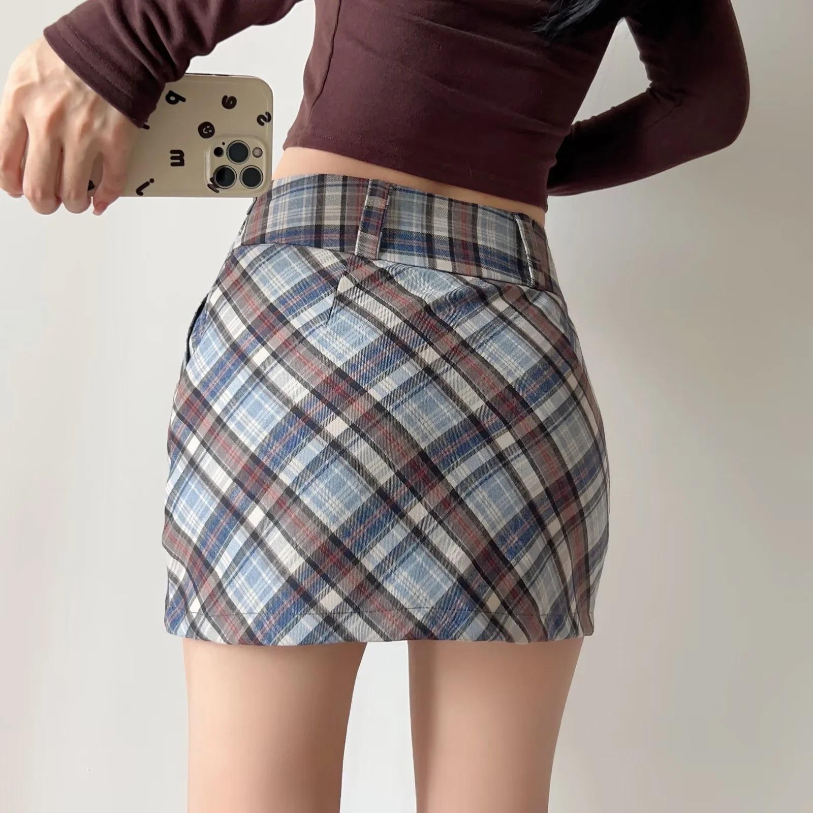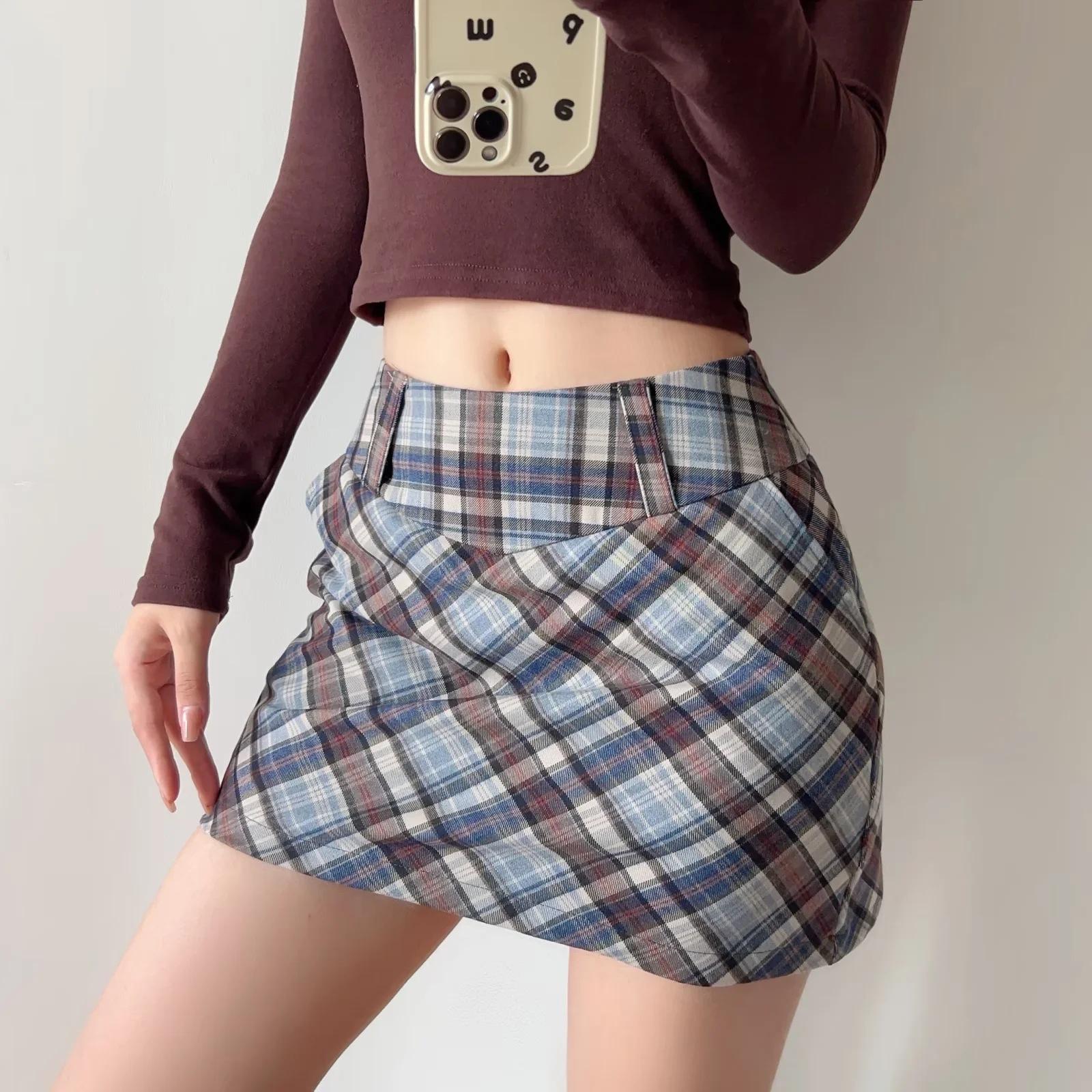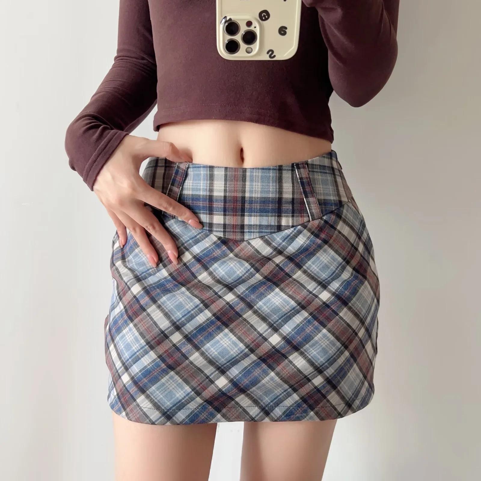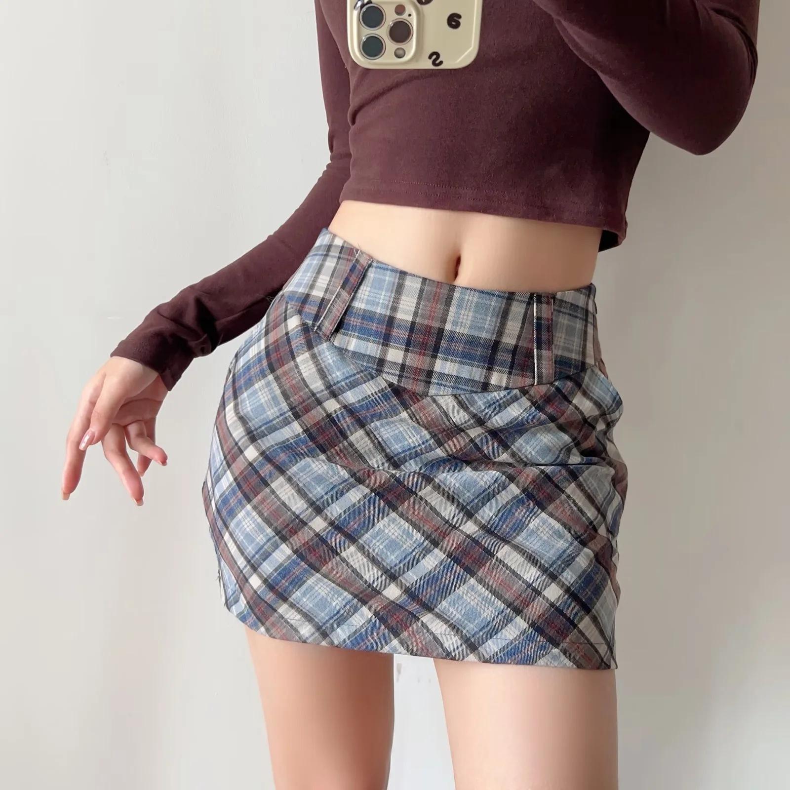 Falda a cuadros estilo preppy estilo americano retro, cintura alta, diseño pequeño, adelgazante, corte A, falda a cuadros hasta la cadera.