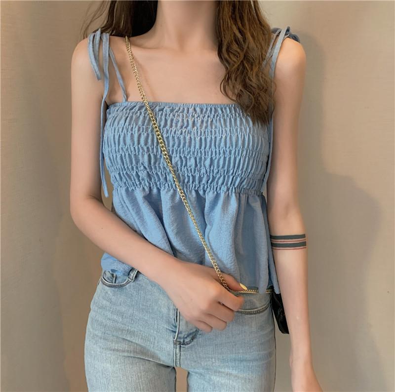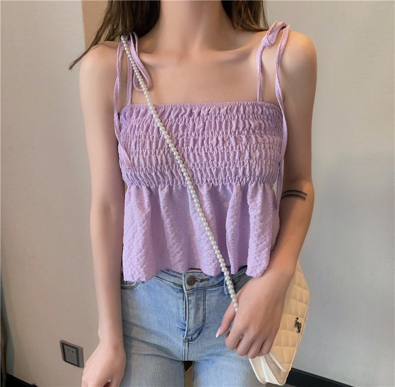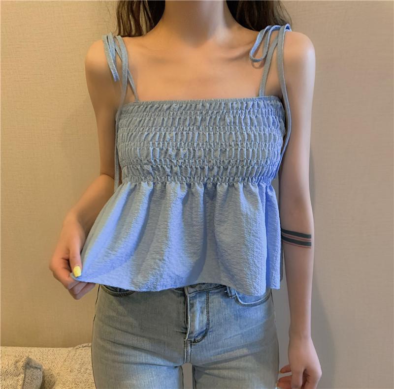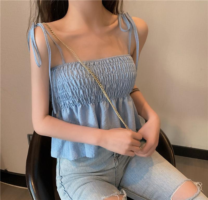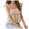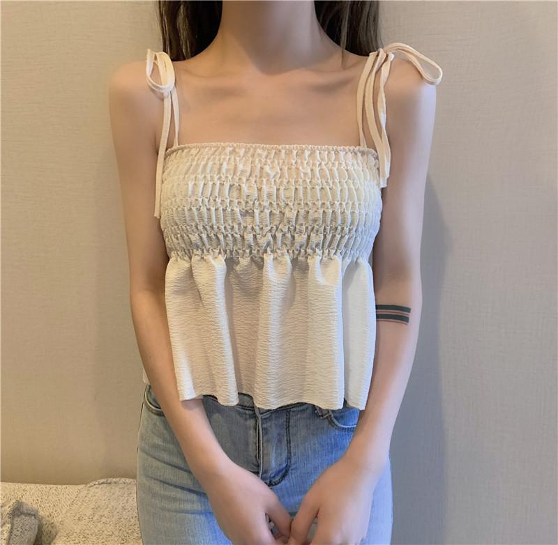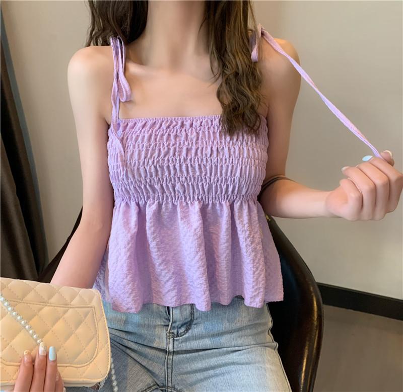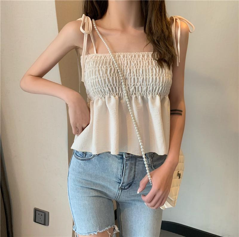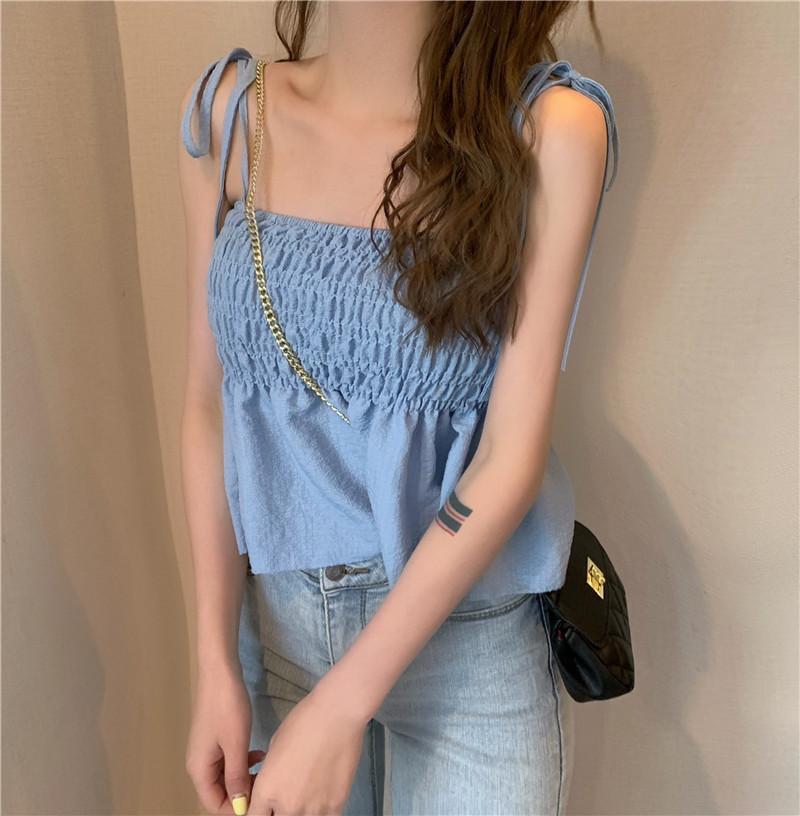 Verano 2023 Nuevo Estilo Coreano Dulce Color Puro Corto con Cordones Plisado Cuello Plano Camisola Ajustada Top para Mujer