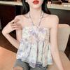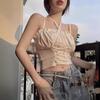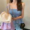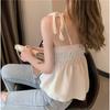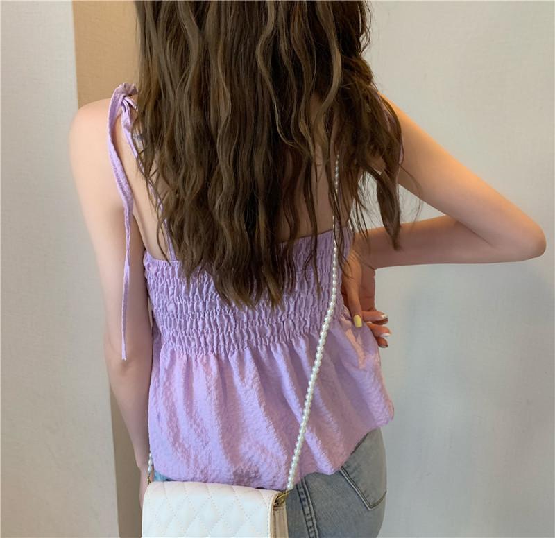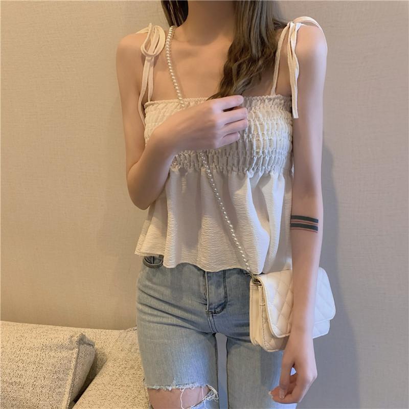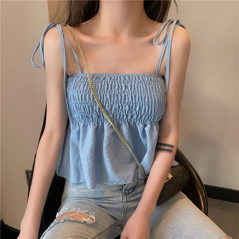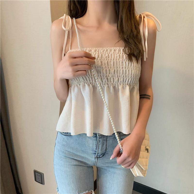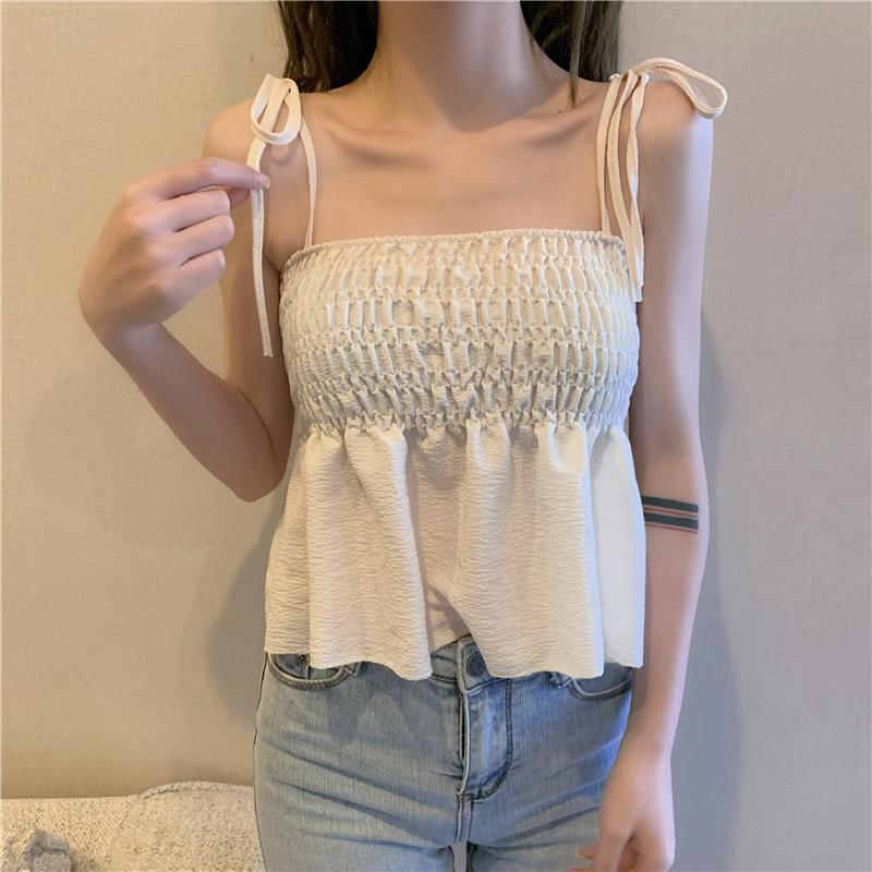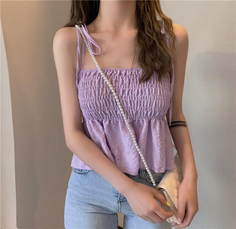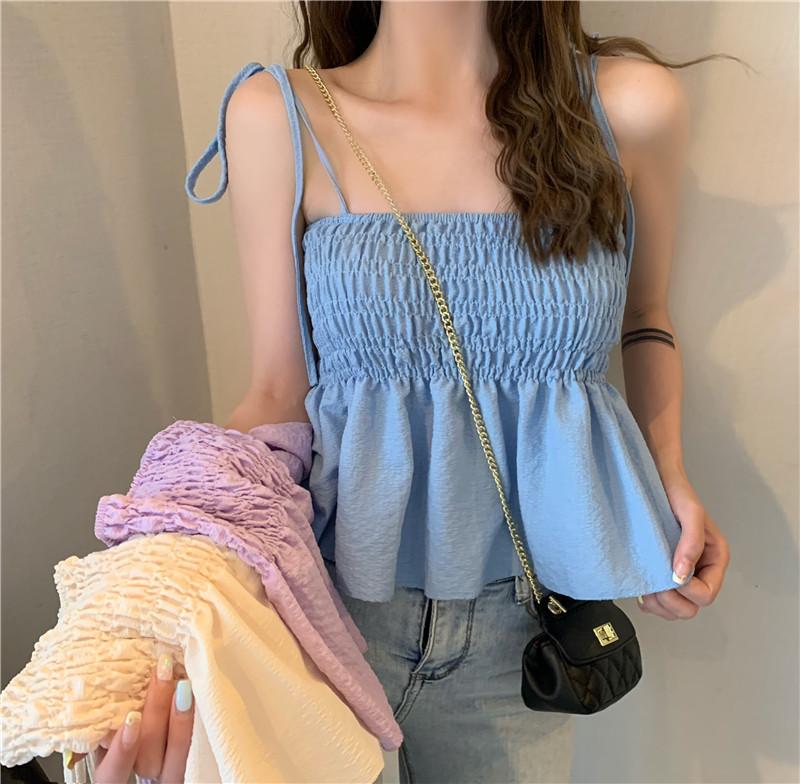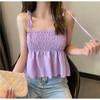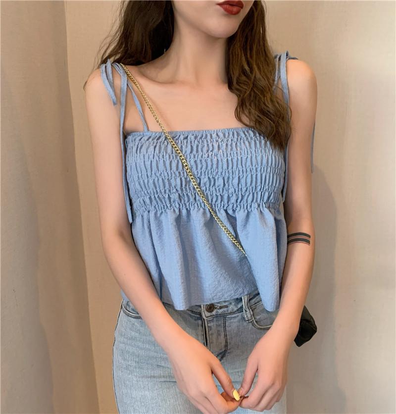 Verano 2023 Nuevo Estilo Coreano Dulce Color Puro Corto con Cordones Plisado Cuello Plano Camisola Ajustada Top para Mujer
