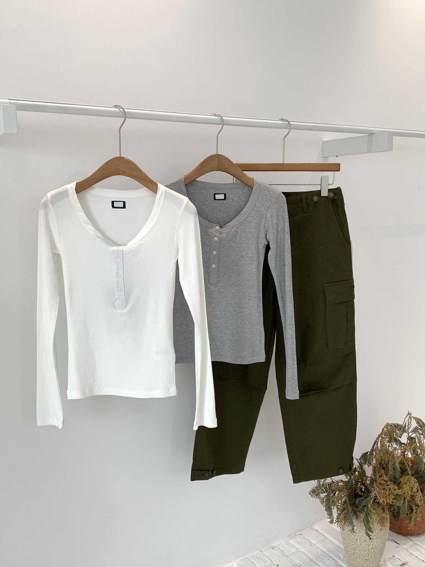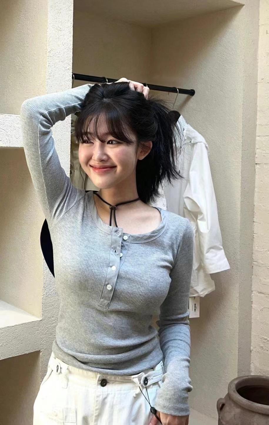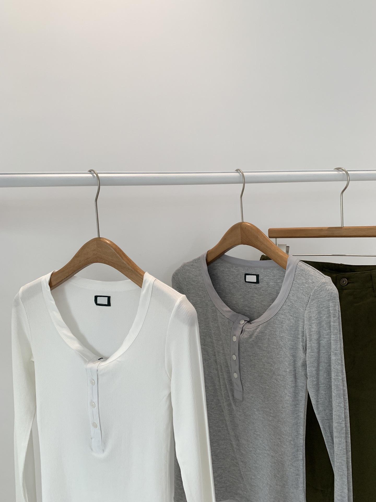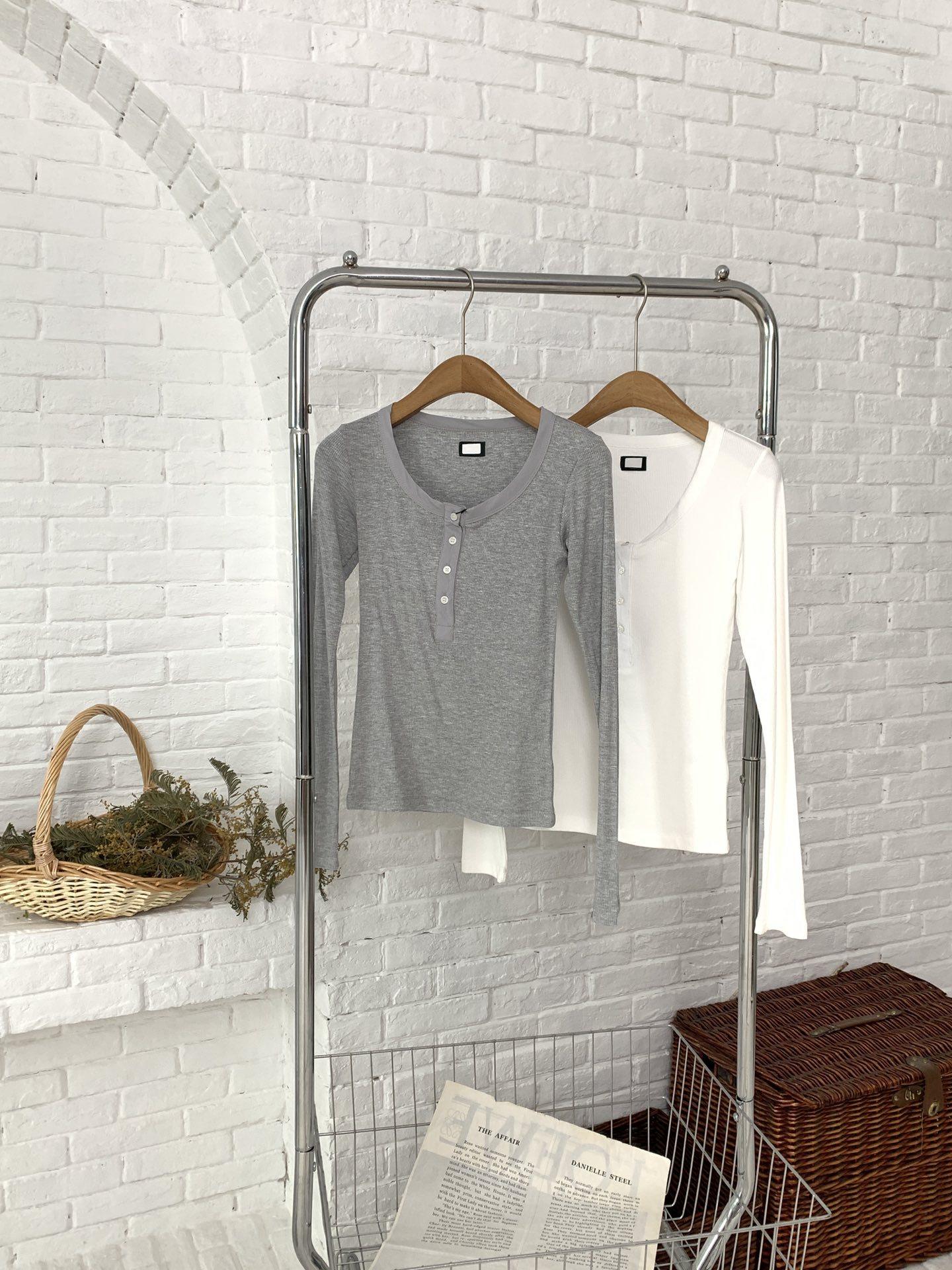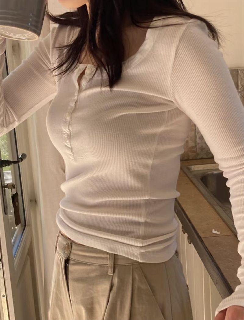 En stock Camisa de manga larga con cuello redondo Joker para mujer, primavera, media abertura, hebilla, color sólido, corte entallado, top the barnn * t