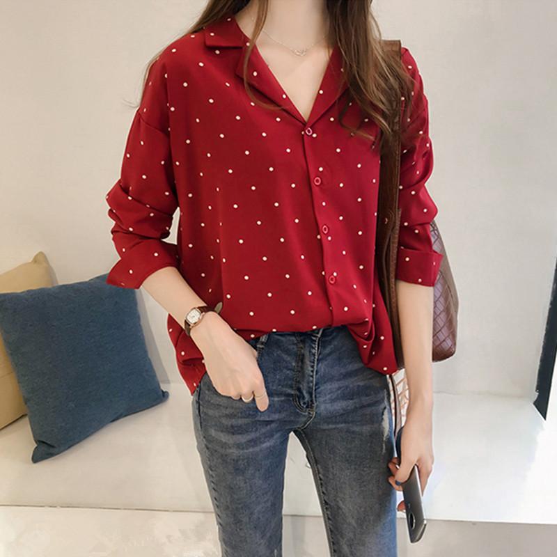 2025 Principios de Otoño Nuevo Estilo Hong Kong para Mujer Camisa de Chifón con Estampado de Lunares Top de Manga Larga Blusa Estilo Coreano Camisa Básica