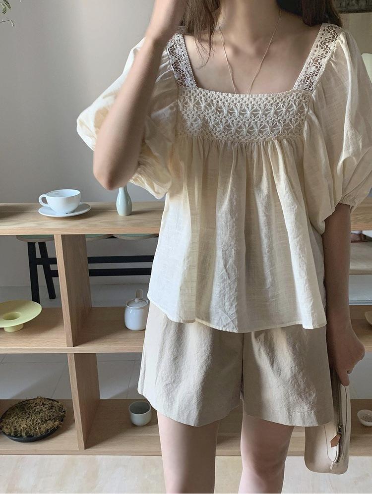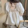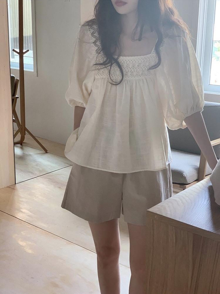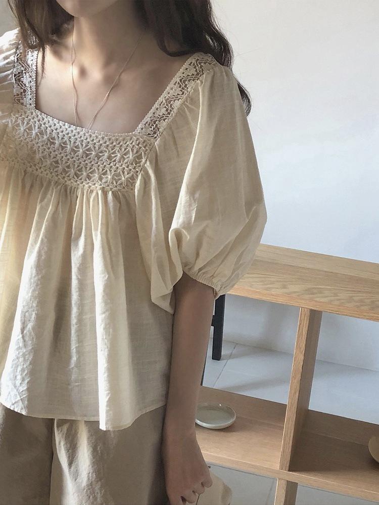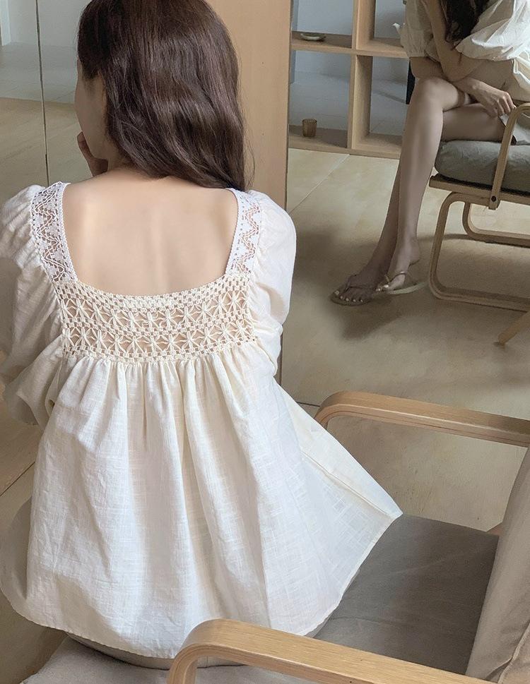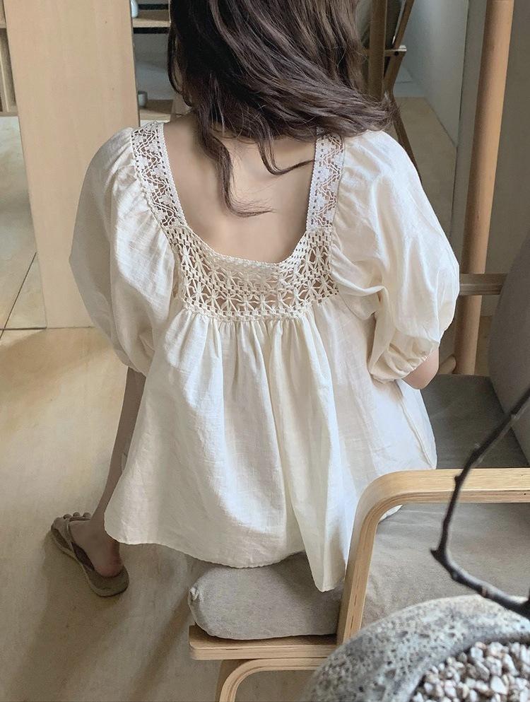 2023 Verano Nuevo Diseño Estilo Coreano Crochet Calado Manga Abullonada Elegante Cuello Cuadrado Camisa de Muñeca Top de Mujer