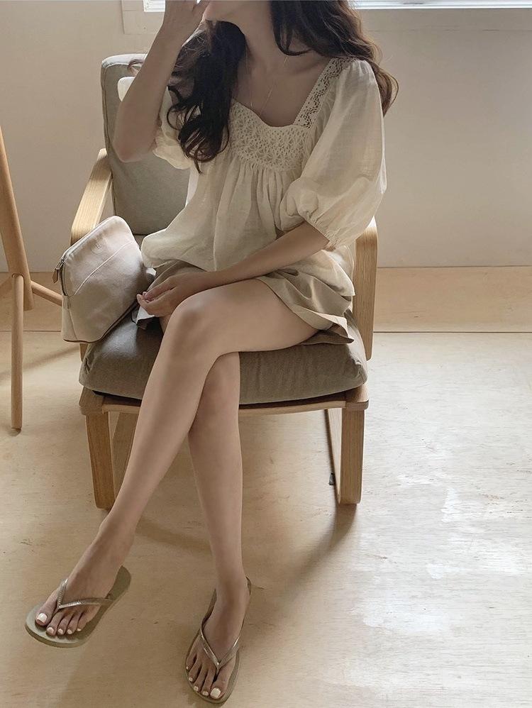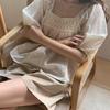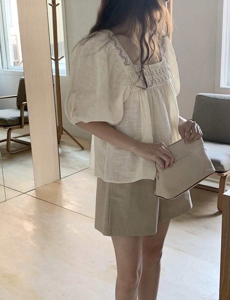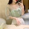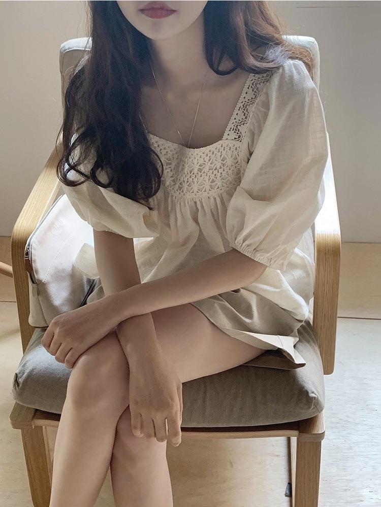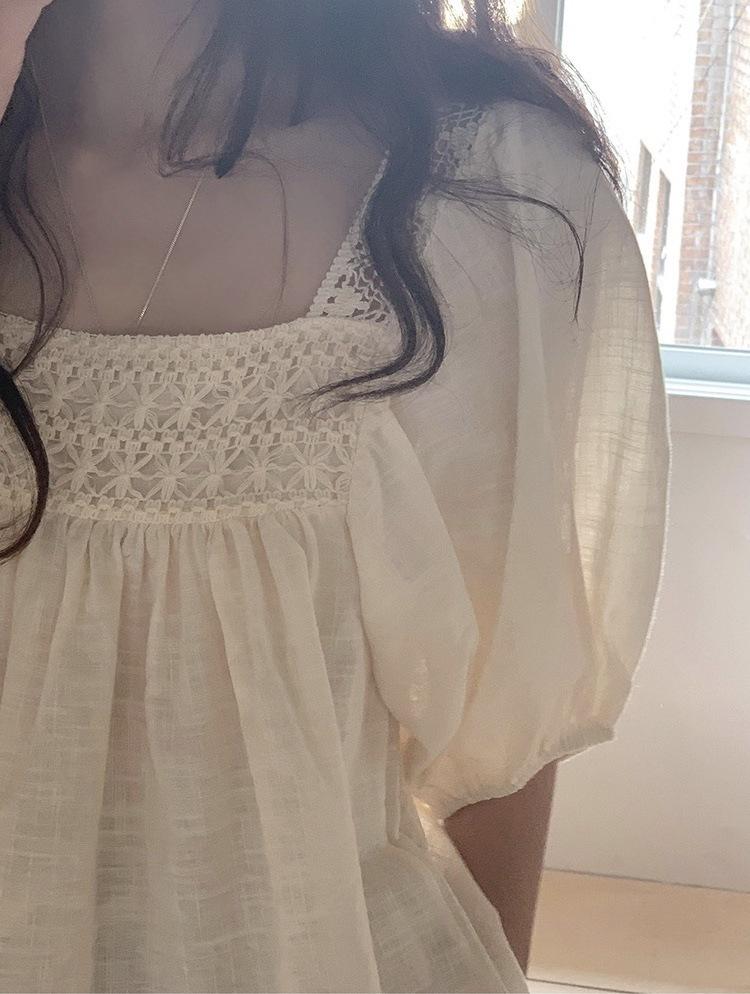 2023 Verano Nuevo Diseño Estilo Coreano Crochet Calado Manga Abullonada Elegante Cuello Cuadrado Camisa de Muñeca Top de Mujer