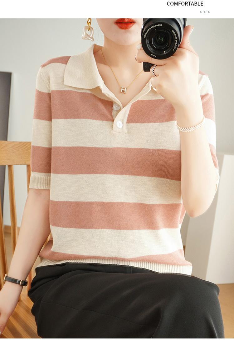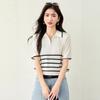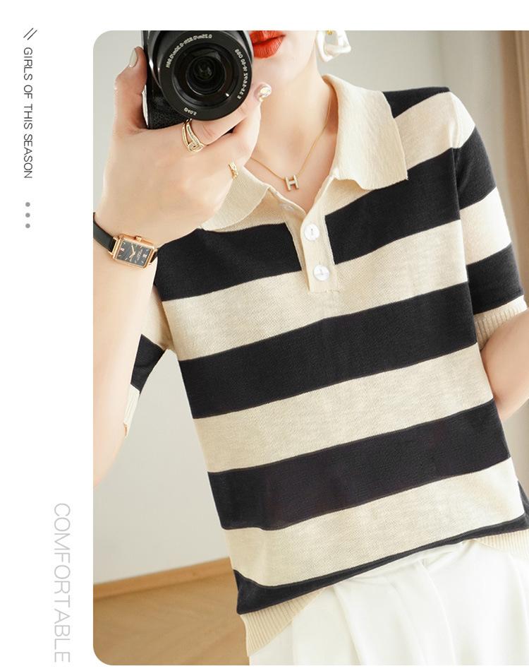Camiseta de manga corta con cuello POLO a rayas en contraste para mujer, estilo coreano, diseño holgado, solapa de media manga, verano 23