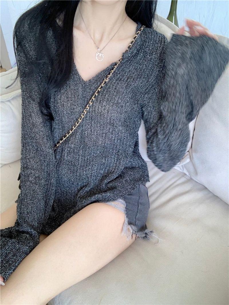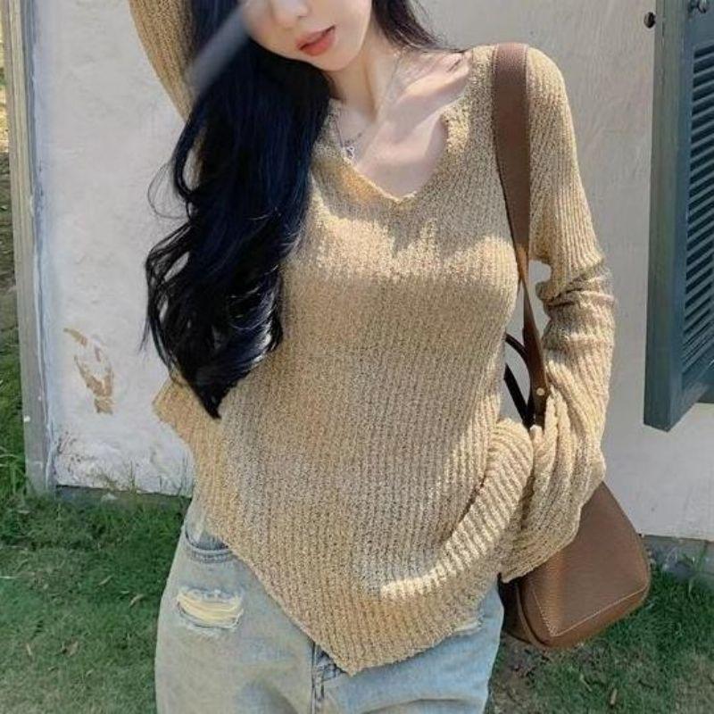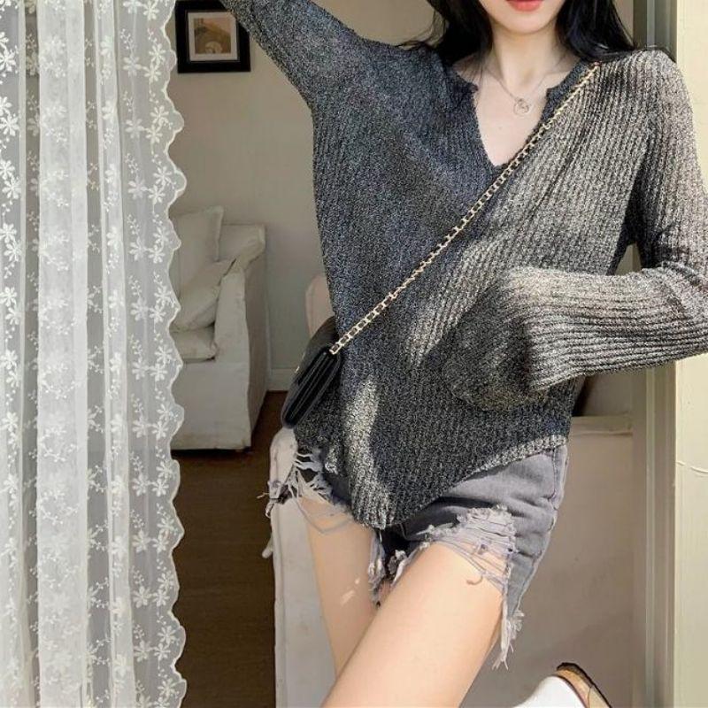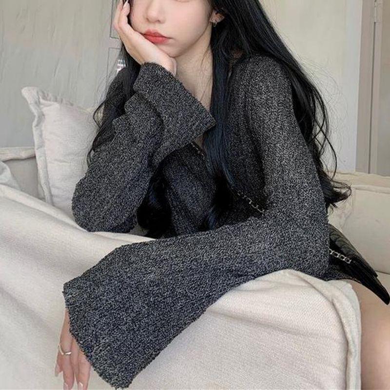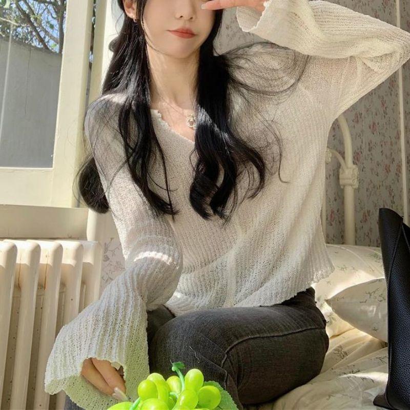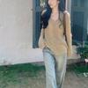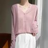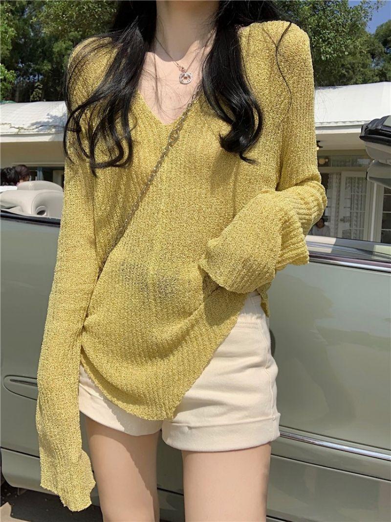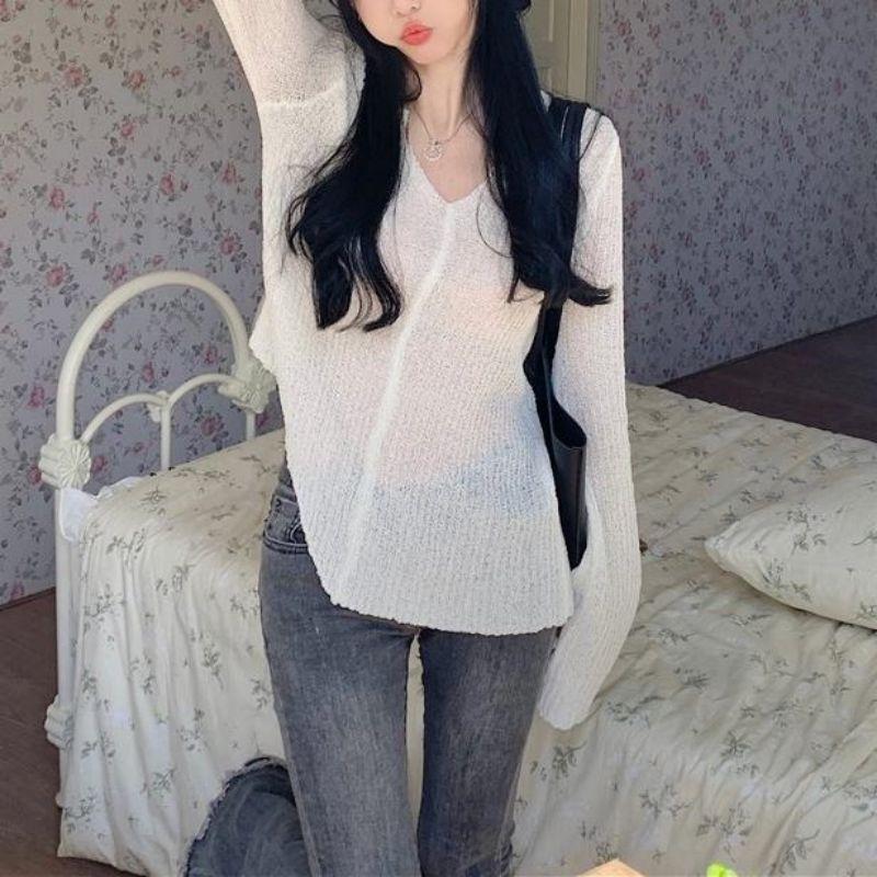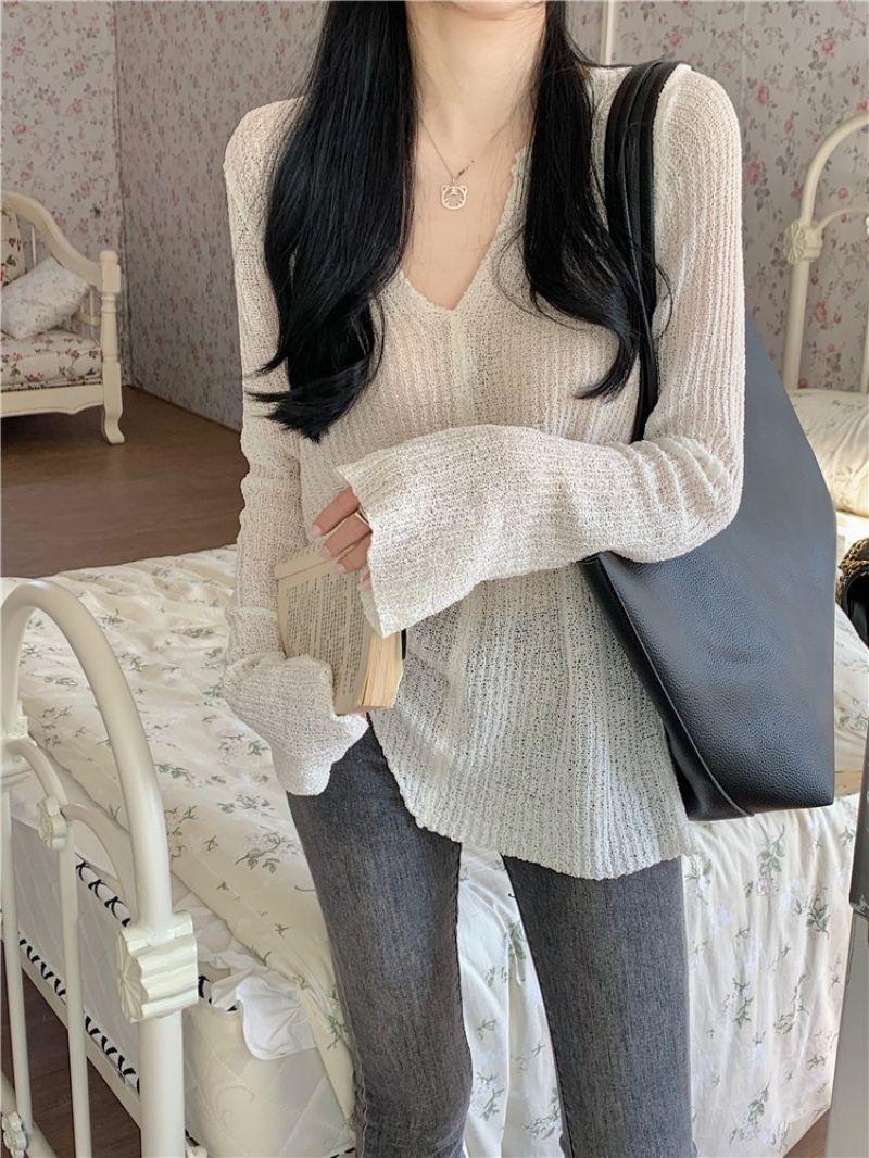 Cárdigan Delgado de Nicho con Cuello en V Camiseta Base para Mujer Verano Ajustado Suelto Negro Interior Camiseta de Punto Top Protector Solar