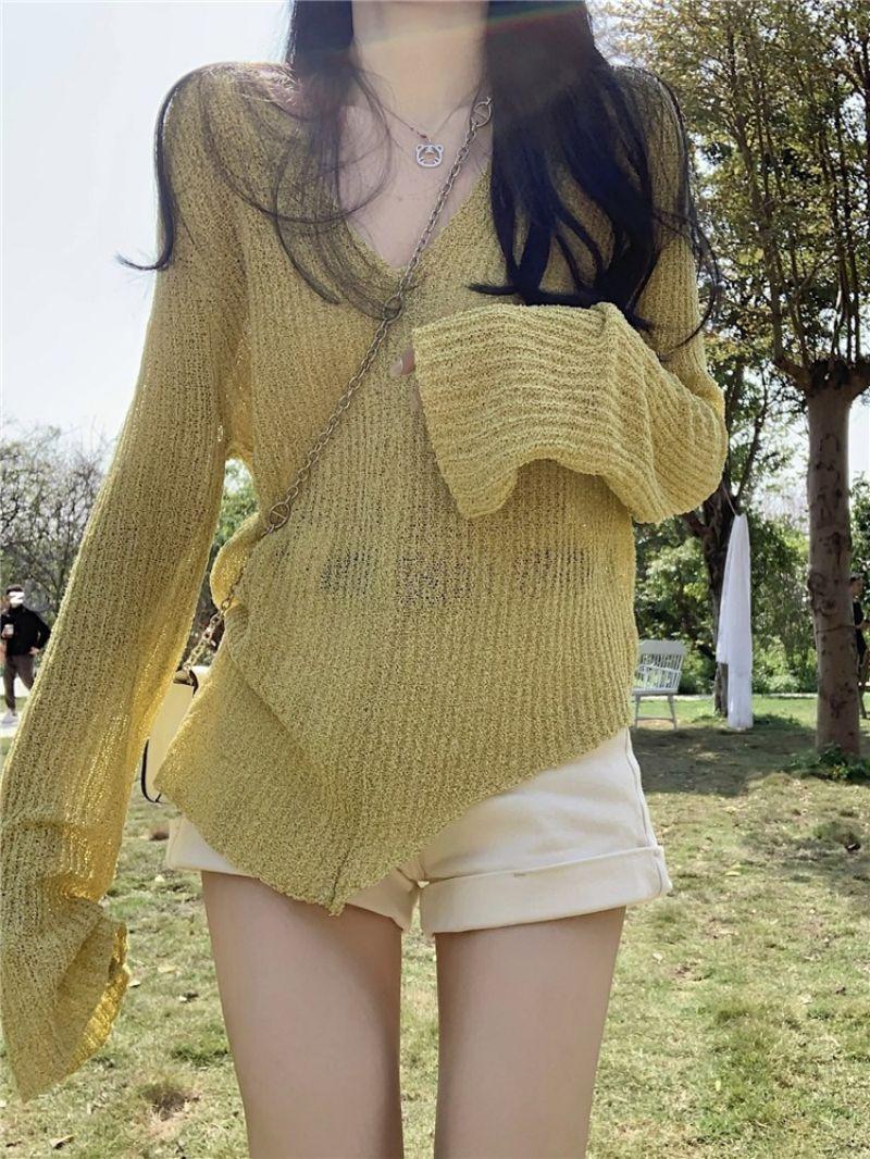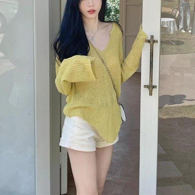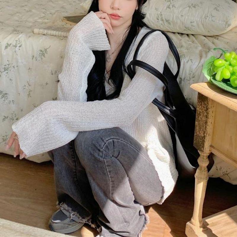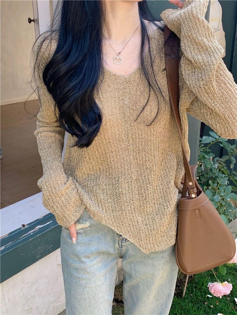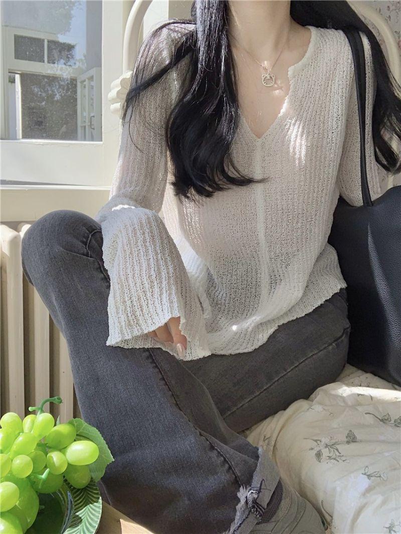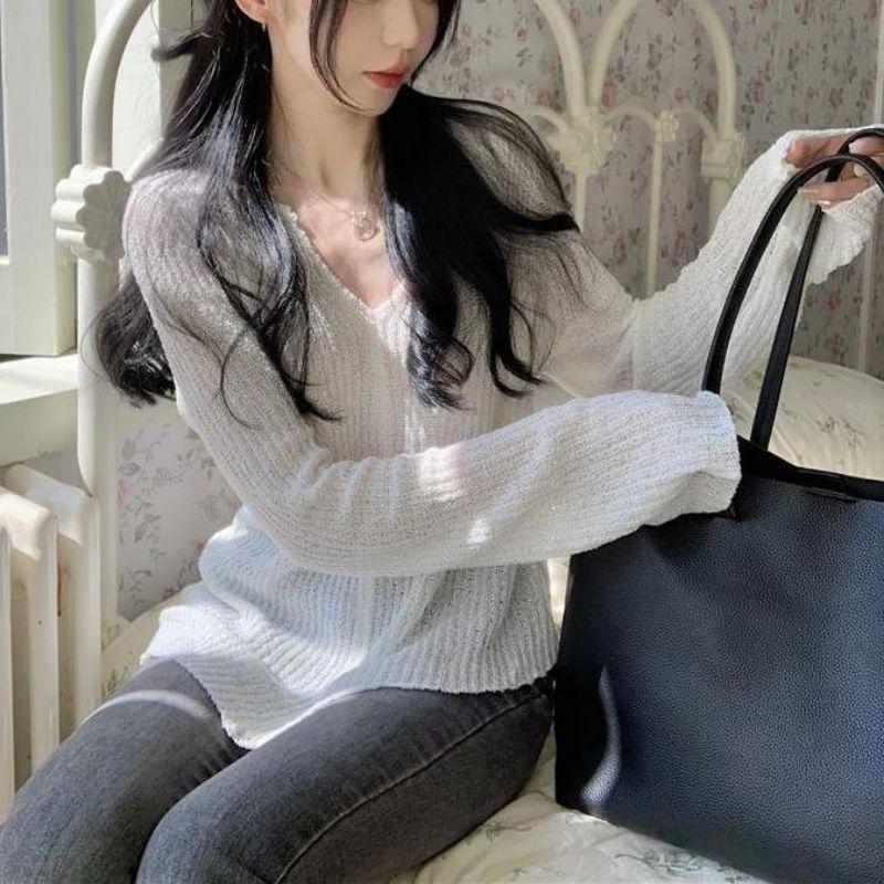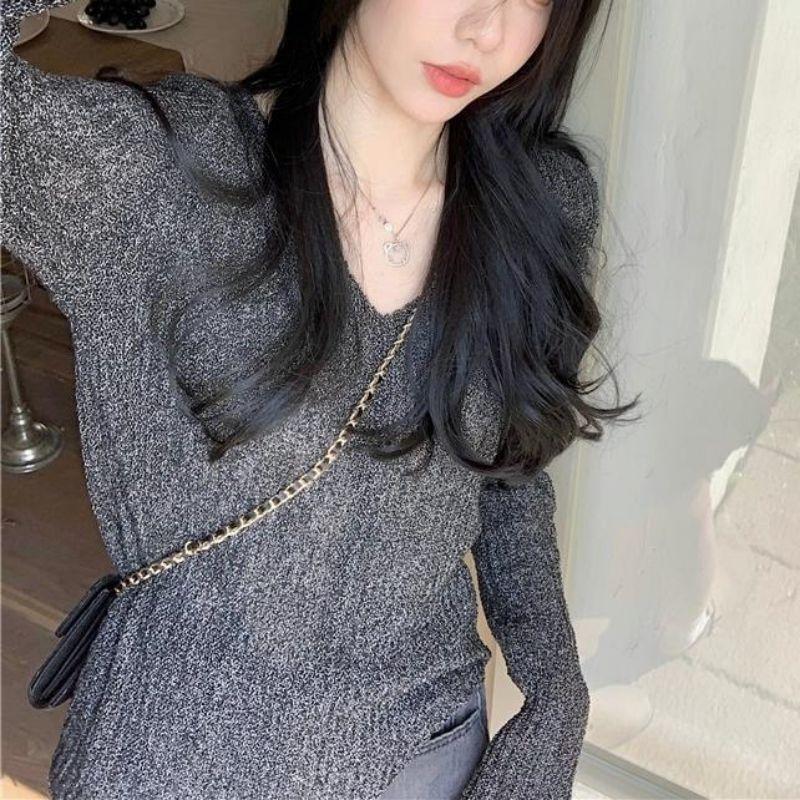 Cárdigan Delgado de Nicho con Cuello en V Camiseta Base para Mujer Verano Ajustado Suelto Negro Interior Camiseta de Punto Top Protector Solar