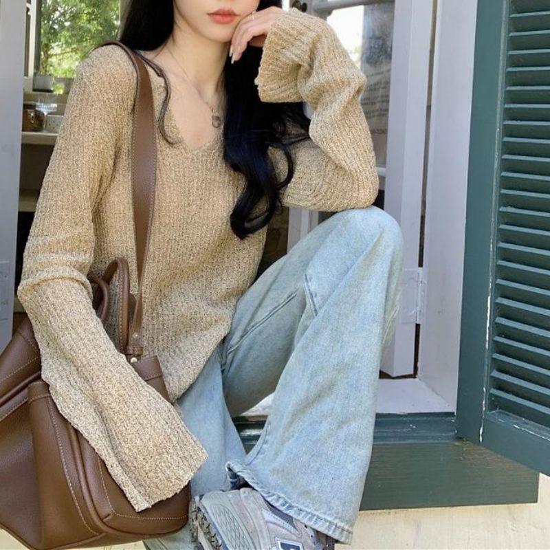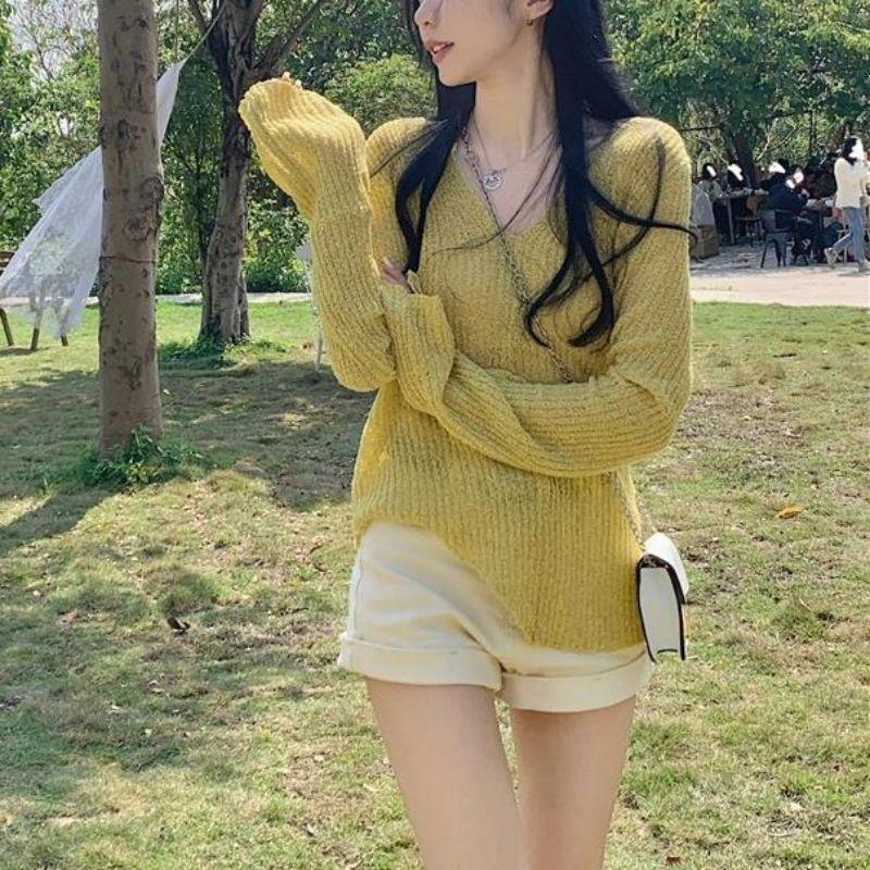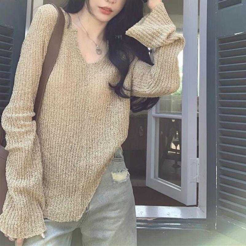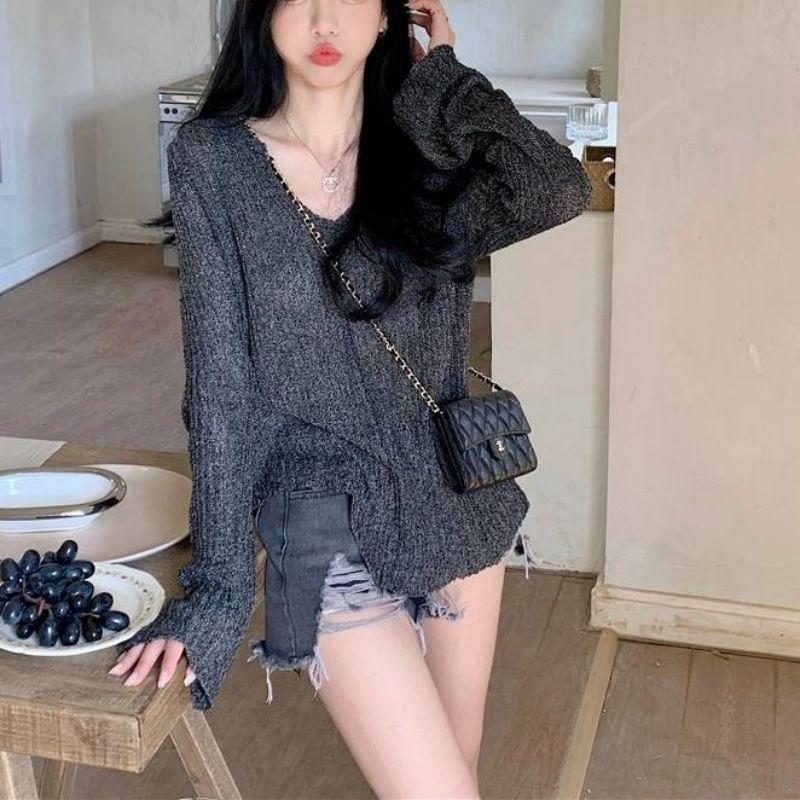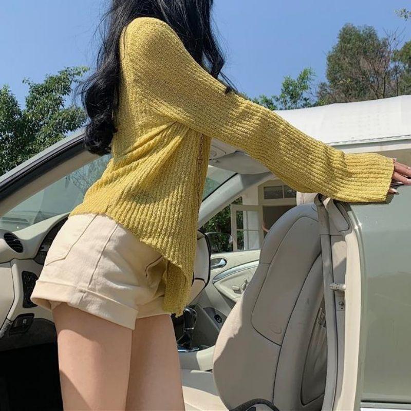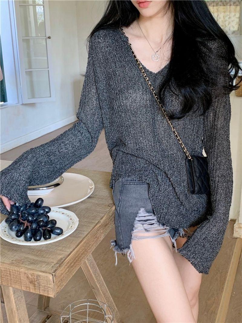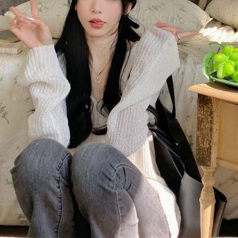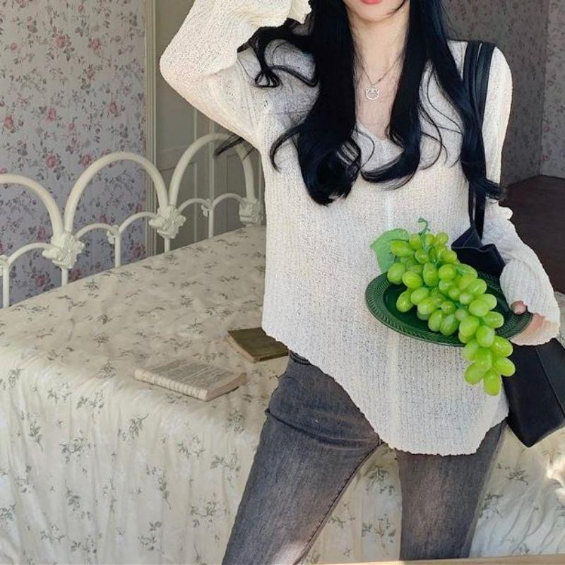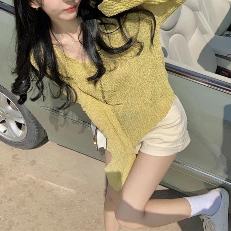 Cárdigan Delgado de Nicho con Cuello en V Camiseta Base para Mujer Verano Ajustado Suelto Negro Interior Camiseta de Punto Top Protector Solar