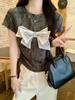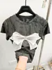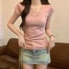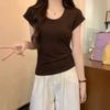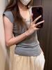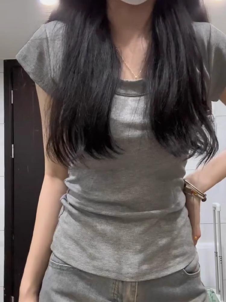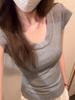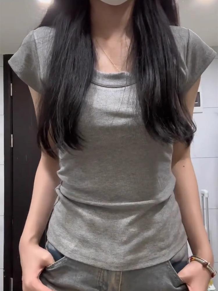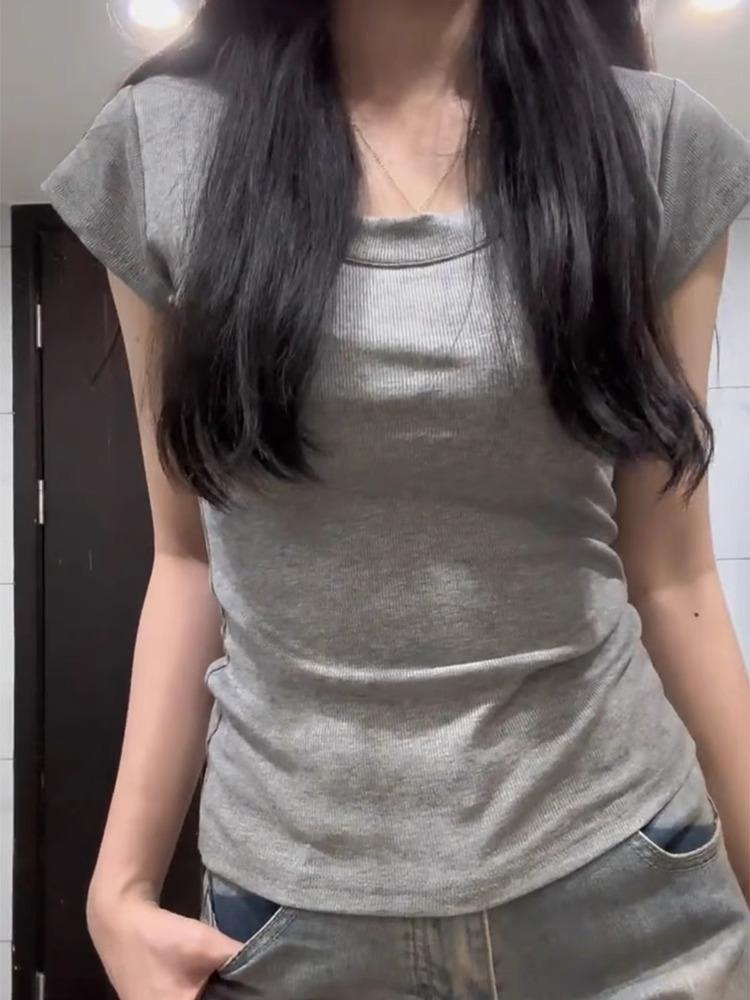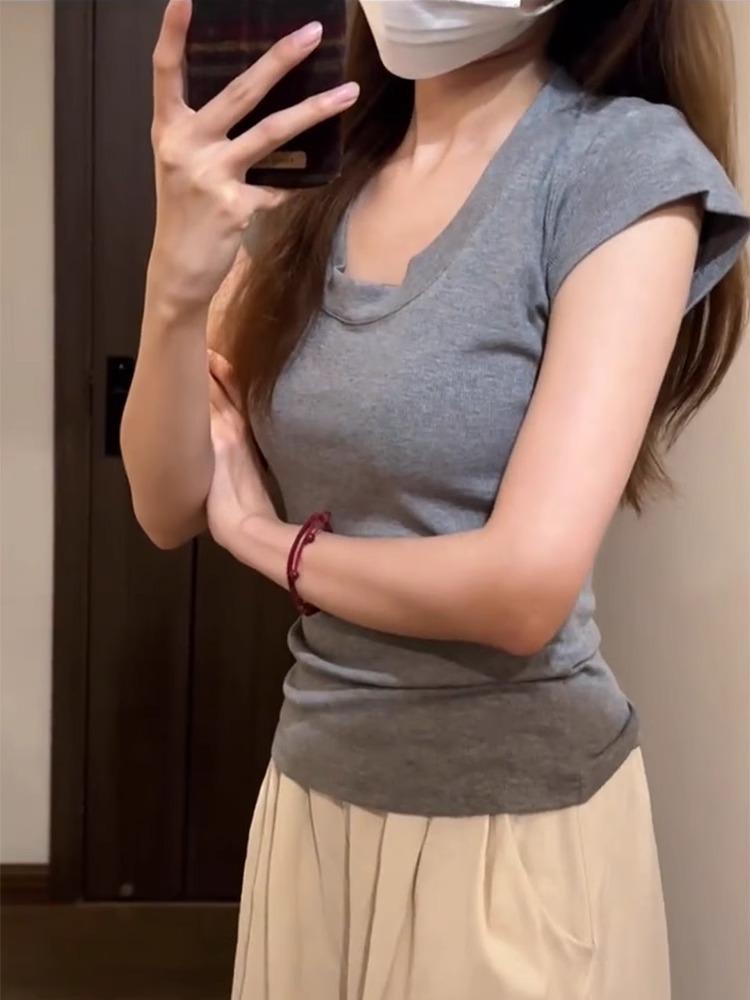 Camiseta gris de manga corta con cuello en U y hombros superdelgados para mujer, diseño de verano, top básico ajustado Sense Niche