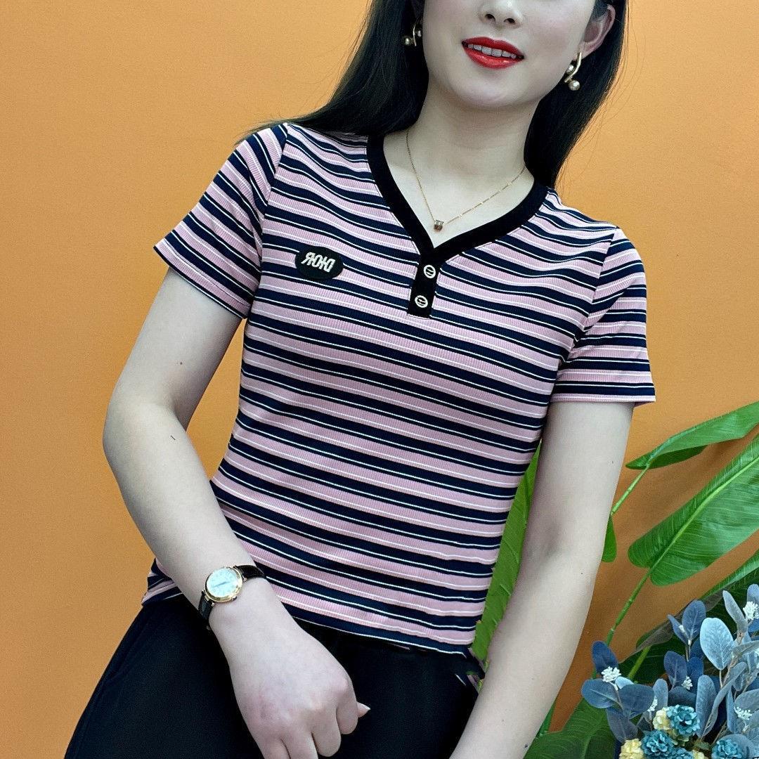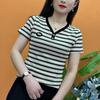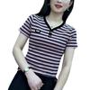 2024 Verano nueva camiseta de manga corta de moda para mujer cuello en V rayas top corto para mujer suelta talla grande camisa pequeña para mujer