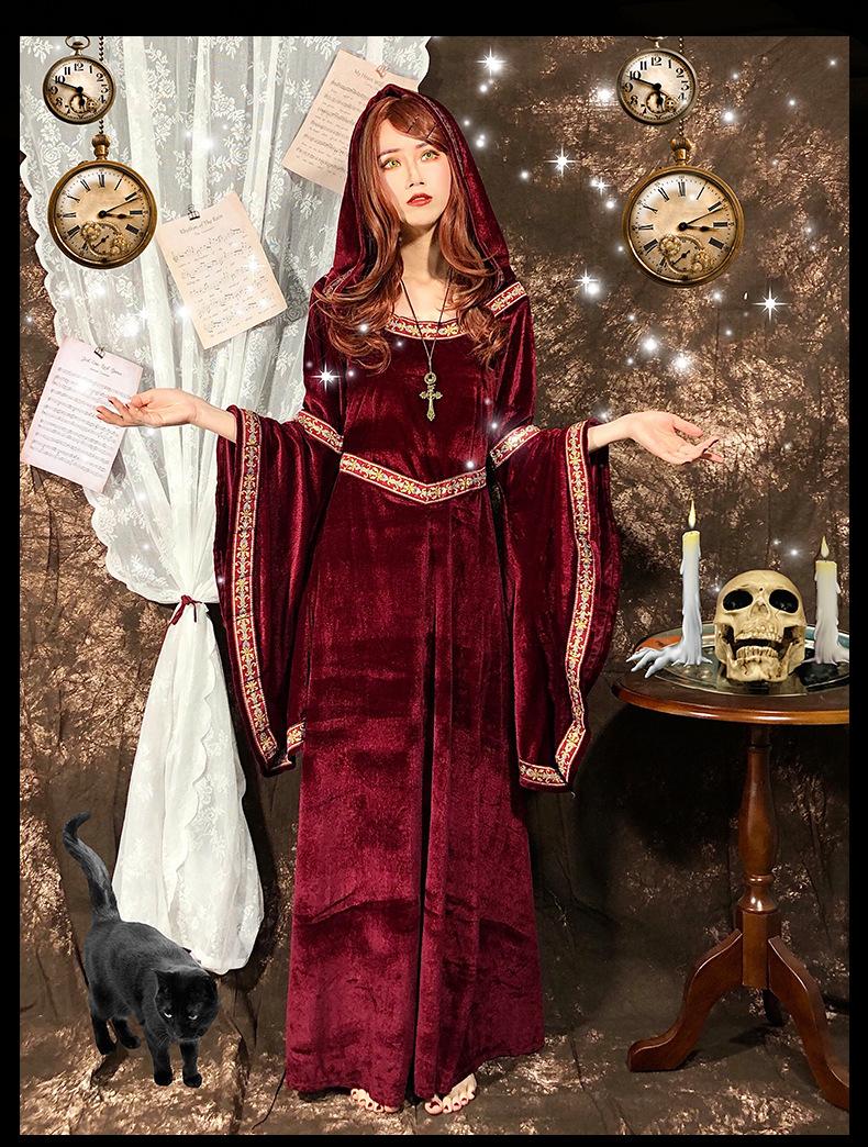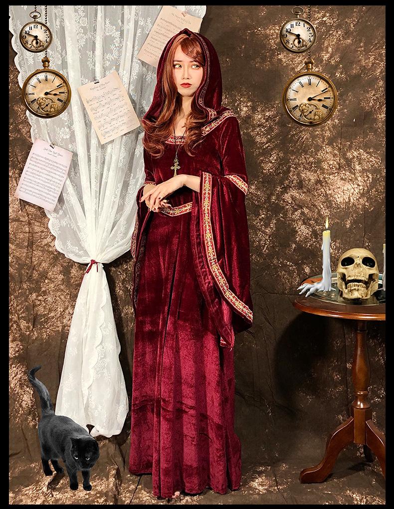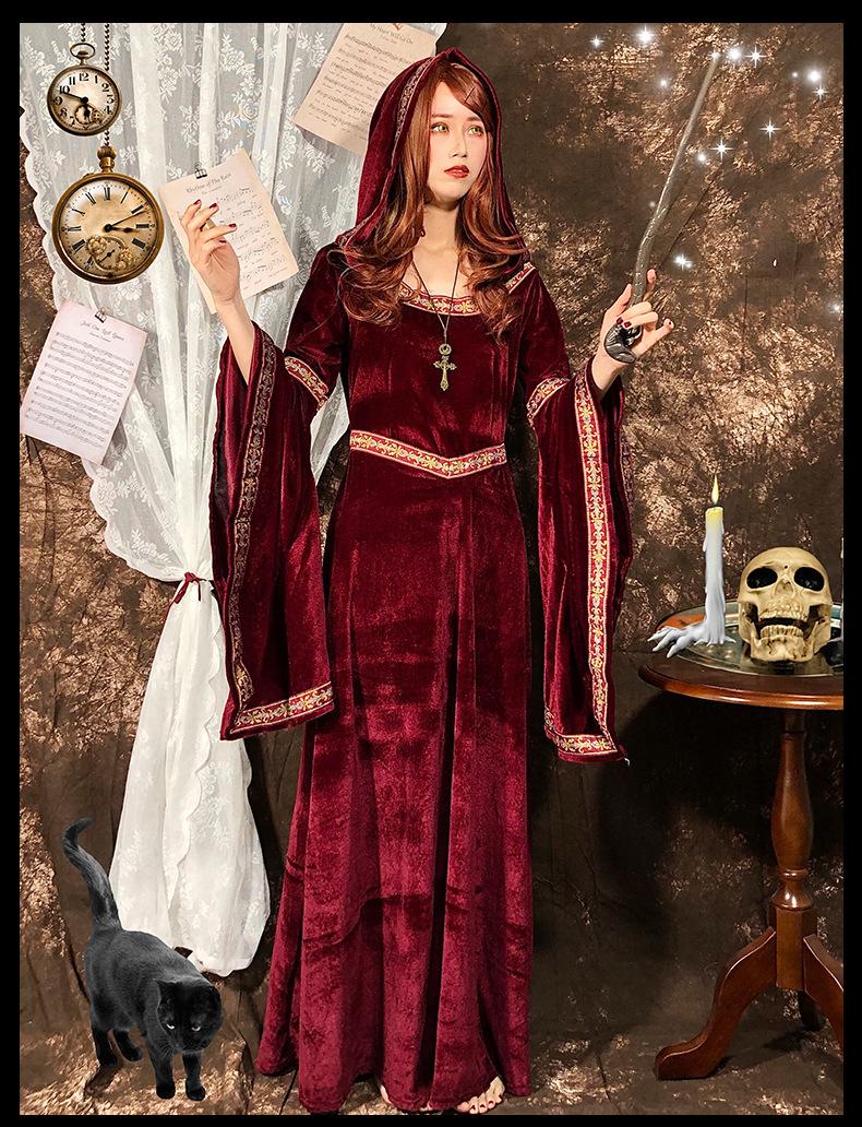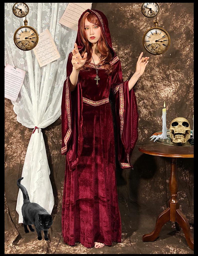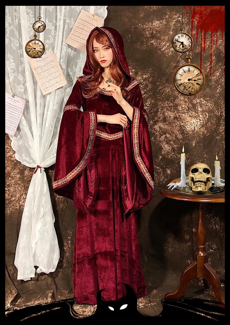 Disfraz de Cosplay para Adulto de Halloween Novia Fantasma Roja Vampiro con Capucha Falda Larga Mago Bruja Bata