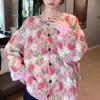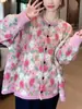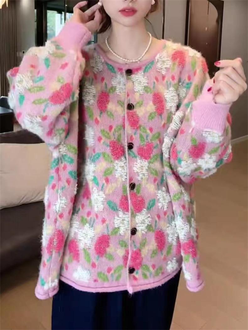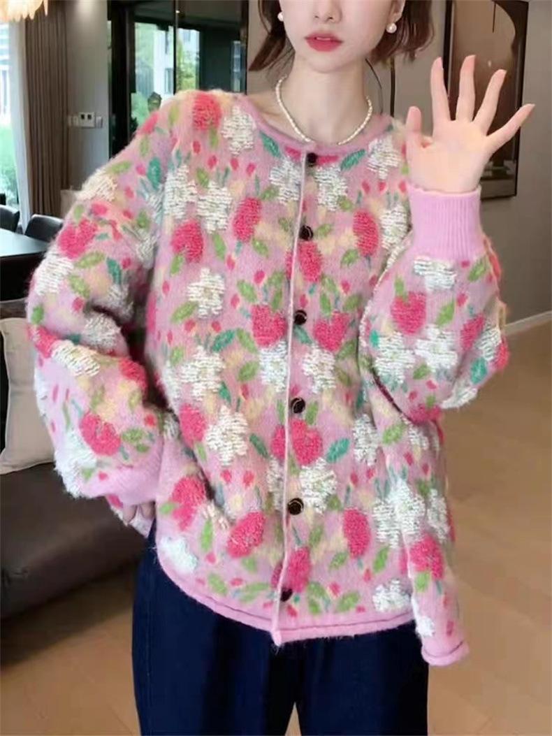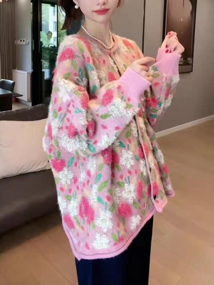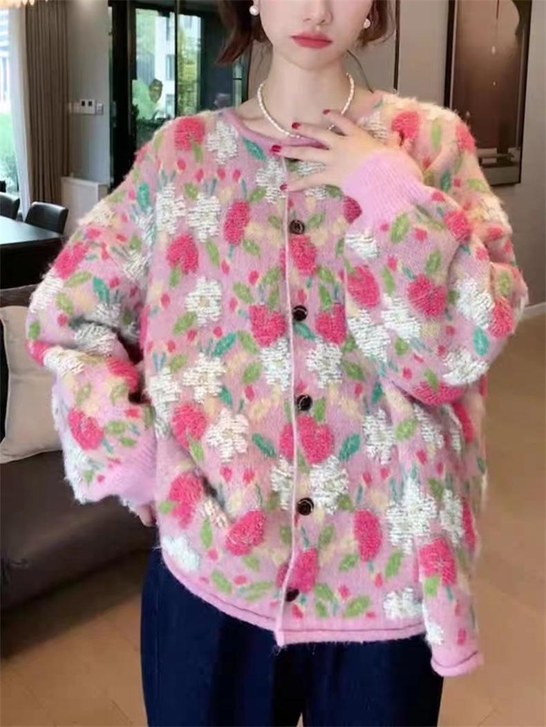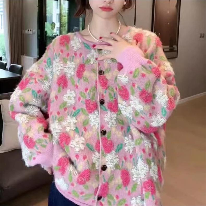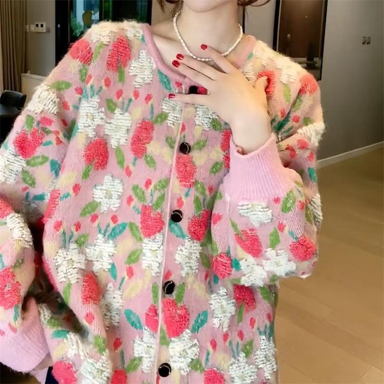 Suéter Chaqueta de Flores Rosadas Estilo Retro Holgazán de Nuevo Estilo Japonés y Coreano para Mujer Cárdigan Tejido Dulce Suelto Delicado para Mujer