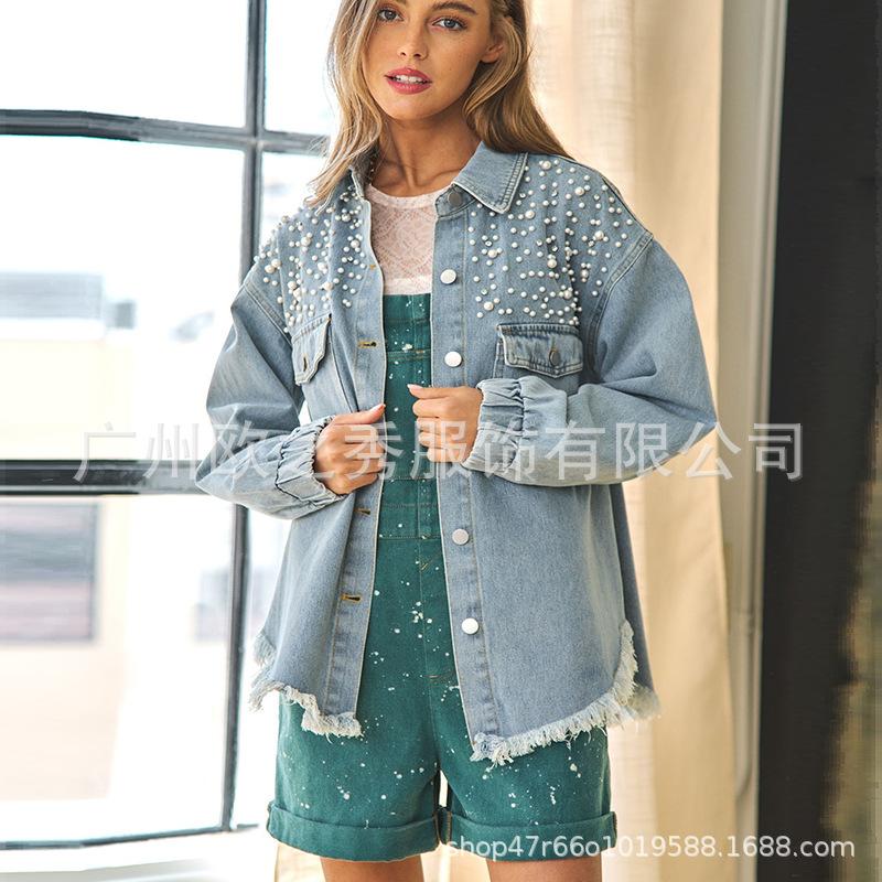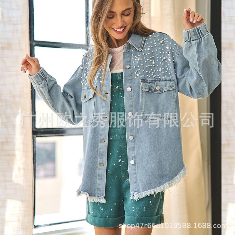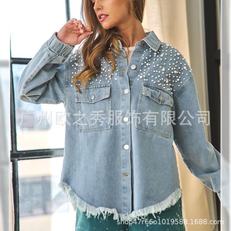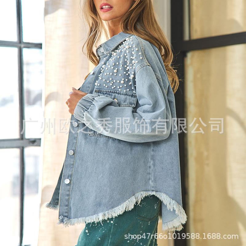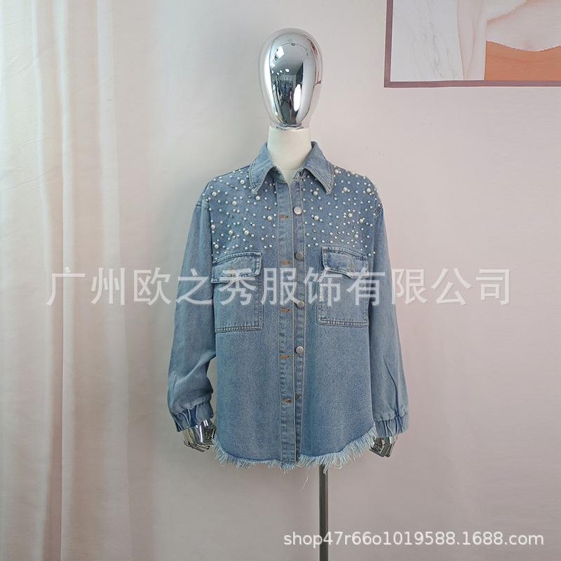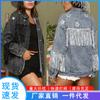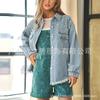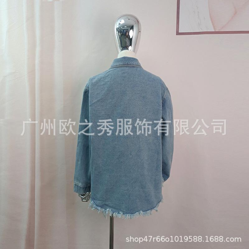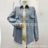 Independent Station 2025 Camisa Chaqueta Otoño Transfronteriza Solapa Suelta Orilla Deshilachada Borla Abalorios Doble Bolsillo con Solapa Pantalones Chaqueta de Mezclilla