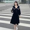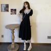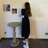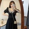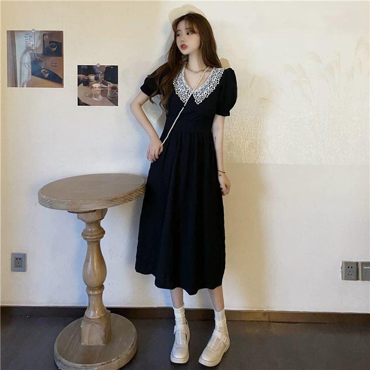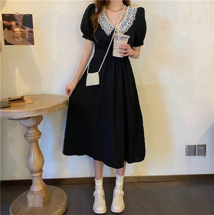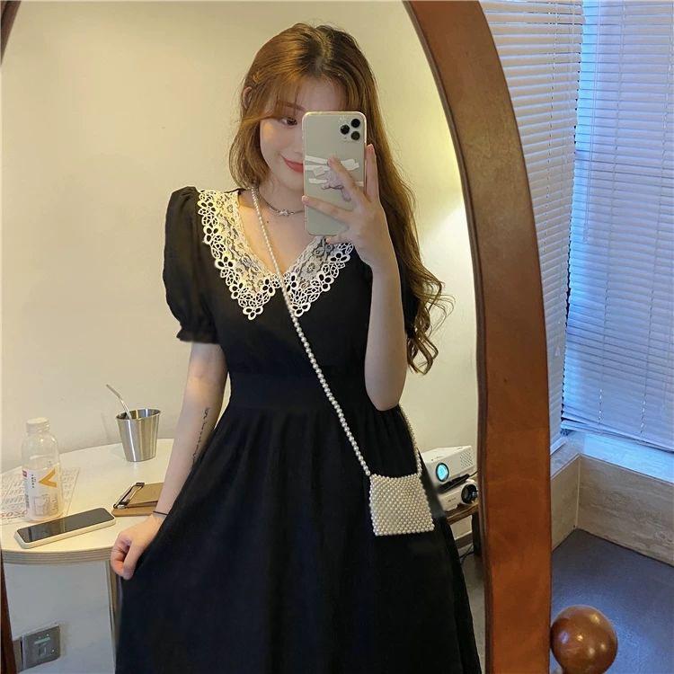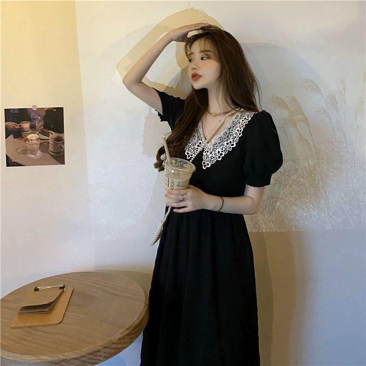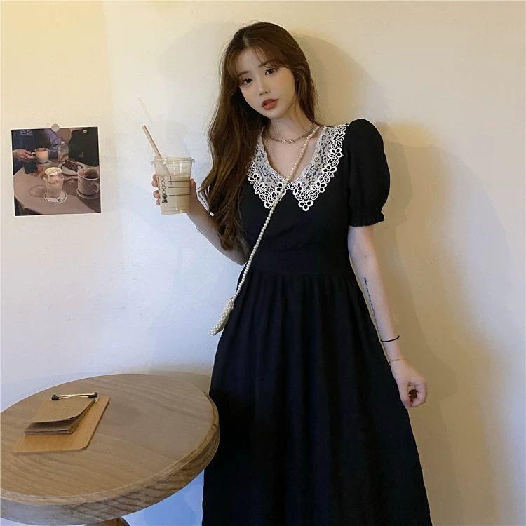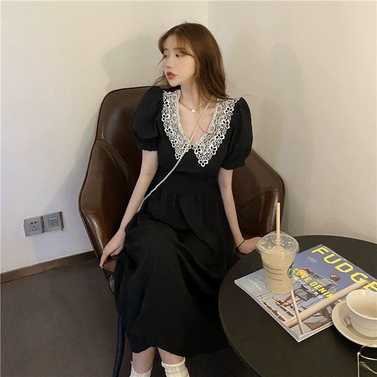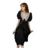 Vestido ajustado estilo Hepburn con mangas abullonadas y cintura ajustada, largo medio, cuello de muñeca, estilo francés, manga corta, negro.