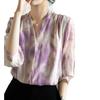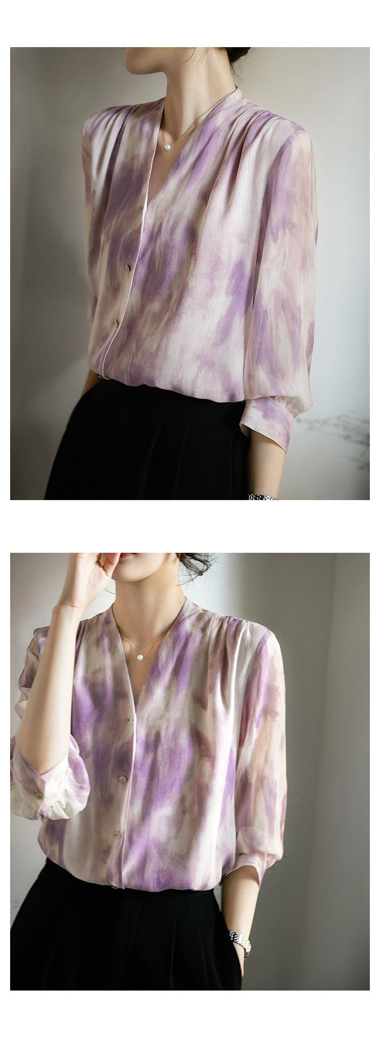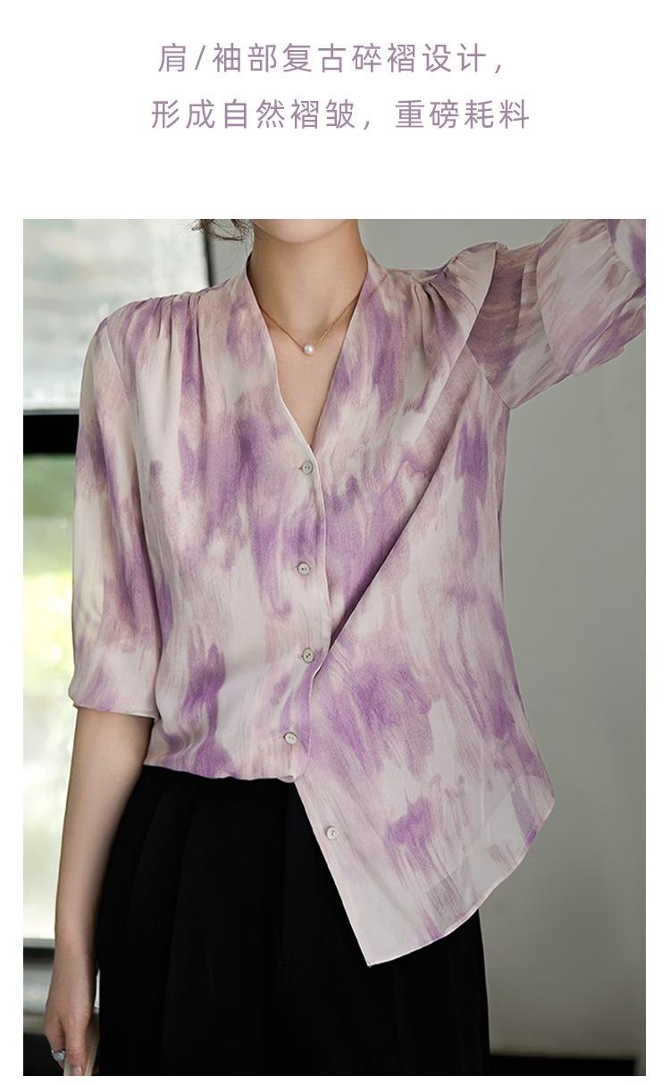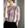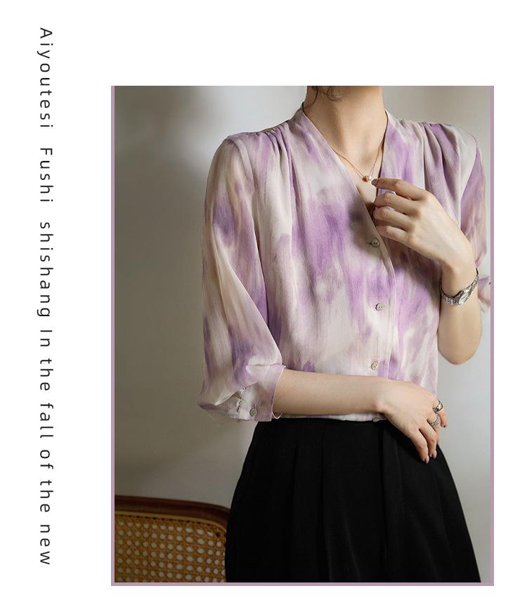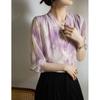 Camisa de Seda Francesa Morada Cuello en V Camisa de Seda de Morera Pesada de Doble Capa Verano 2025 Top Estampado para Mujer