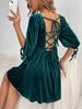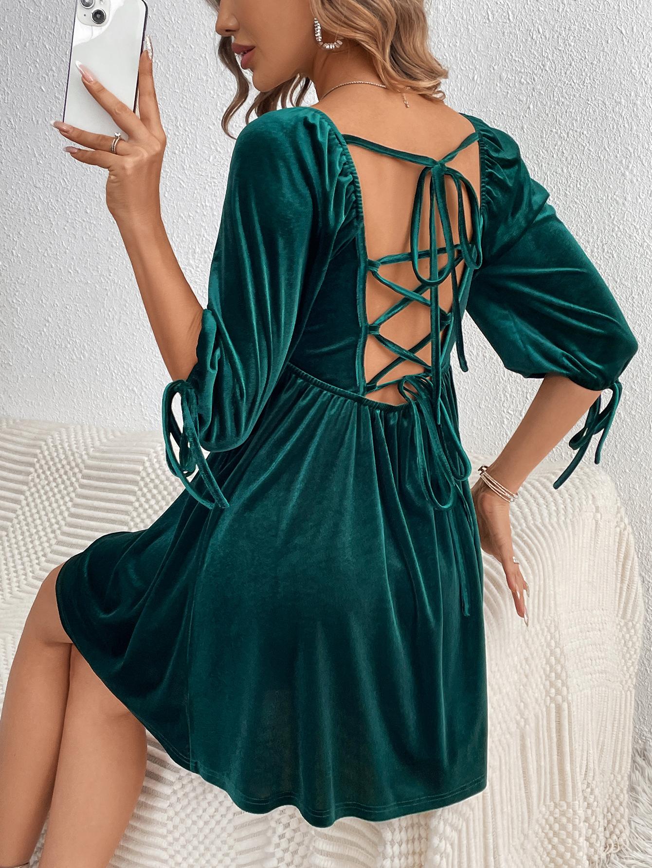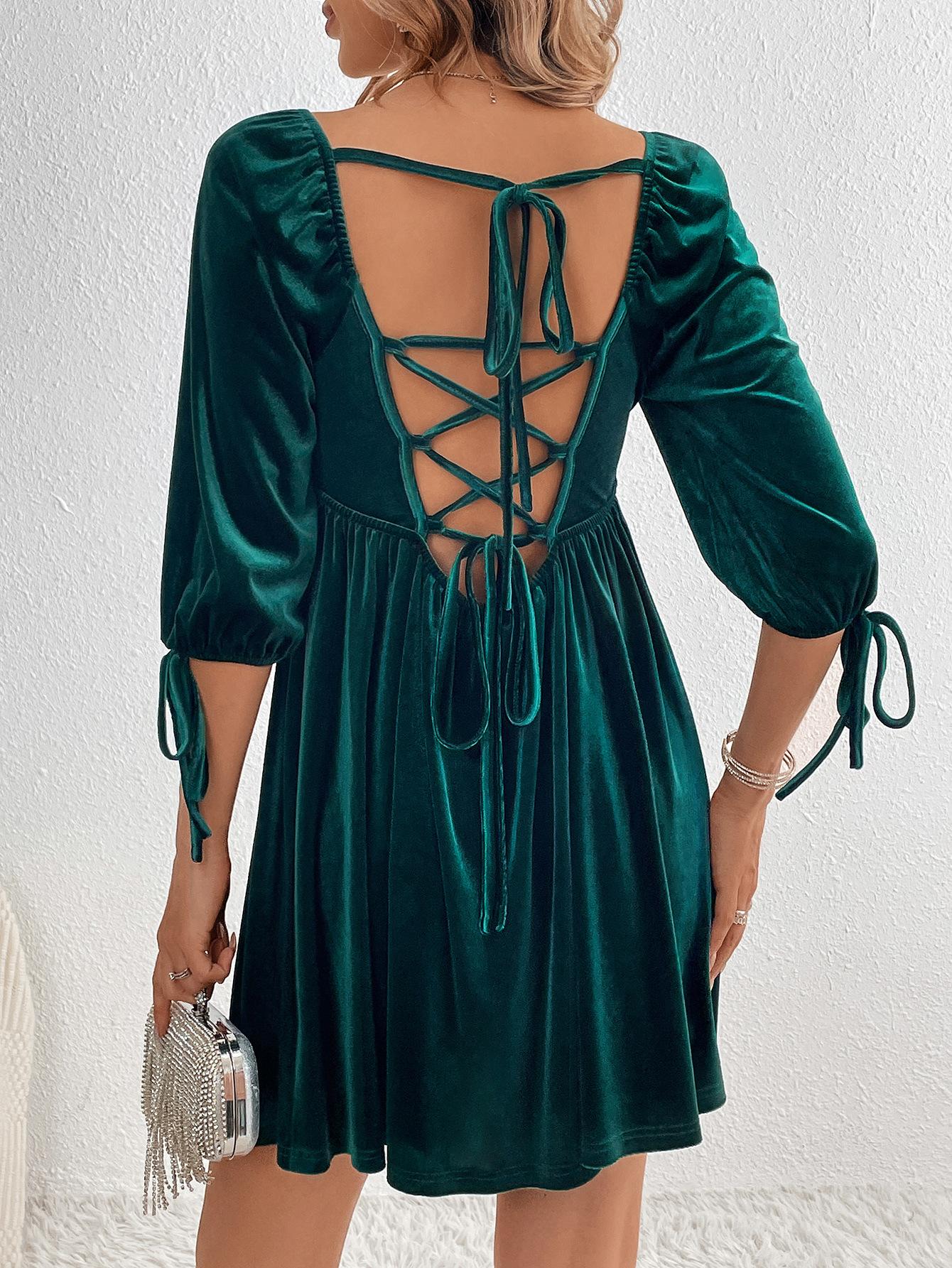 Falda estilo jersey de cintura alta con cordones en la espalda, estilo europeo y americano, para mujer, de fiesta, de terciopelo, con cuello cuadrado grande, a la moda, 2024