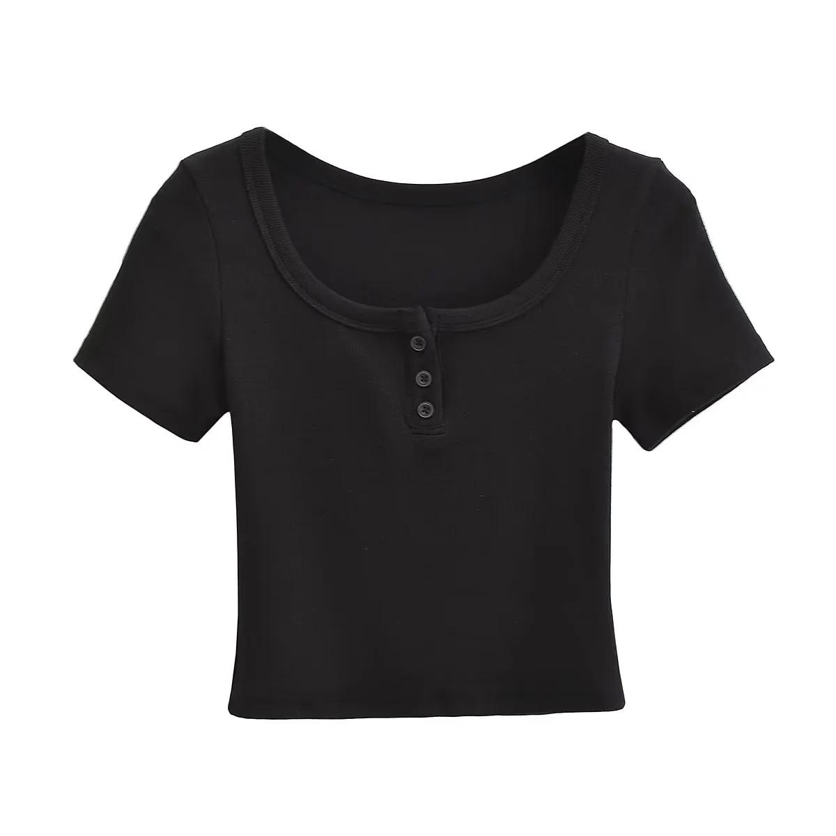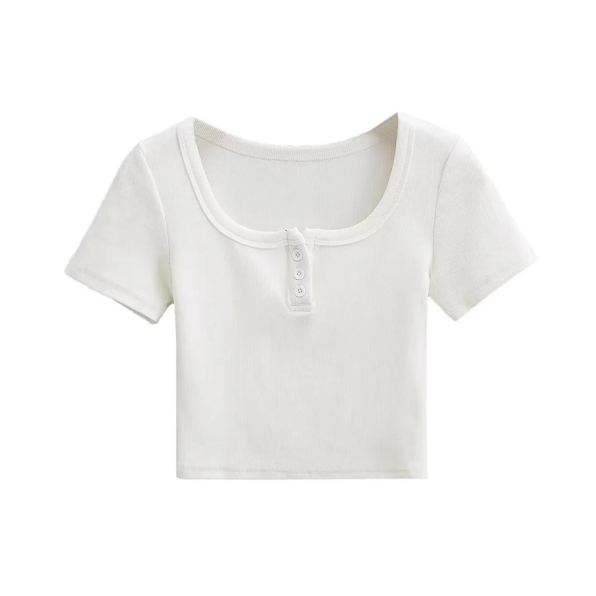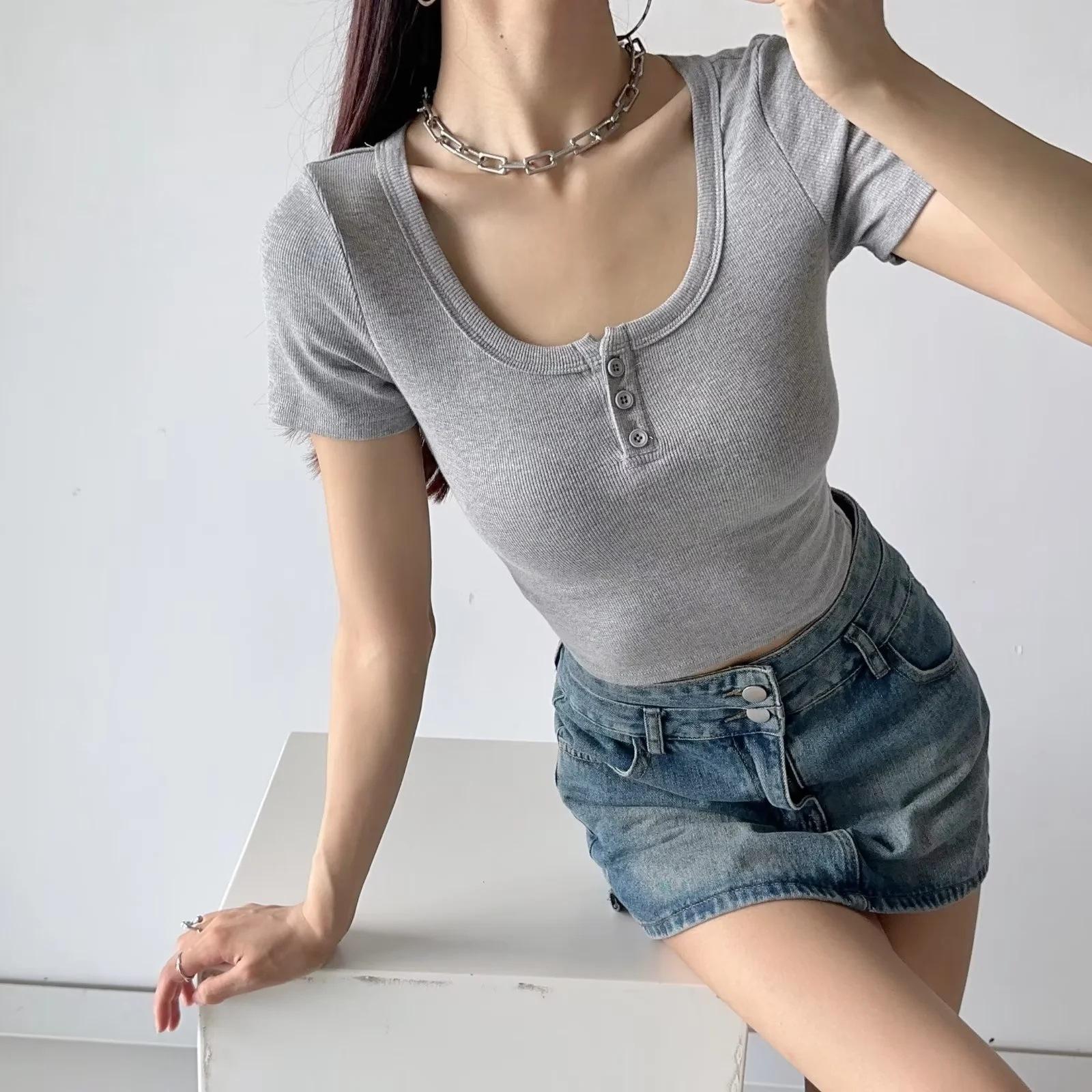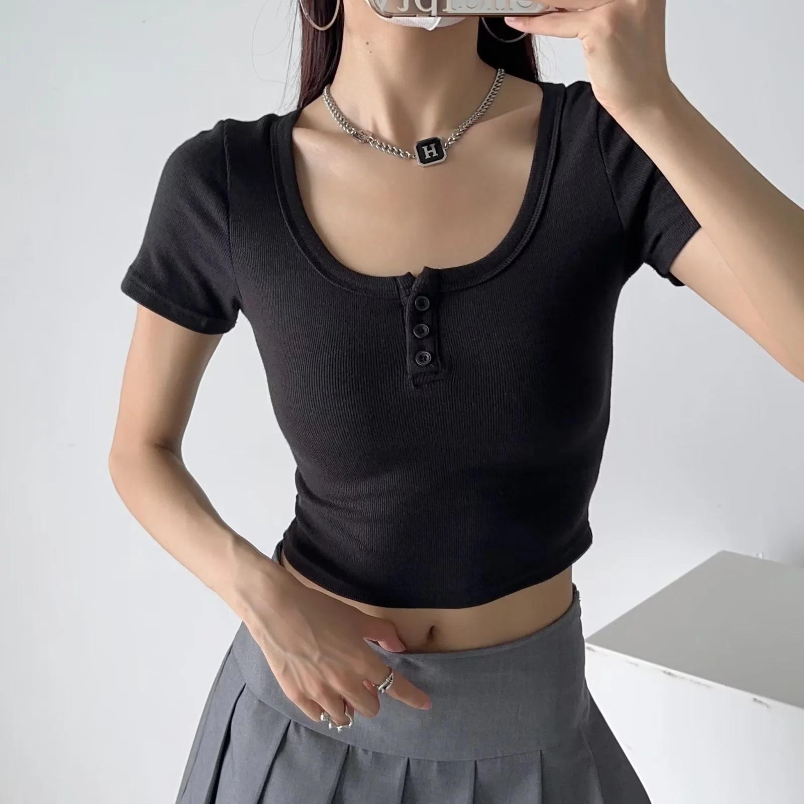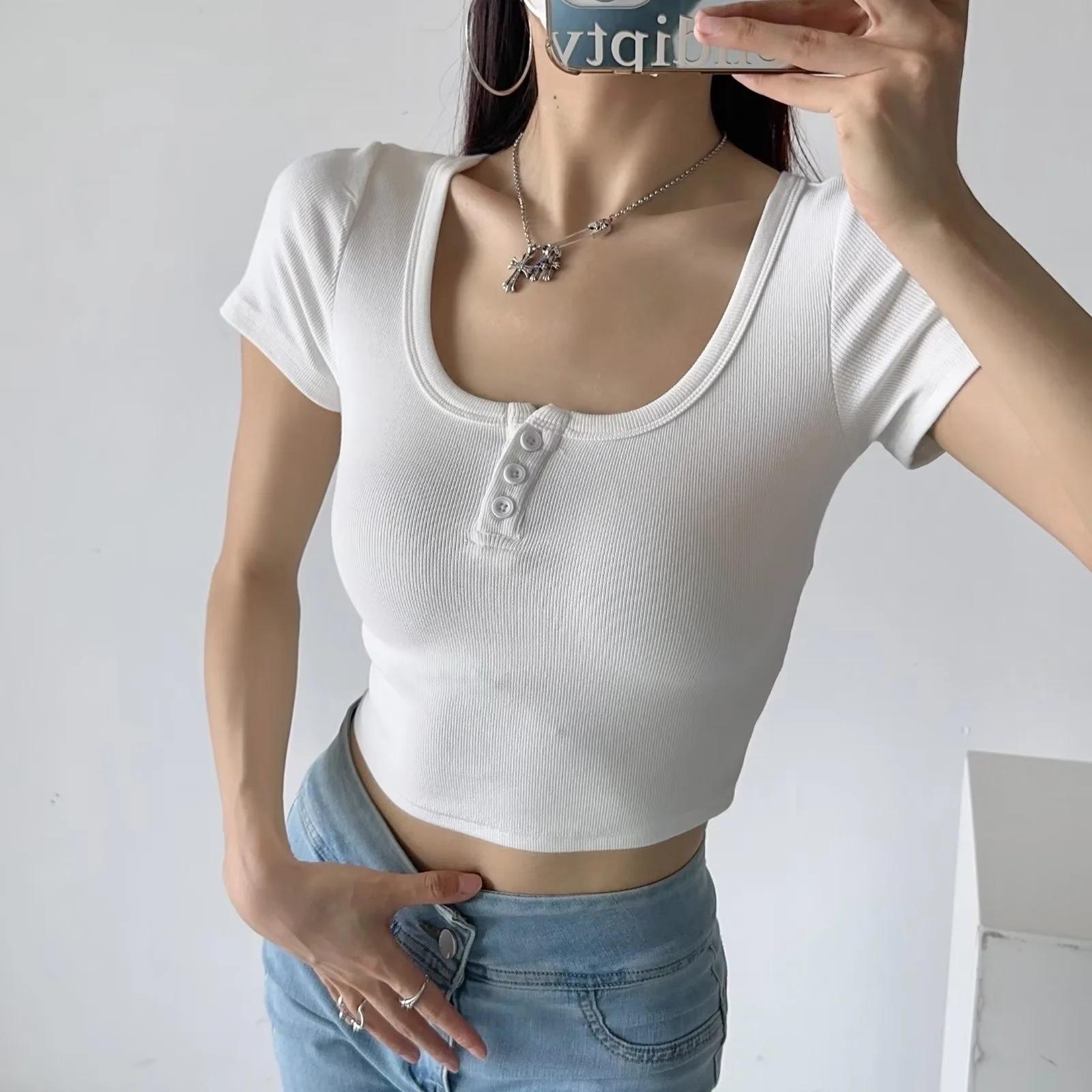 Camiseta de manga corta elástica con botones y cuello en U para mujer, camisa básica de color liso con hombros descubiertos, otoño 2023, top corto