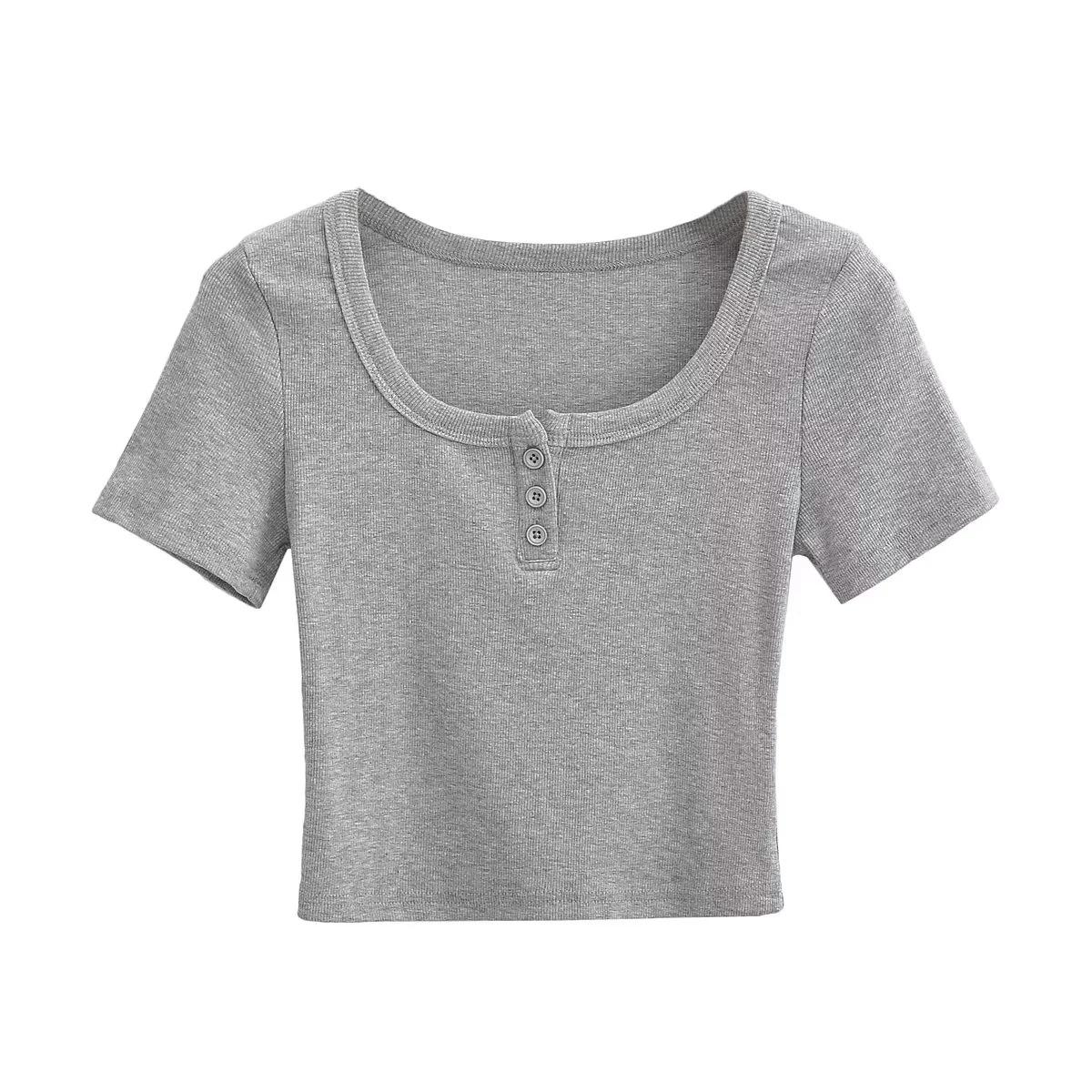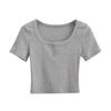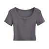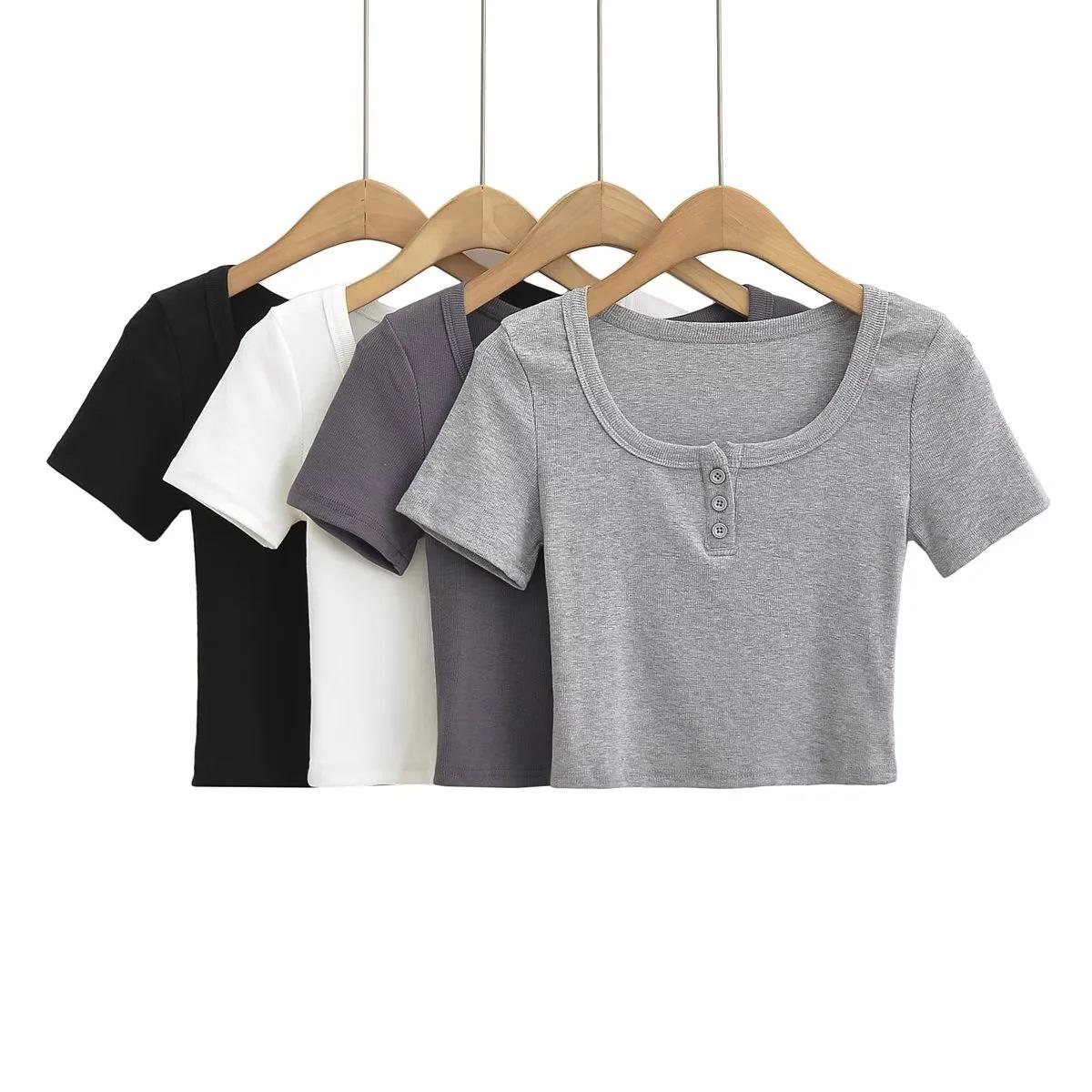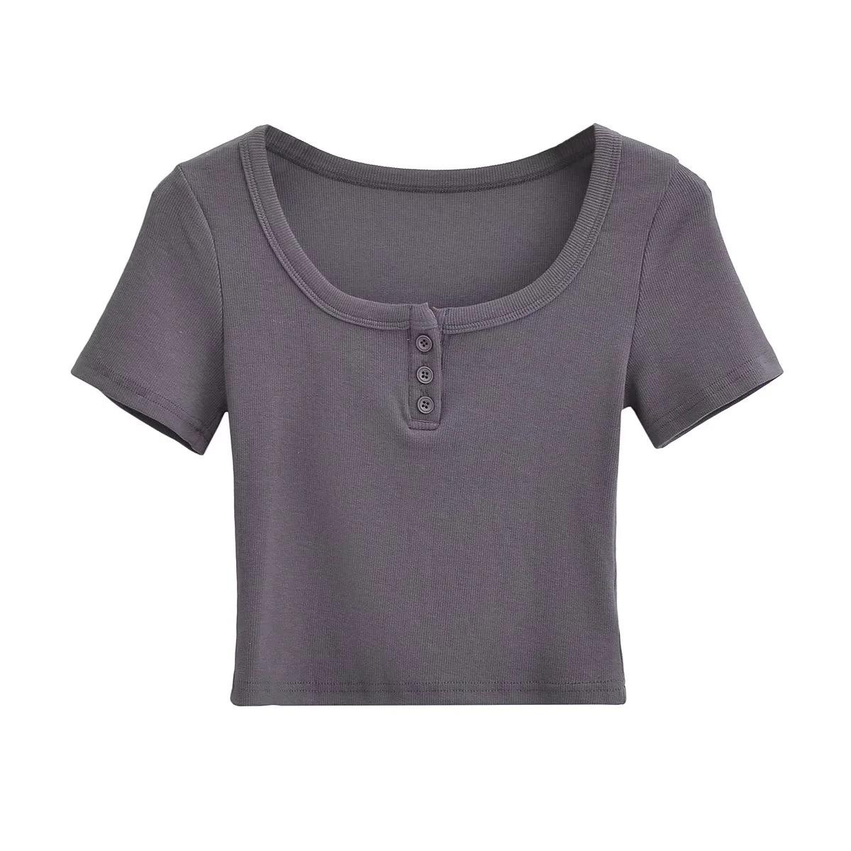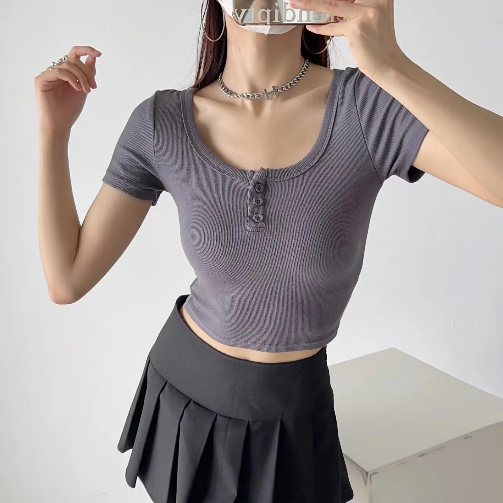 Camiseta de manga corta elástica con botones y cuello en U para mujer, camisa básica de color liso con hombros descubiertos, otoño 2023, top corto