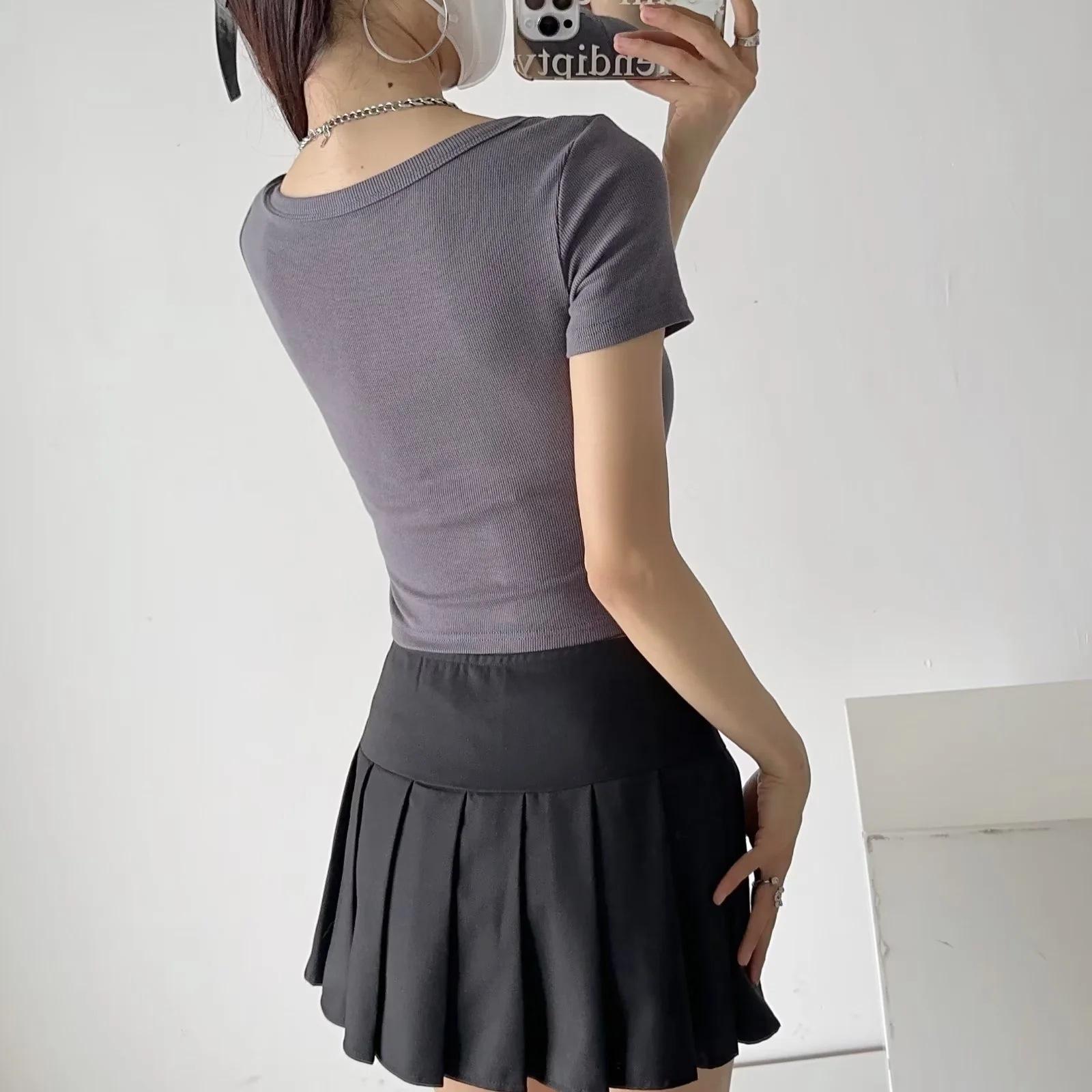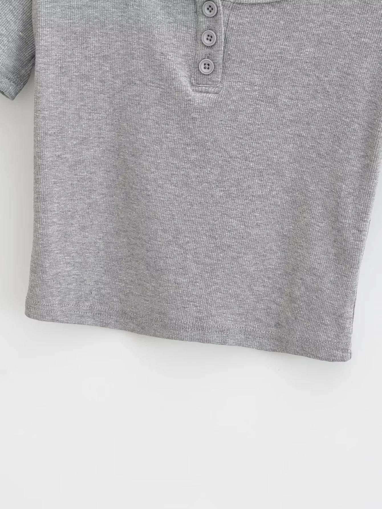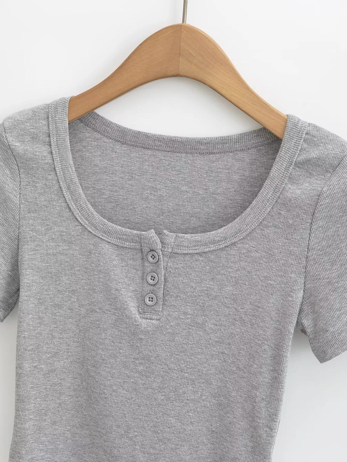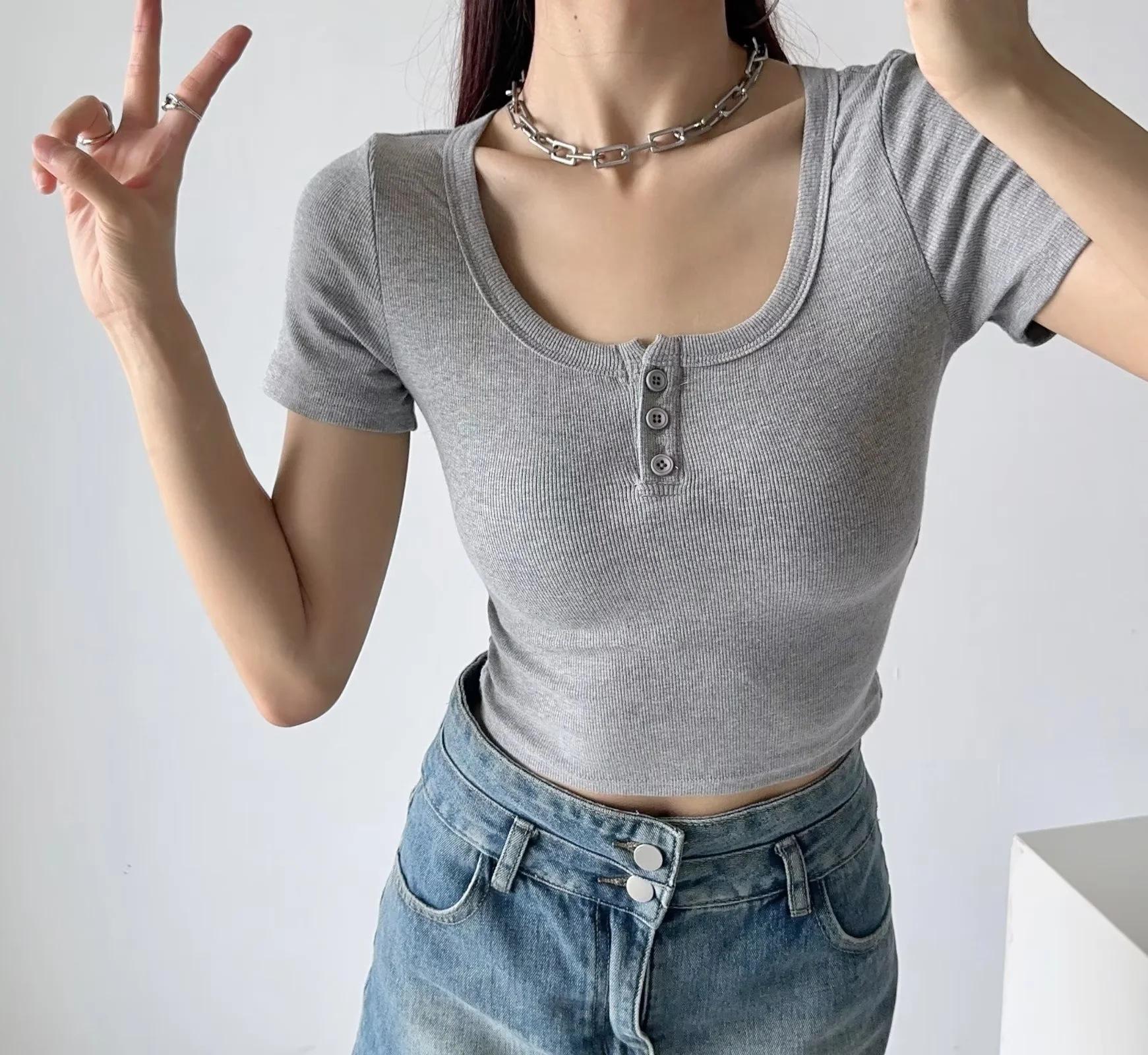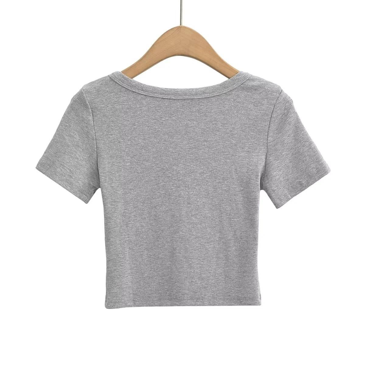 Camiseta de manga corta elástica con botones y cuello en U para mujer, camisa básica de color liso con hombros descubiertos, otoño 2023, top corto