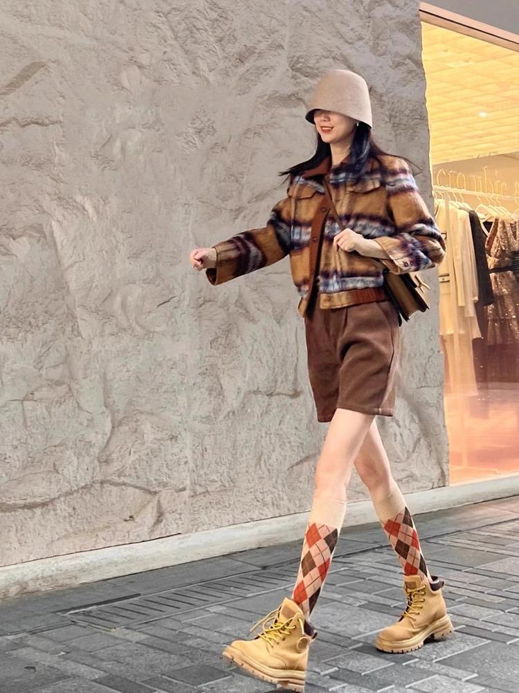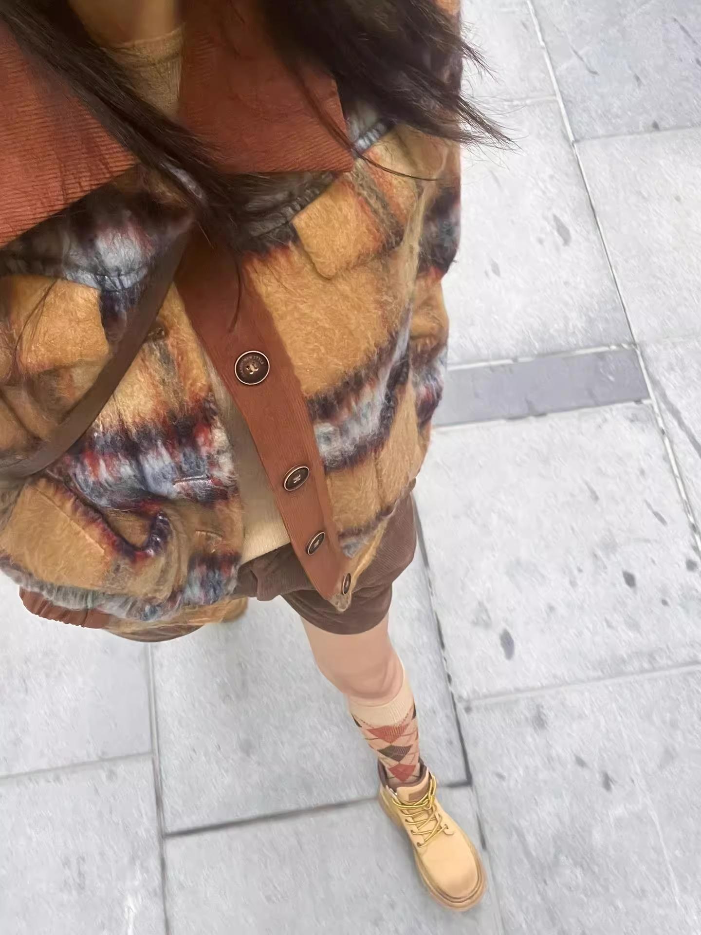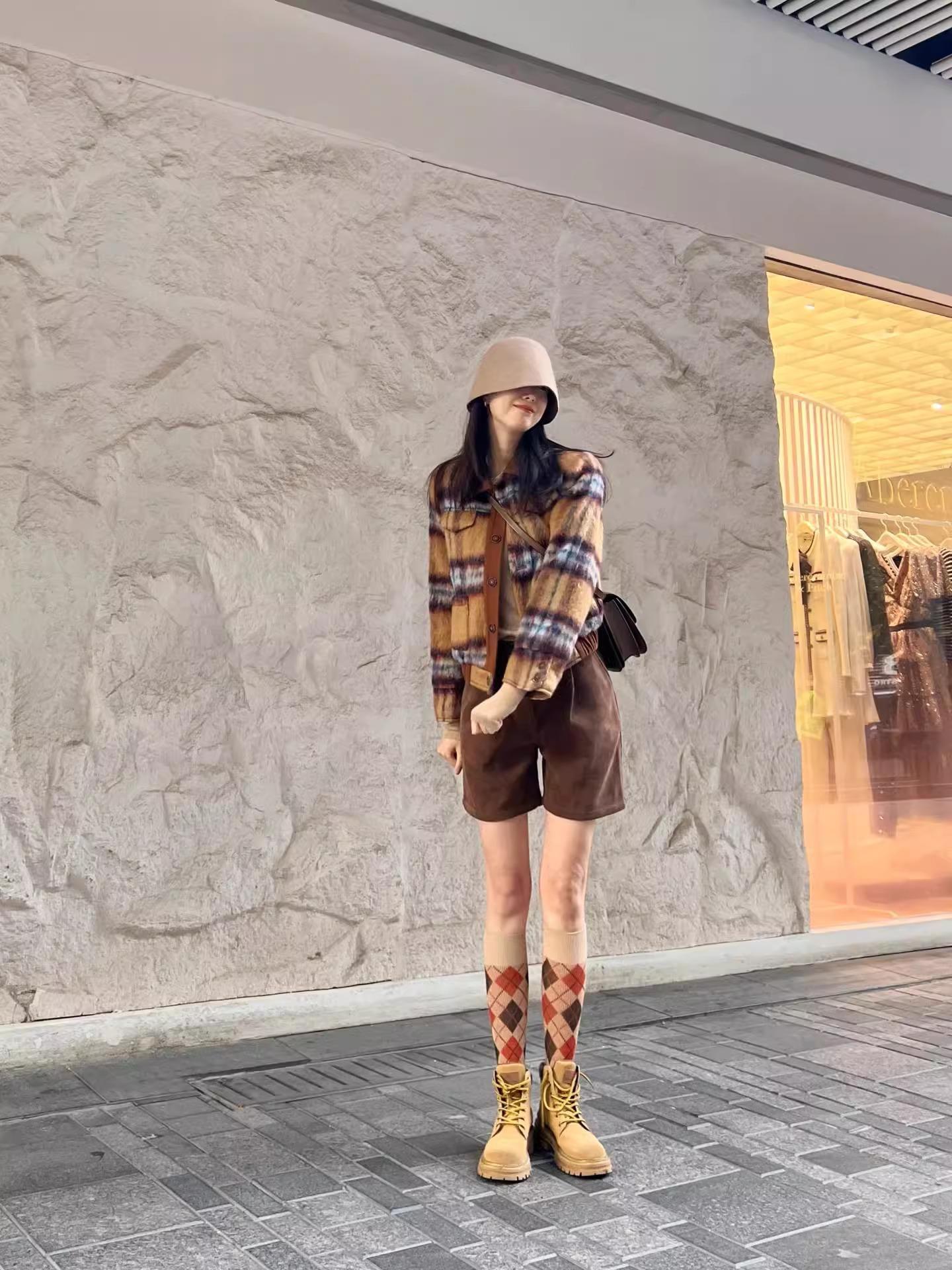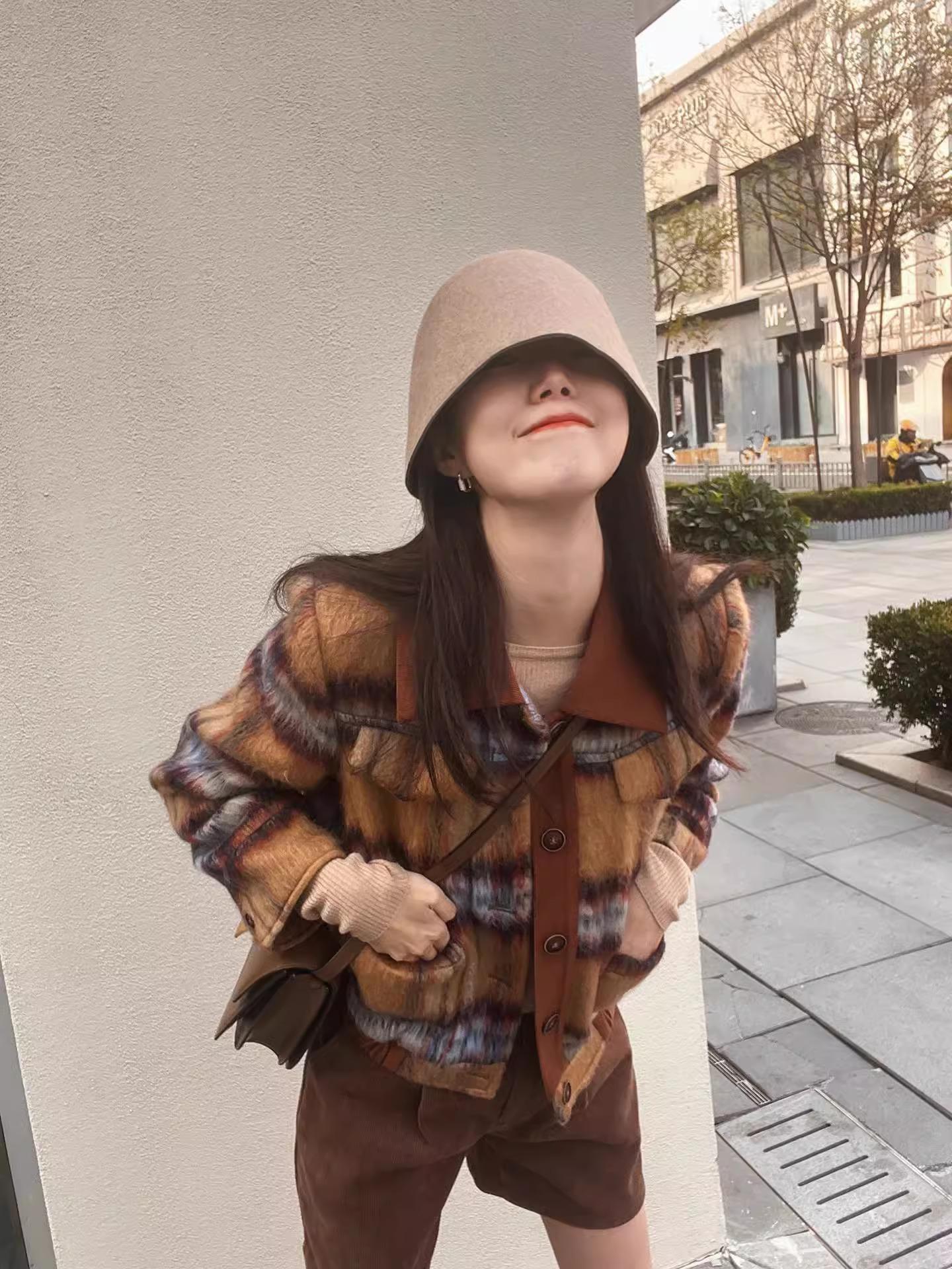 Abrigo de Cuadros Marrones Corto de Alta Gama para Personas Pequeñas, Nuevo Estilo Otoño e Invierno para Mujer 2023 Diseño Popular Tops Nicho