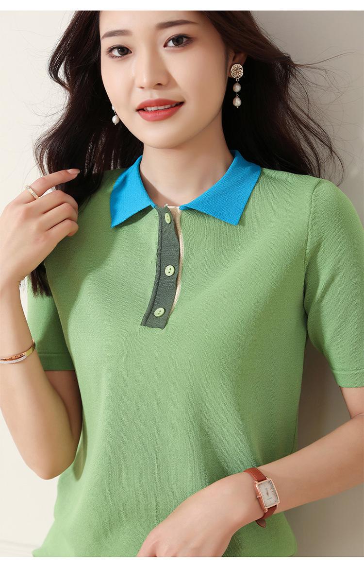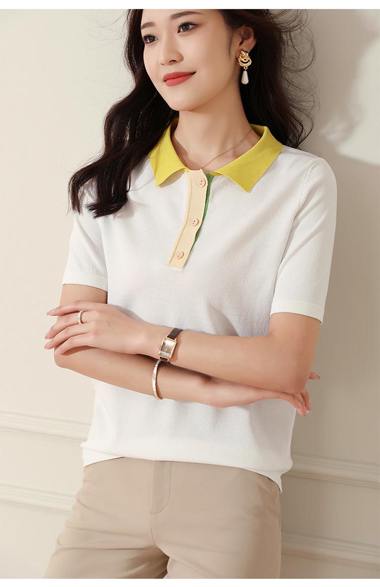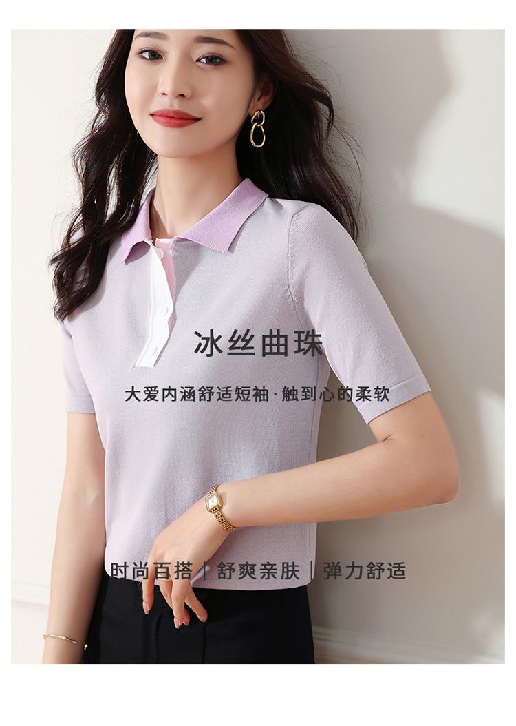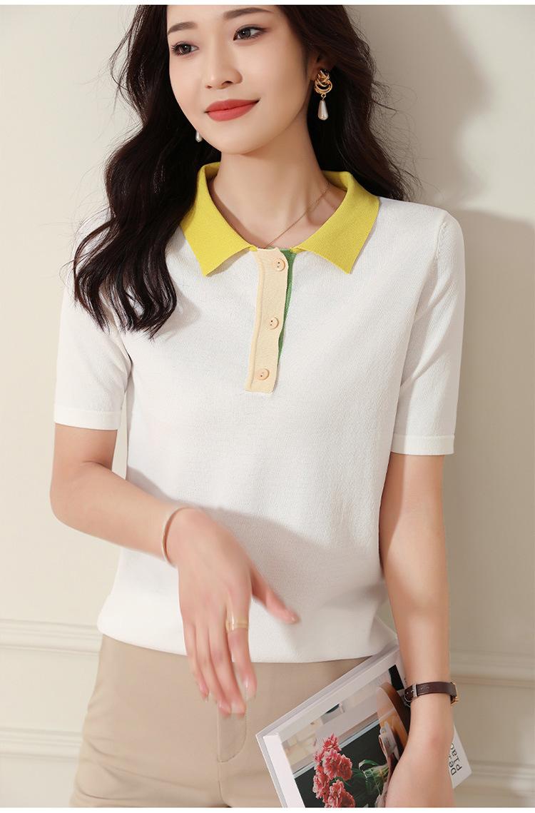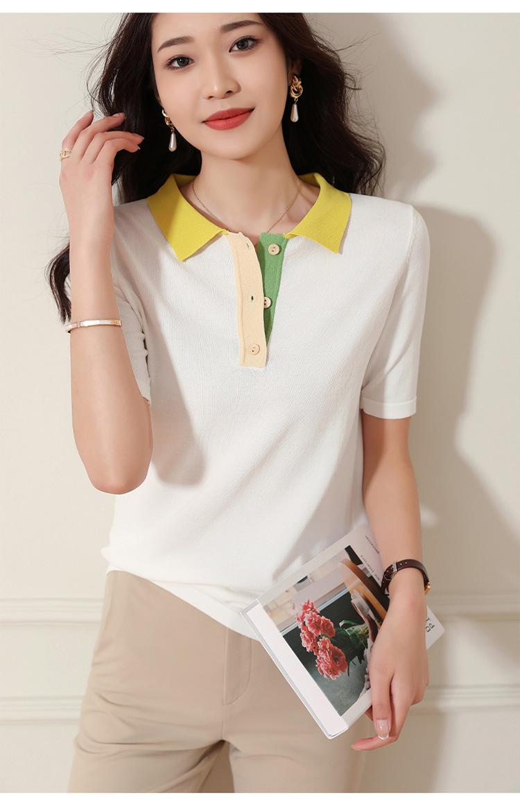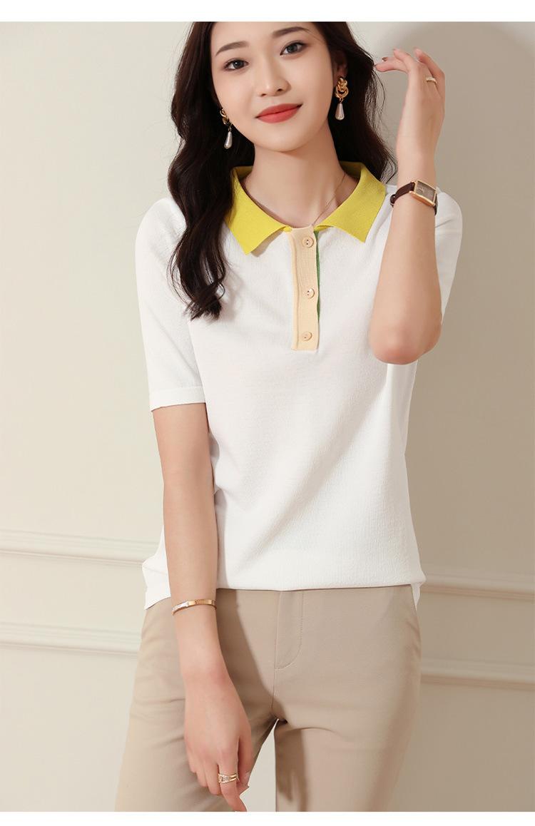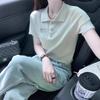 Camisa polo corta de seda de hielo, cuello base, diseño de verano para mujer 2023, corte entallado, estilo occidental, adelgazante, manga corta, color a juego.