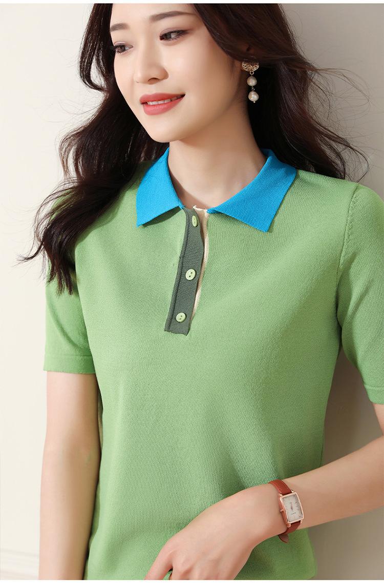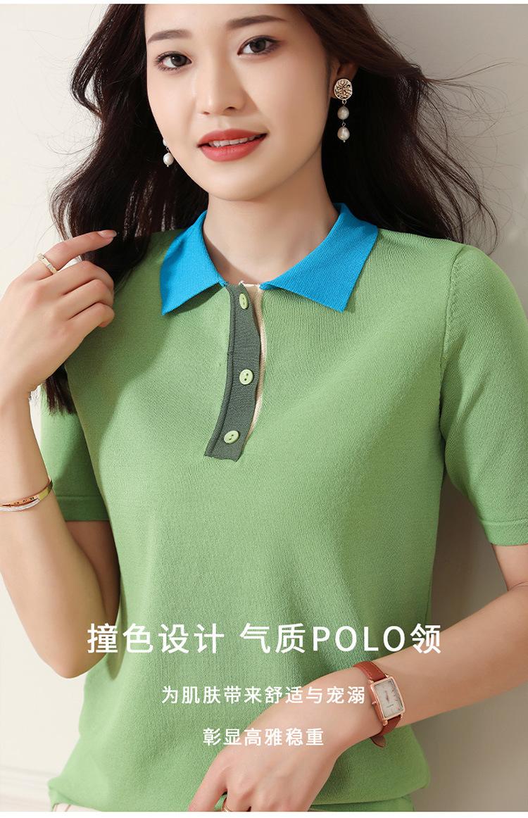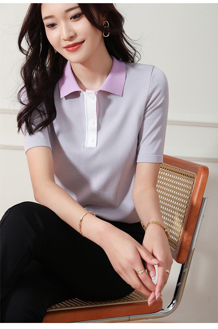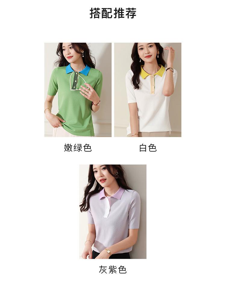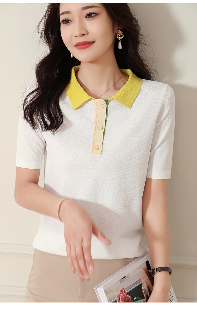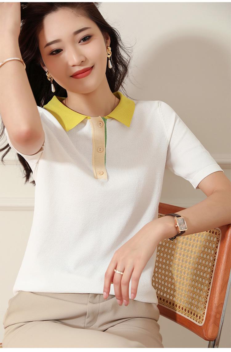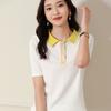 Camisa polo corta de seda de hielo, cuello base, diseño de verano para mujer 2023, corte entallado, estilo occidental, adelgazante, manga corta, color a juego.