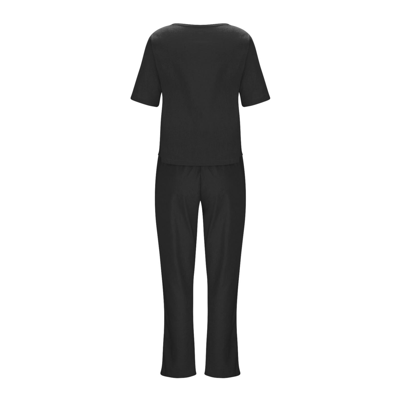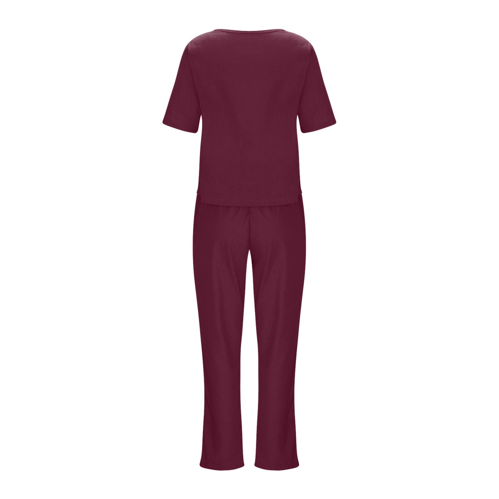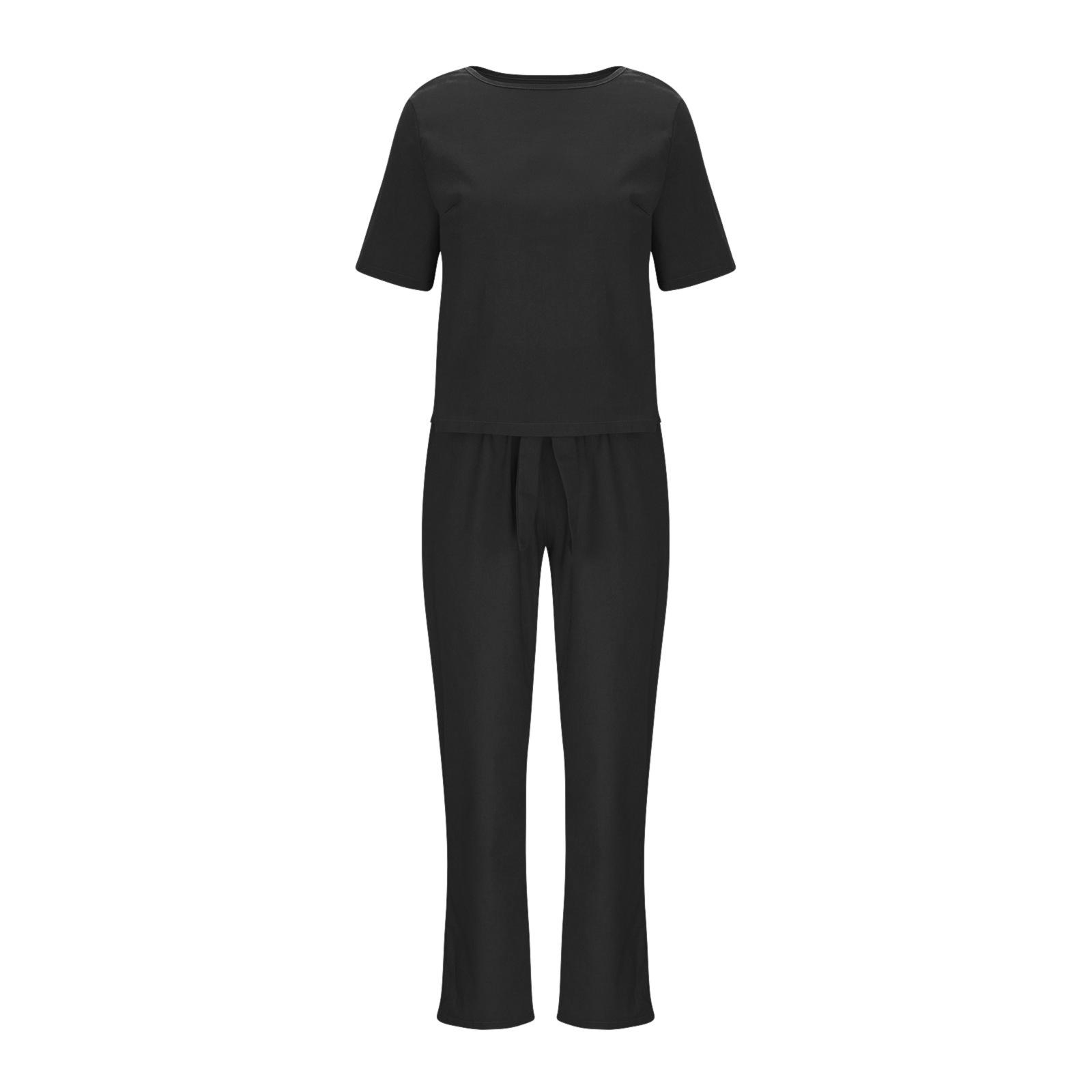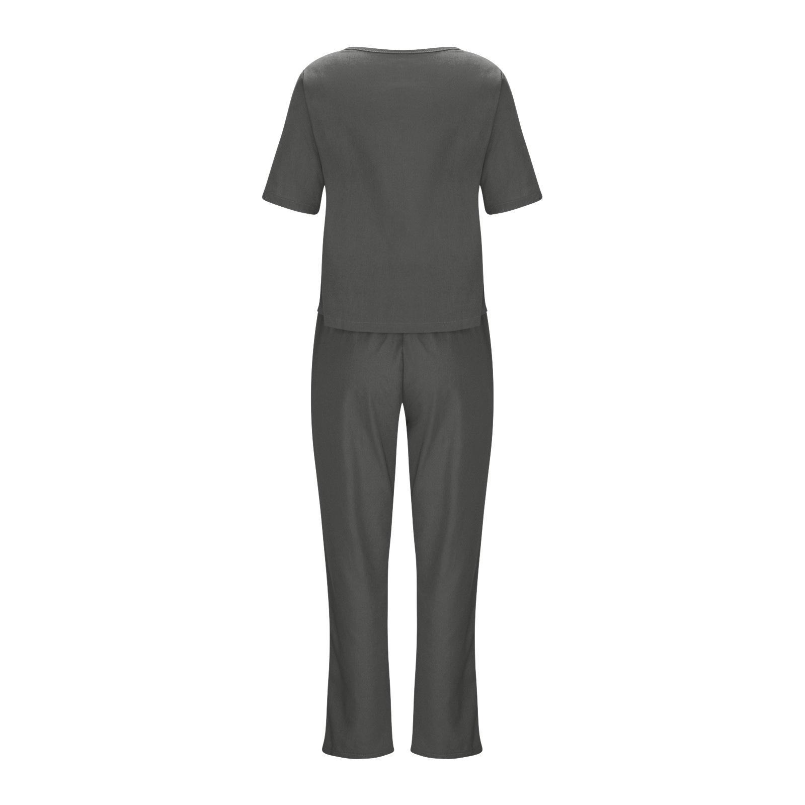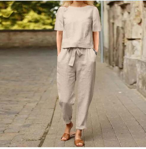Traje de verano de algodón y lino para mujer europea y americana, blusa de media manga con cuello redondo, pantalones anchos y conjunto retro para el hogar.