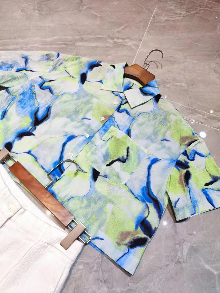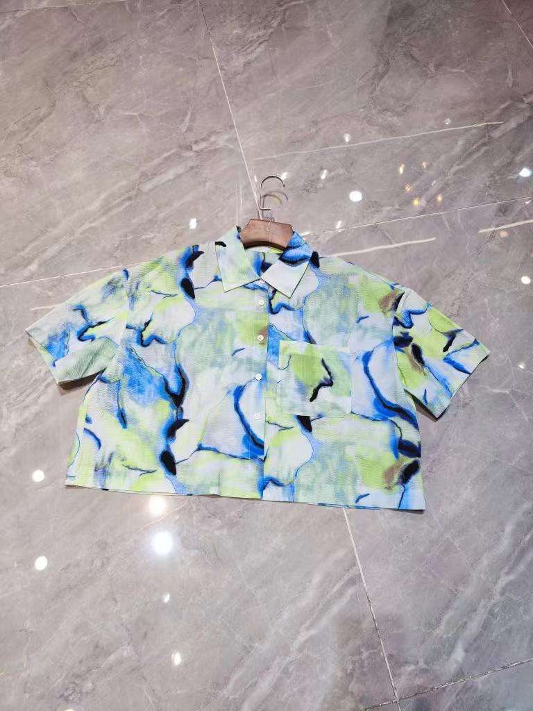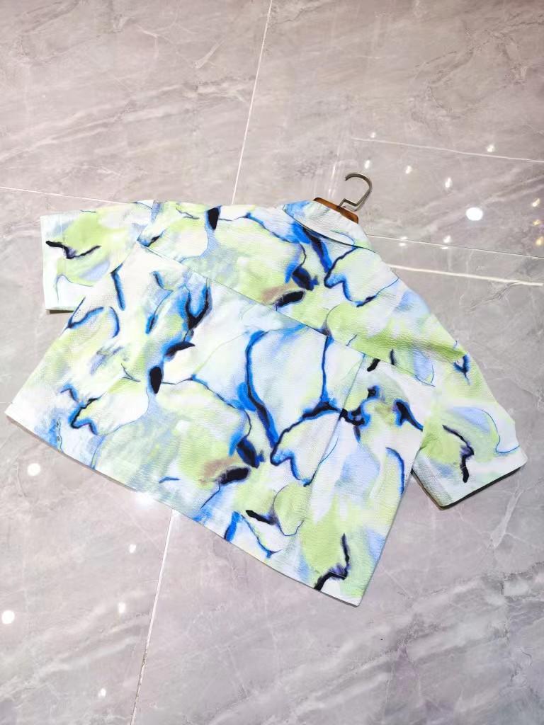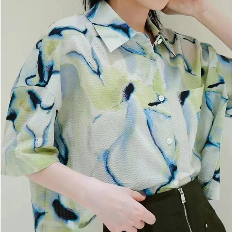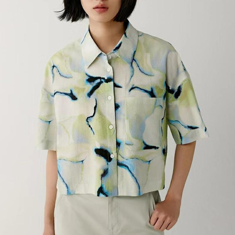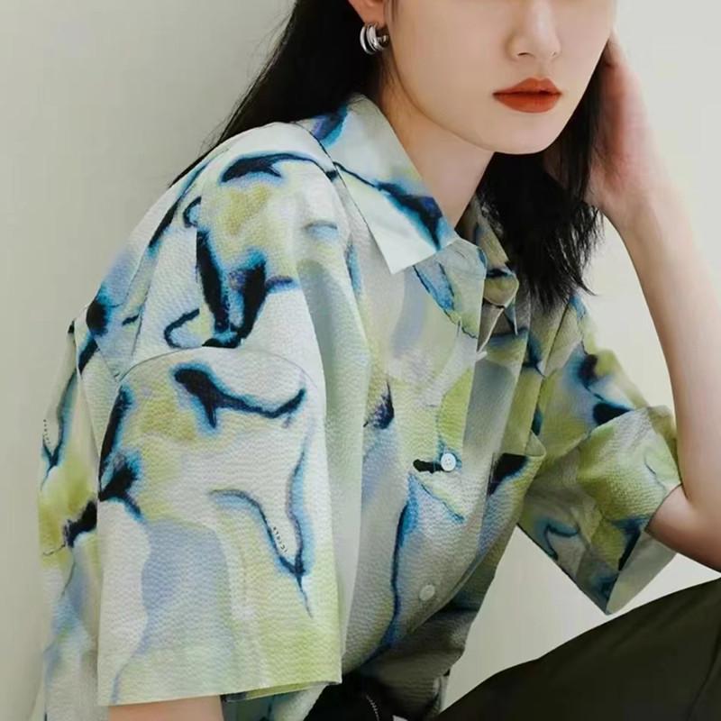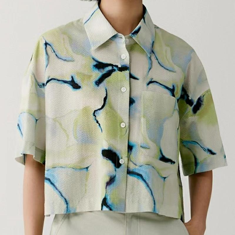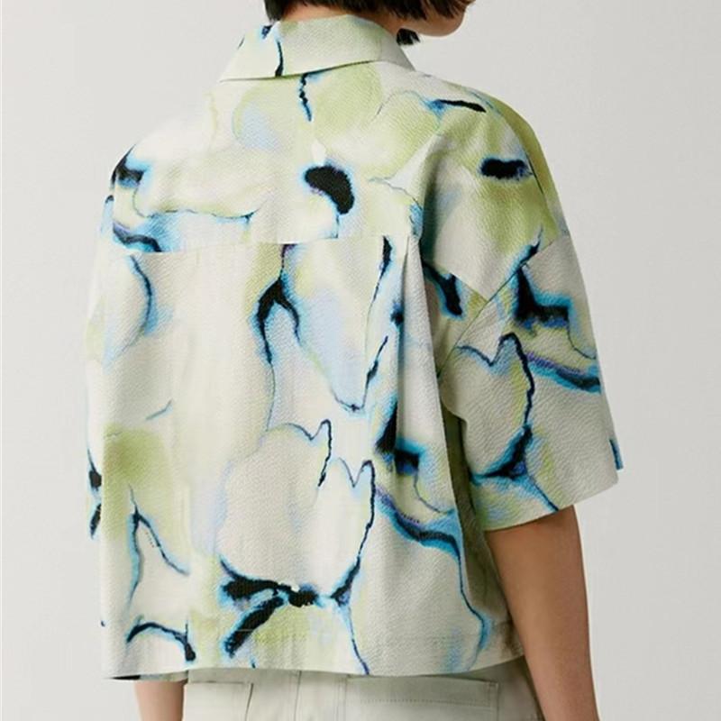 Hejia Ss Nueva Camisa de Verano de Manga Corta de Algodón Espumoso con Estampado Abstracto de Acuarela, Solapa Corta, Holgada, para Mujer