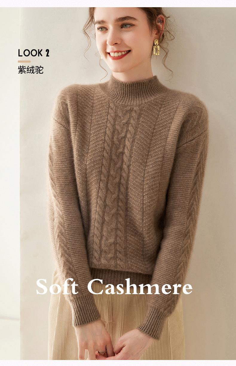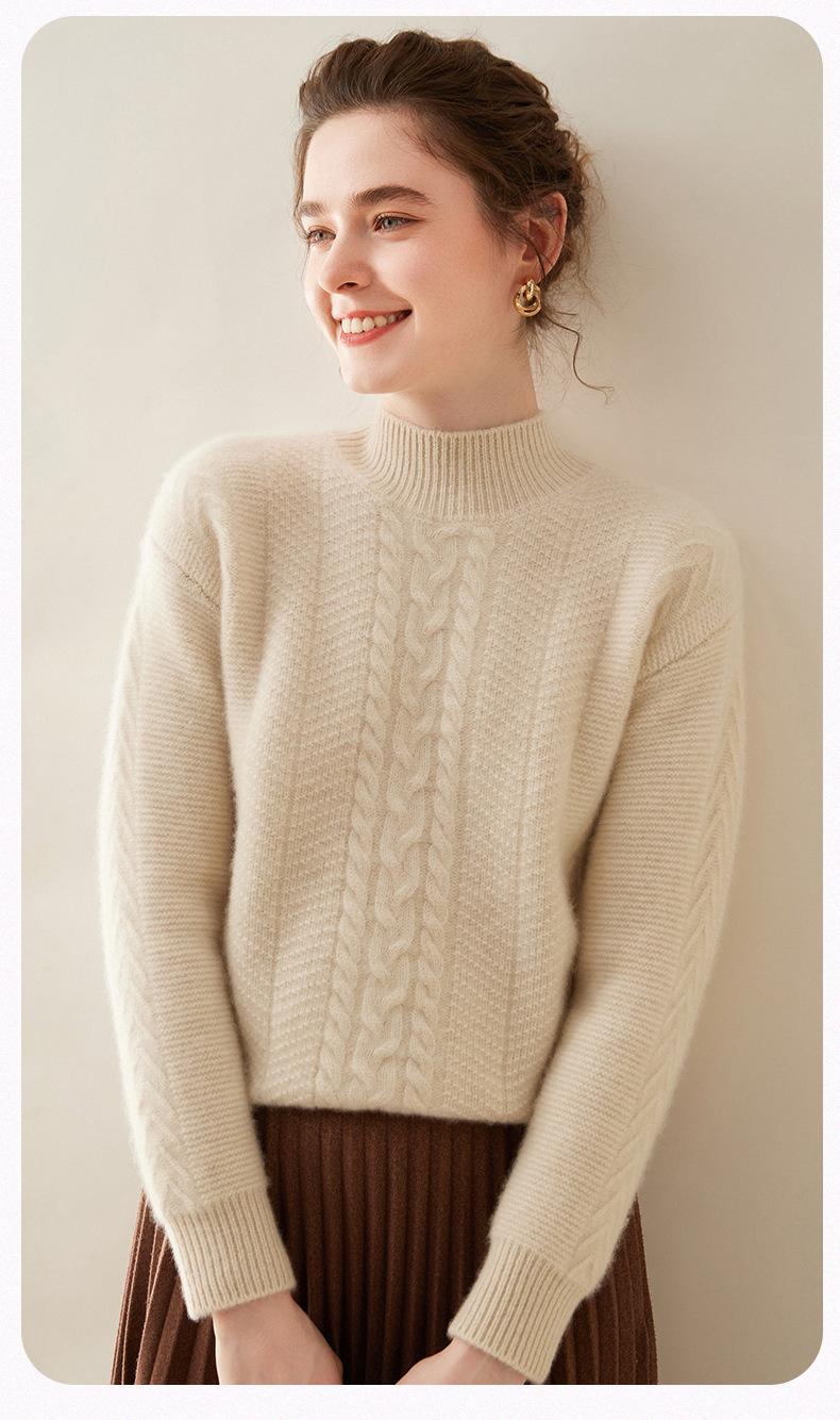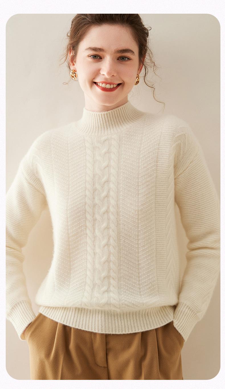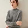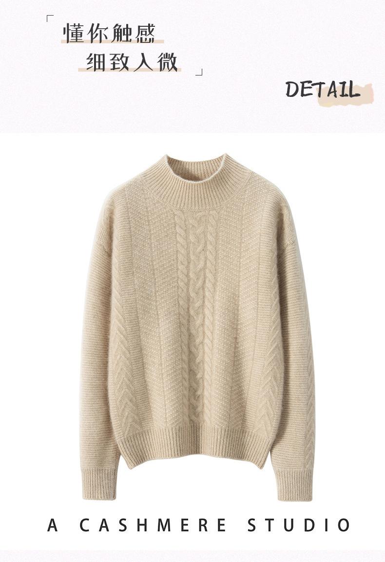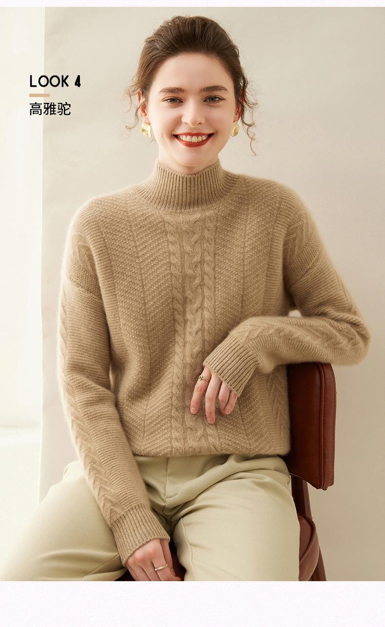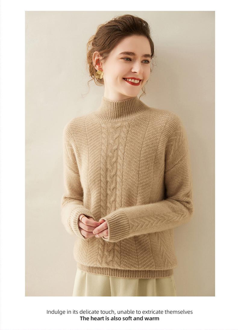 Suéter de Cachemira Grueso para Mujer 24 Otoño e Invierno Nuevo Color Puro Trenzado Cuello Alto Medio Jersey Estilo Holgazán Suéter Tejido Versátil