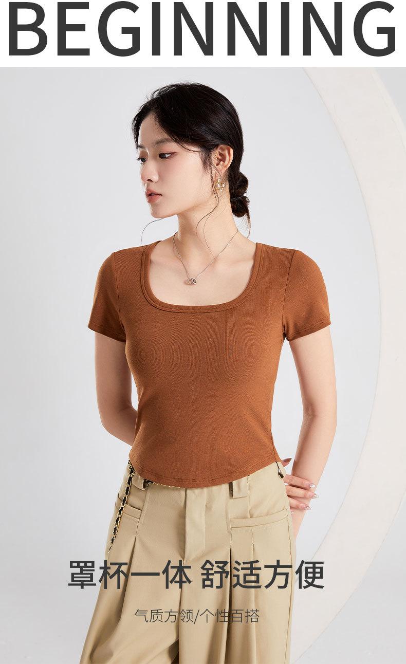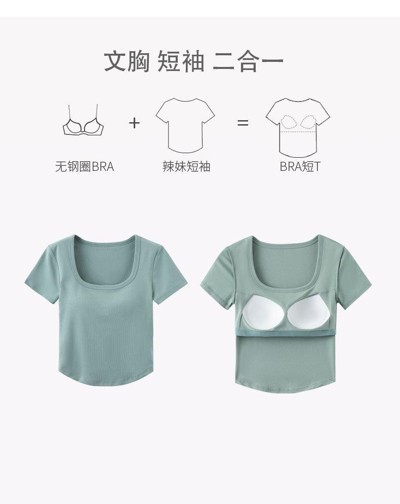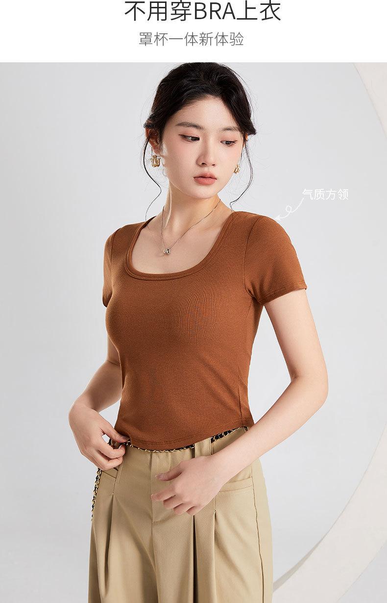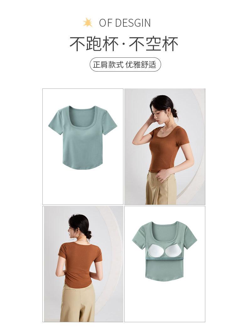 Primavera y Verano Nuevo Estilo Cuello Cuadrado con Almohadilla en el Pecho Camiseta de Manga Corta para Mujer Copa Todo en Uno Ajustada y Cómoda Top Casual