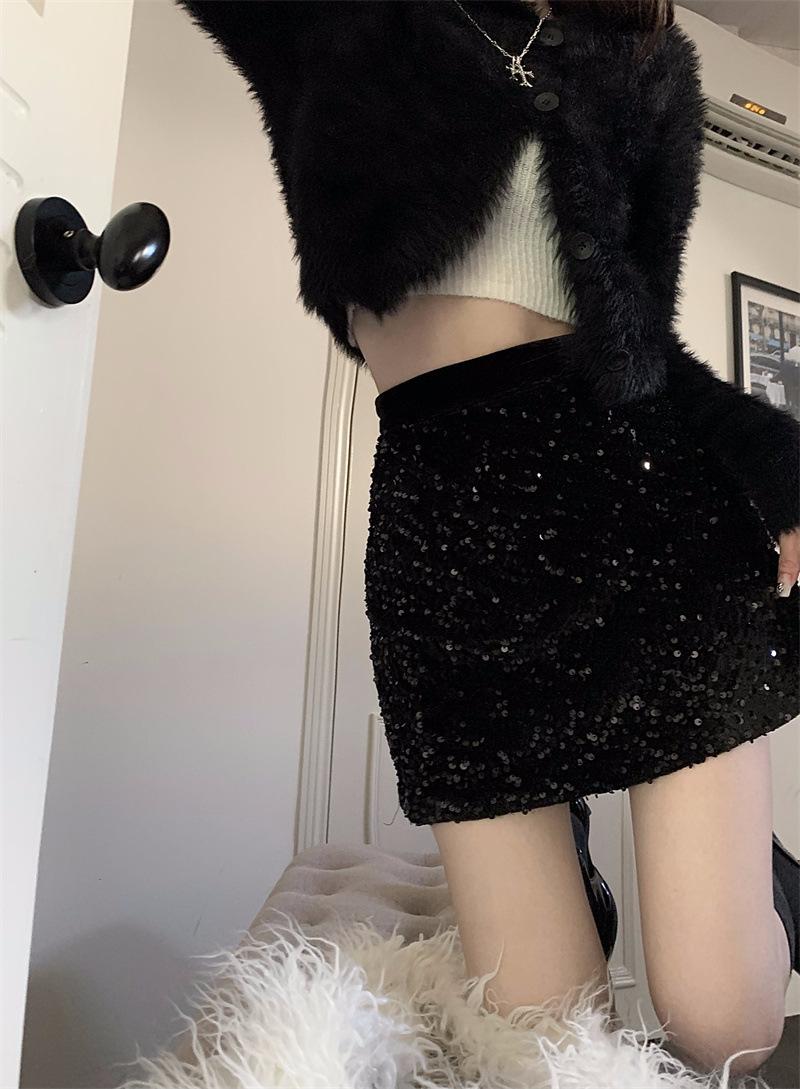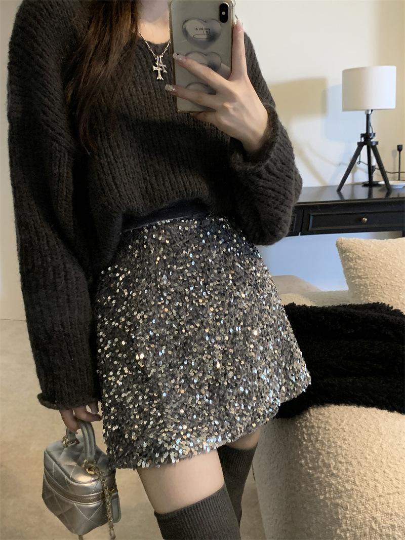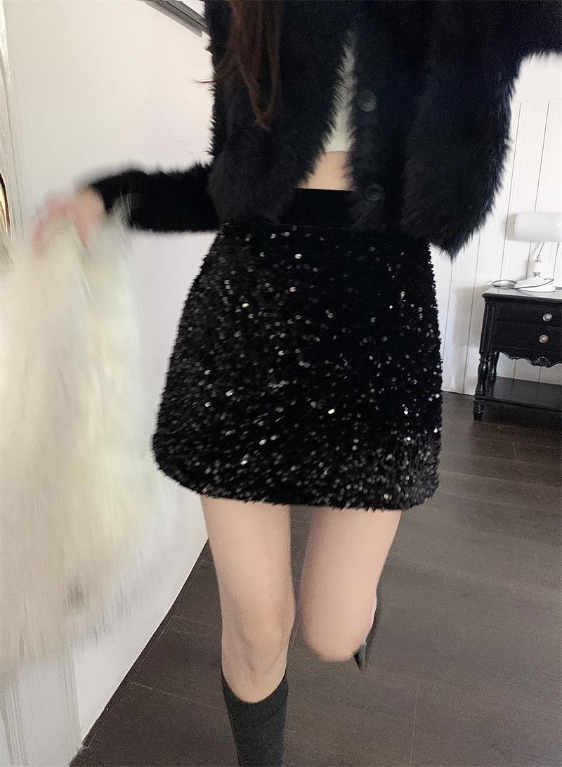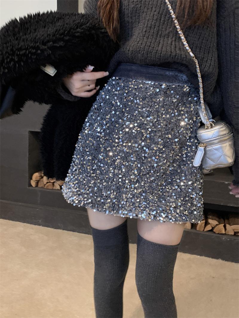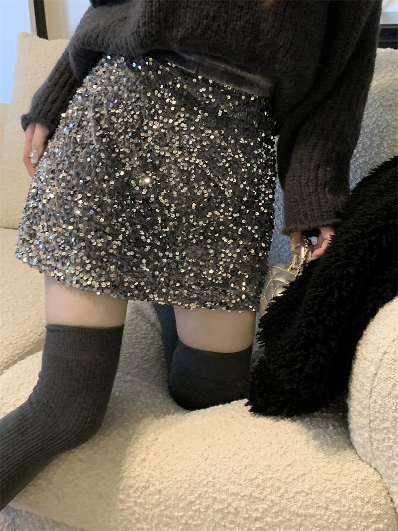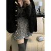 Falda de Lentejuelas Otoño e Invierno para Mujer Estilo Coreano 2025 Nuevo Estilo Cintura Alta Aspecto Adelgazante Falda Corta Ajustada a las Caderas