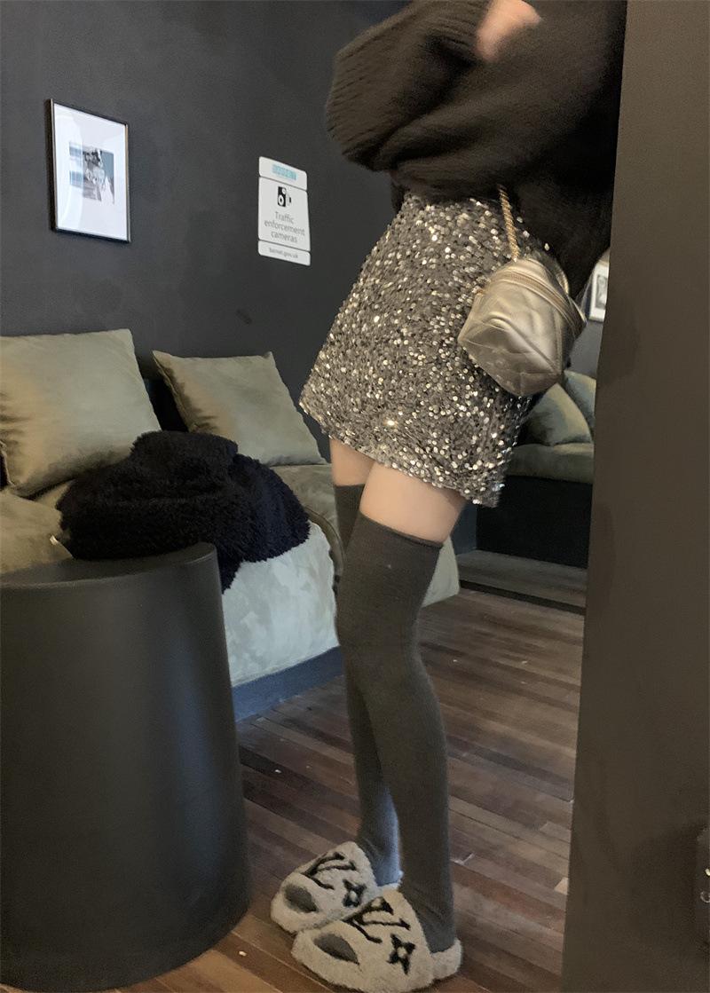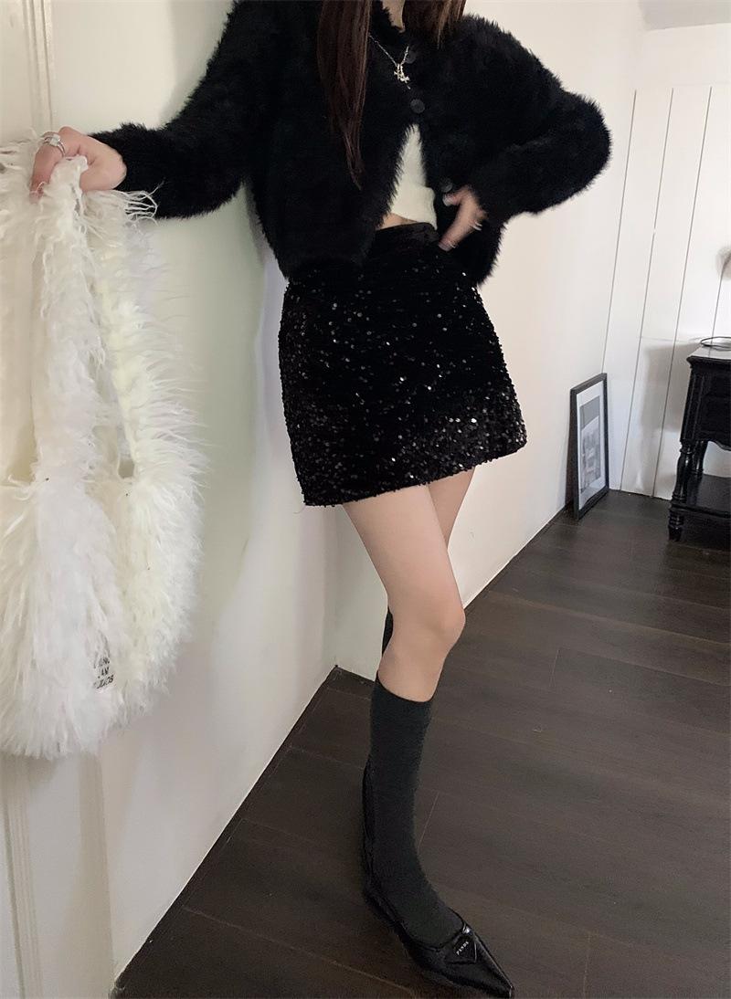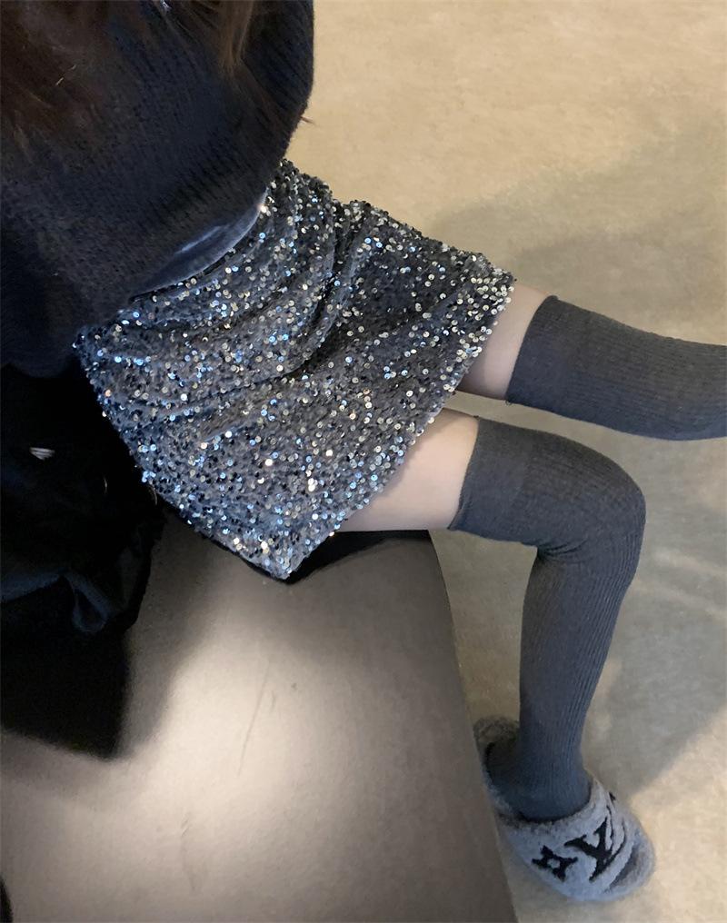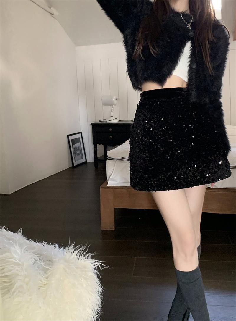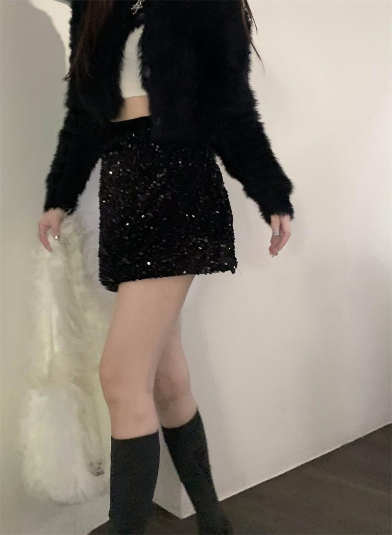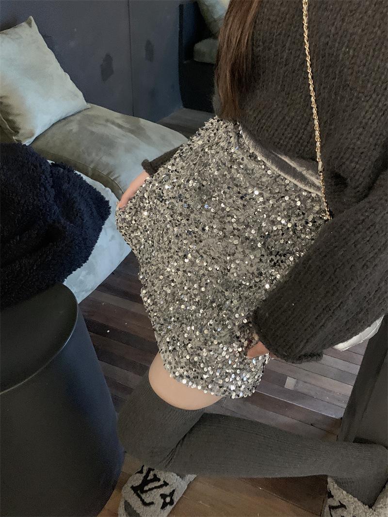 Falda de Lentejuelas Otoño e Invierno para Mujer Estilo Coreano 2025 Nuevo Estilo Cintura Alta Aspecto Adelgazante Falda Corta Ajustada a las Caderas
