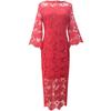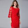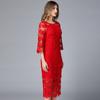 Vestido rojo de marca de celebridades, estilo europeo y americano, talla grande, mangas acampanadas, ajustado a la cadera, con encaje calado.