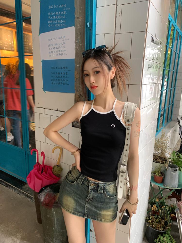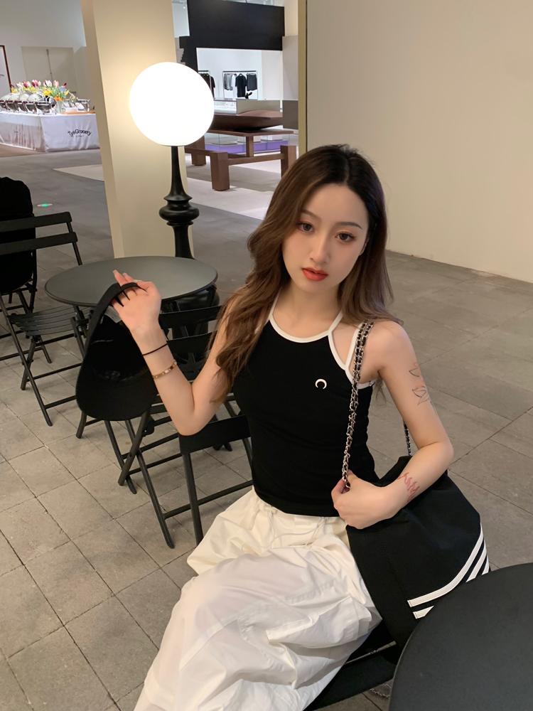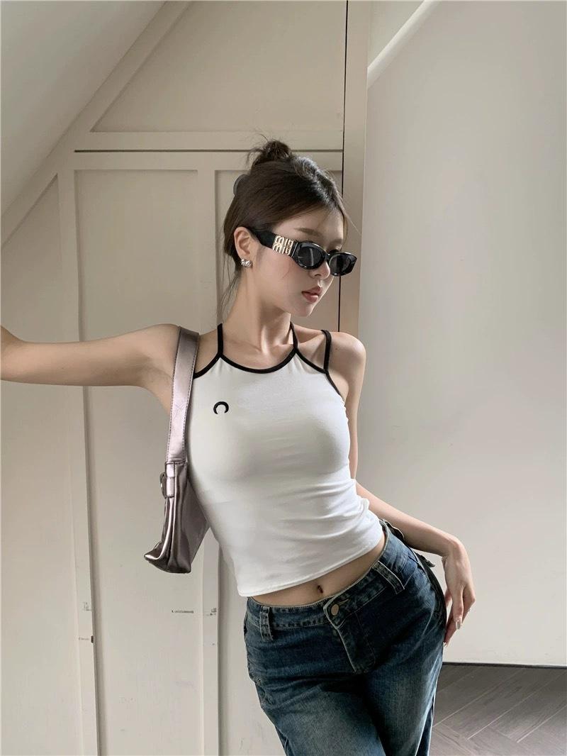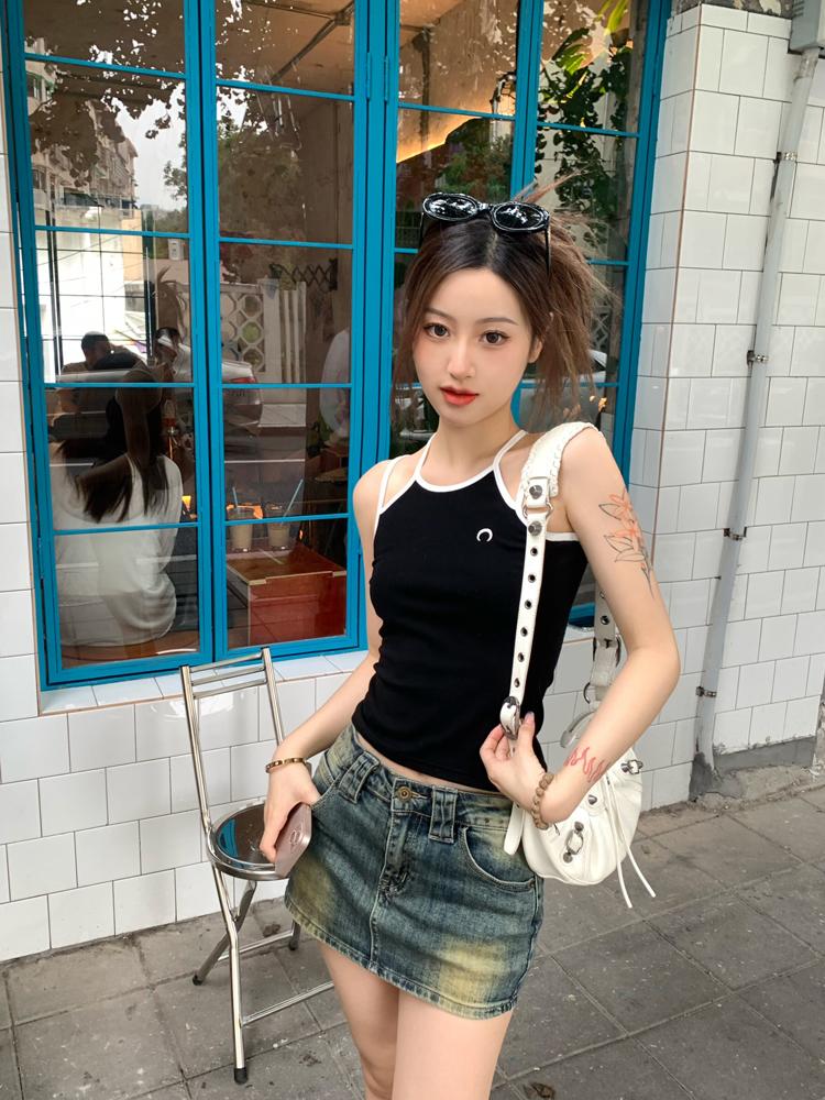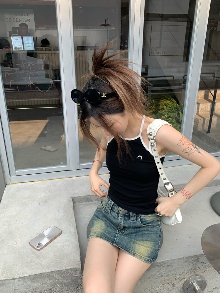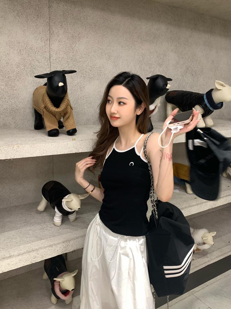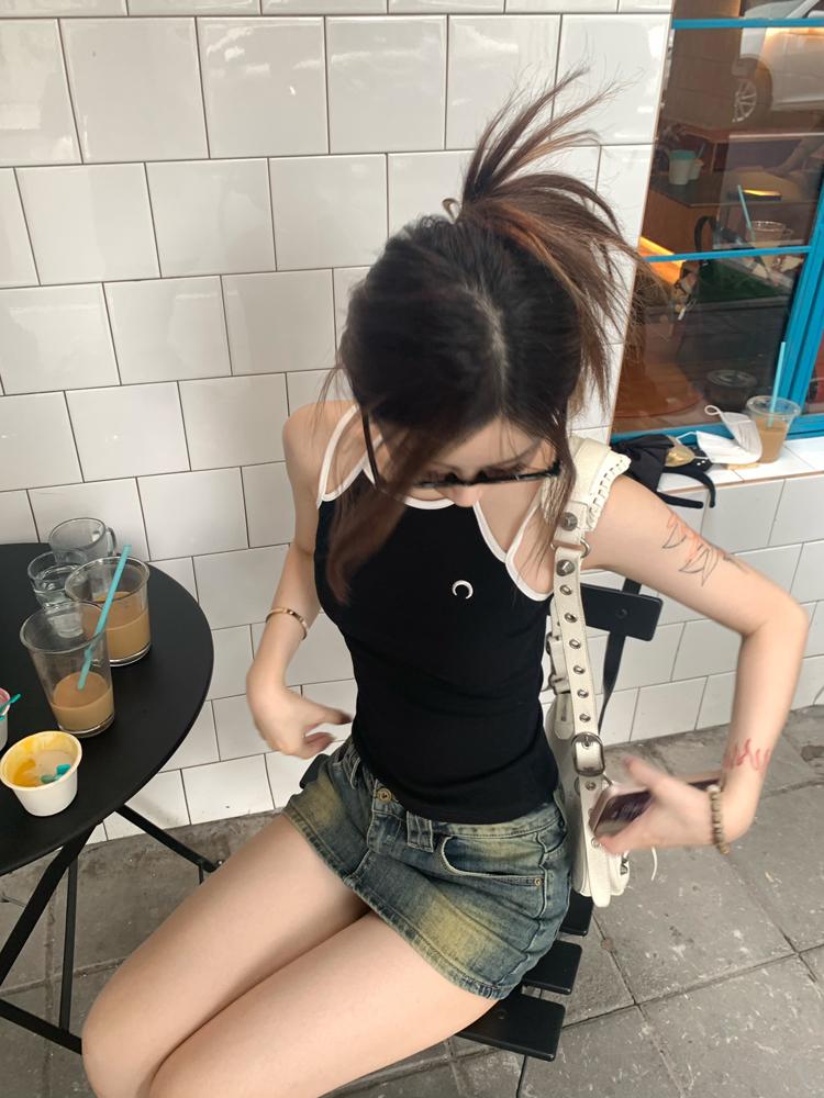 Camisola bordada con luna para mujer verano 2023, fina, nicho, sexy, elástica, ajustada, para chica sexy, top corto sin mangas