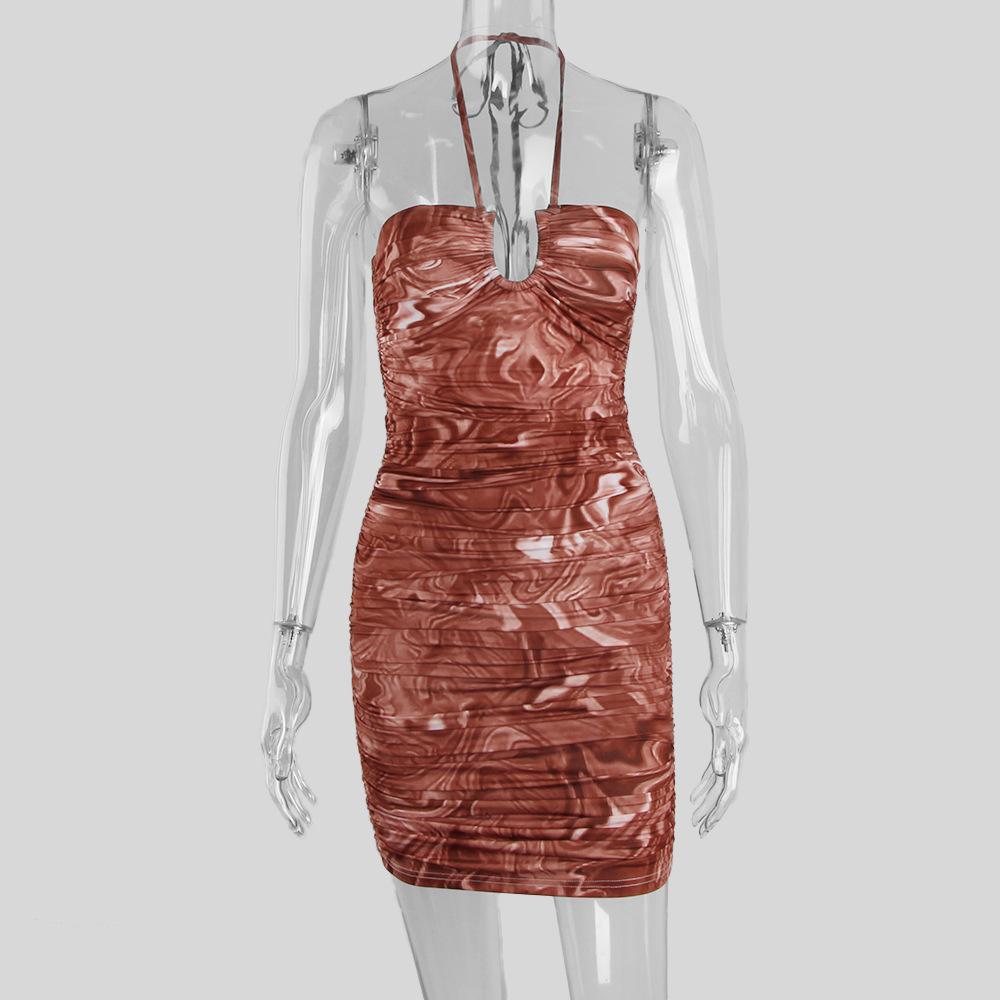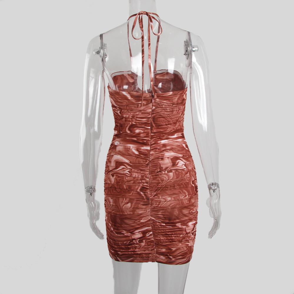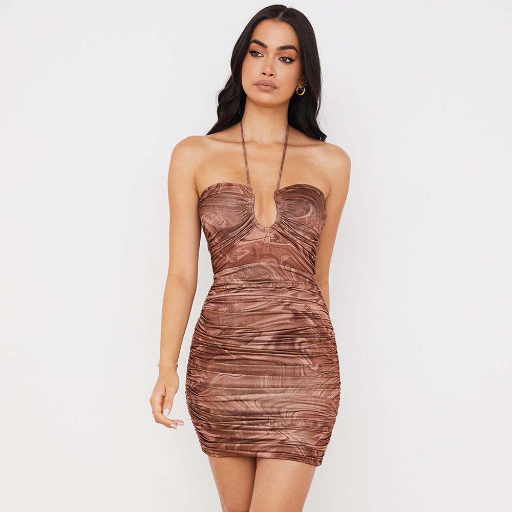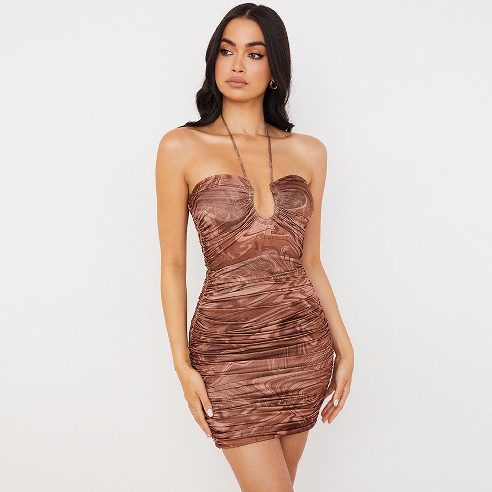Nuevo vestido sexy europeo y americano corto con cuello ajustado, plisado y estampado transfronterizo, sin tirantes ni espalda descubierta, venta al por mayor de comercio exterior
