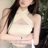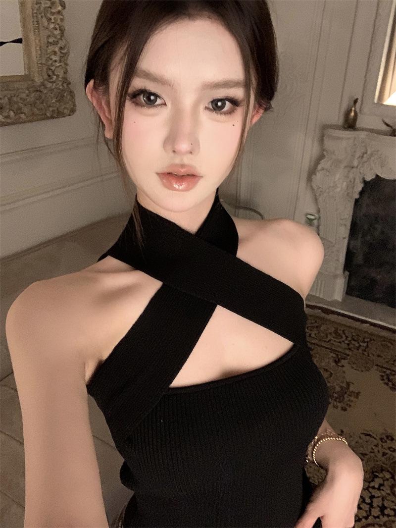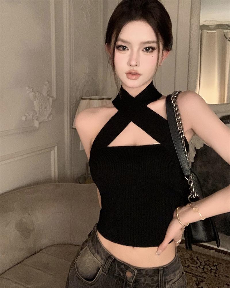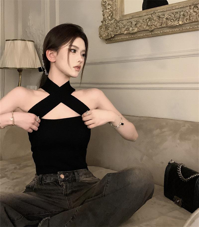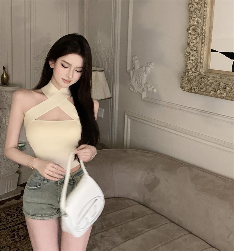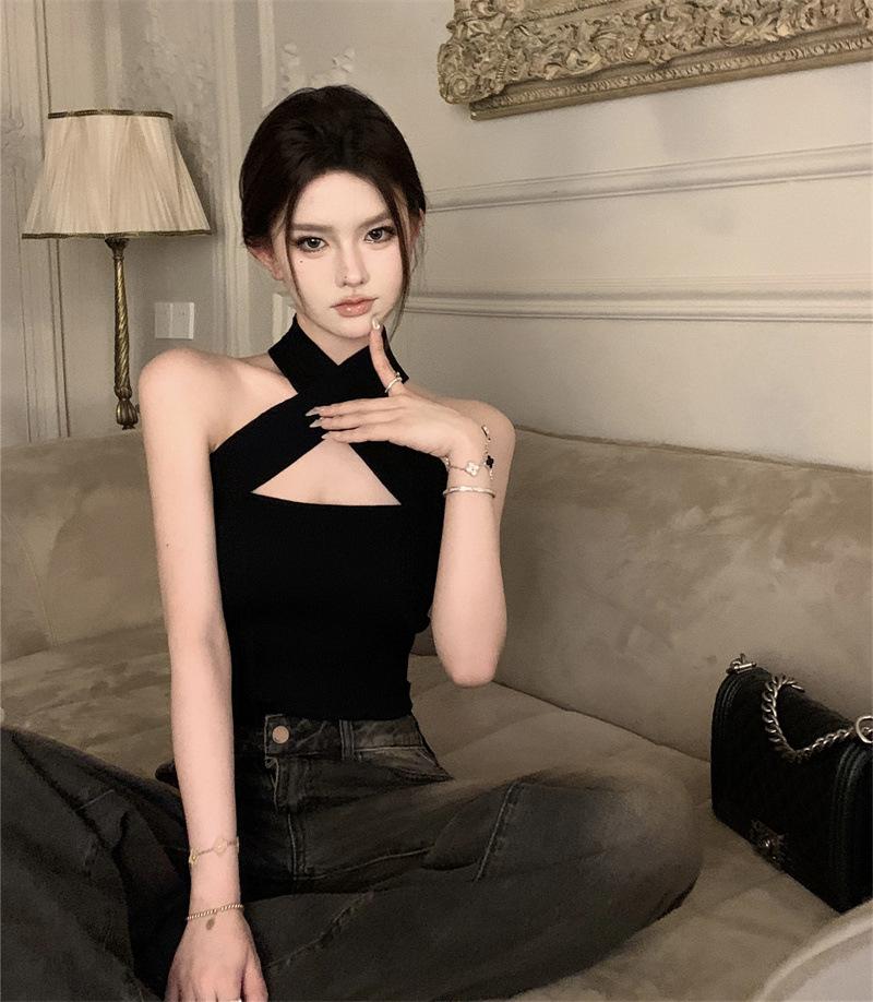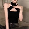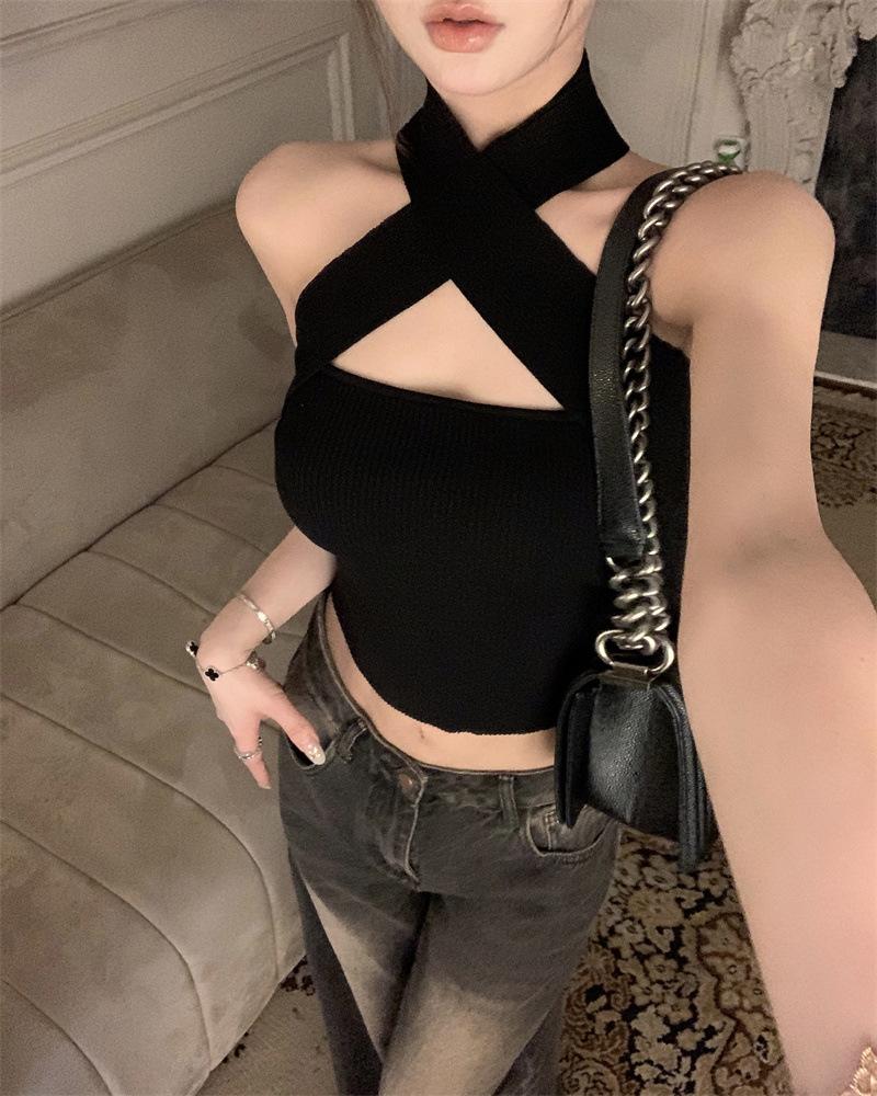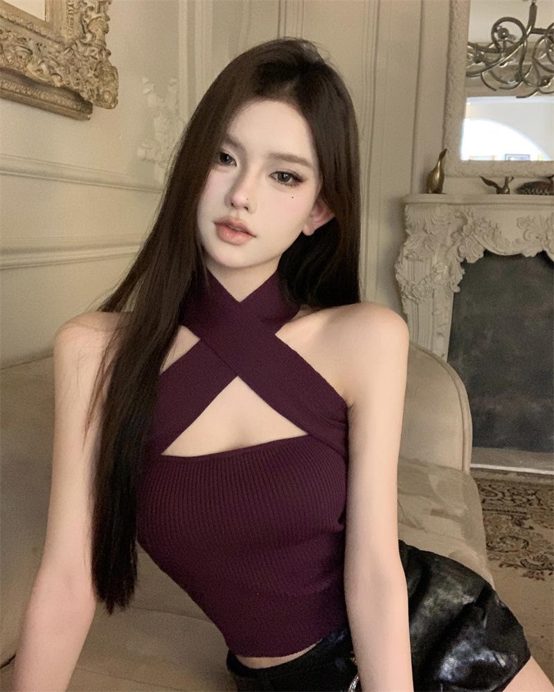 Camisola Lila de Verano para Mujer con Cuello Halter Cruzado y Hombros Descubiertos, Diseño de Cintura para Ropa Exterior Negra, Top Hottie de Pura Lujuria