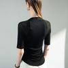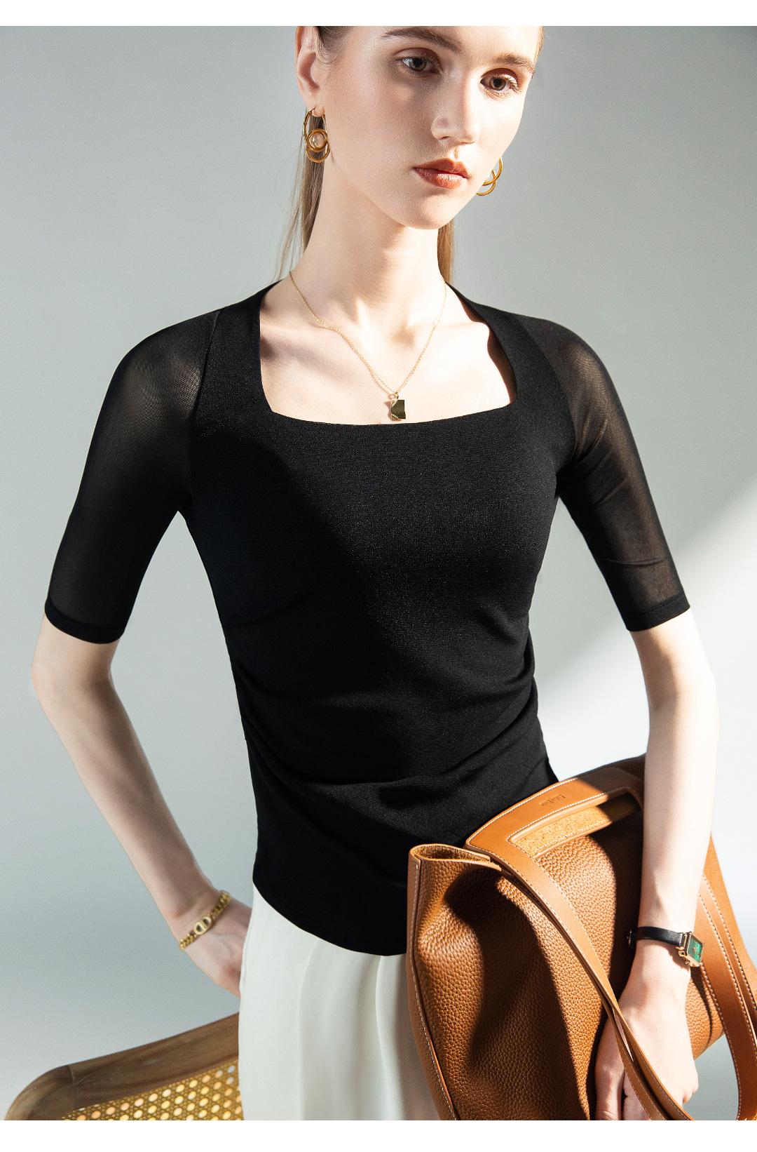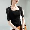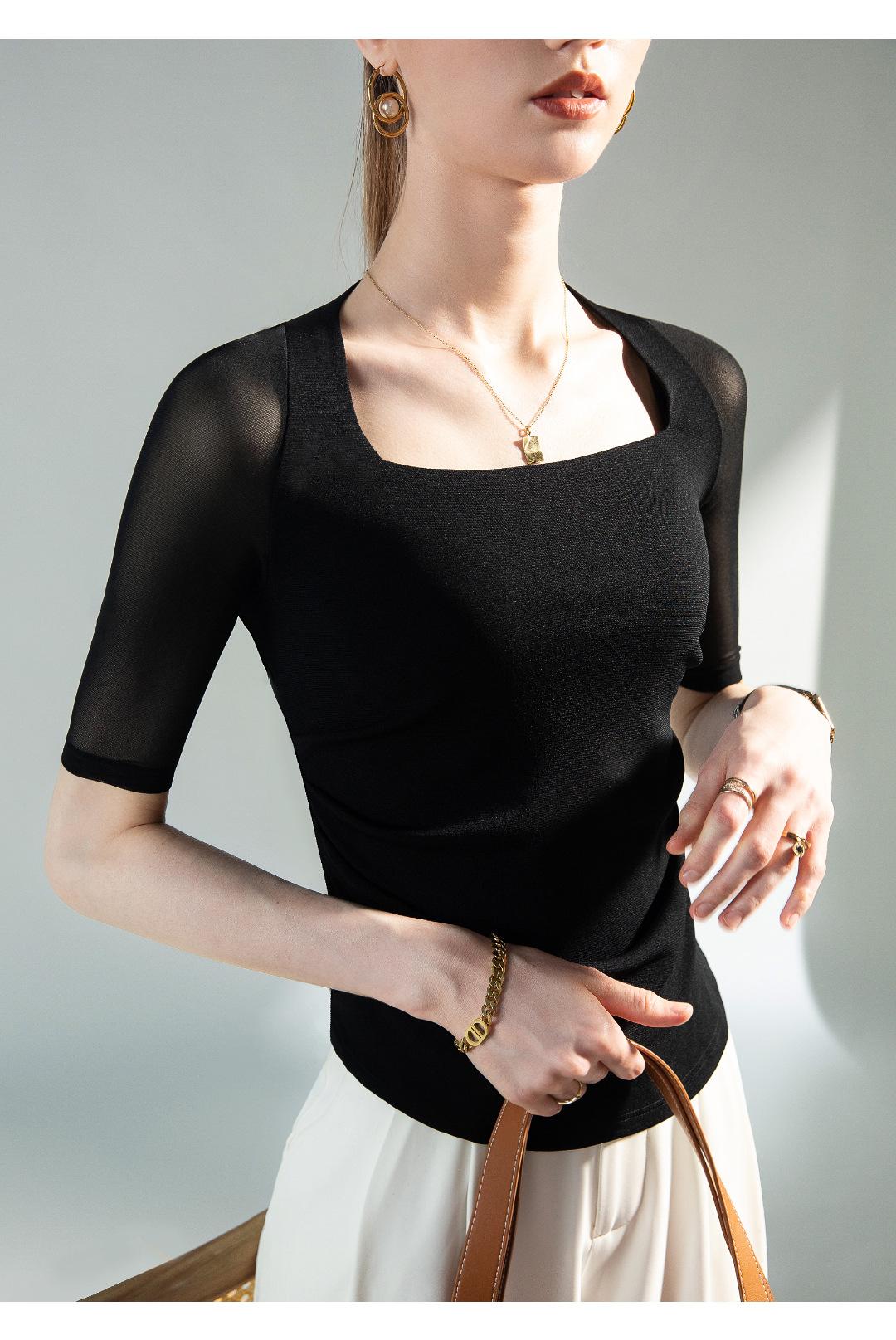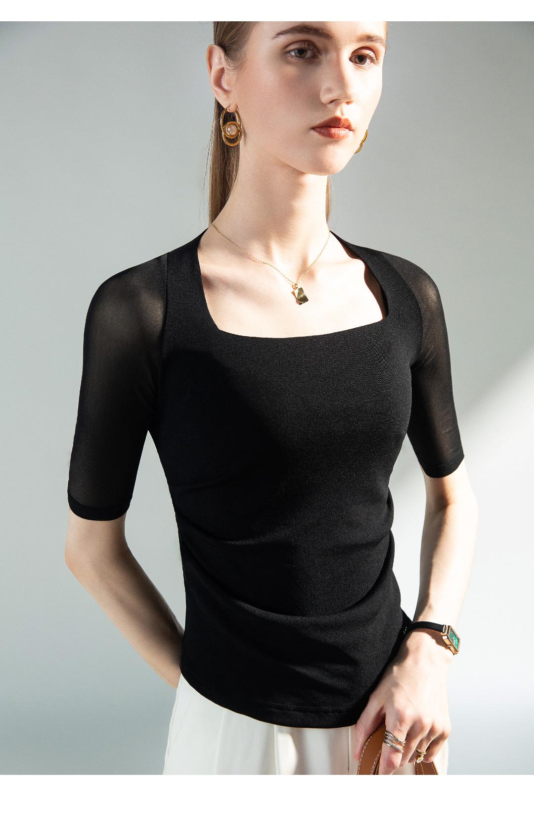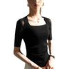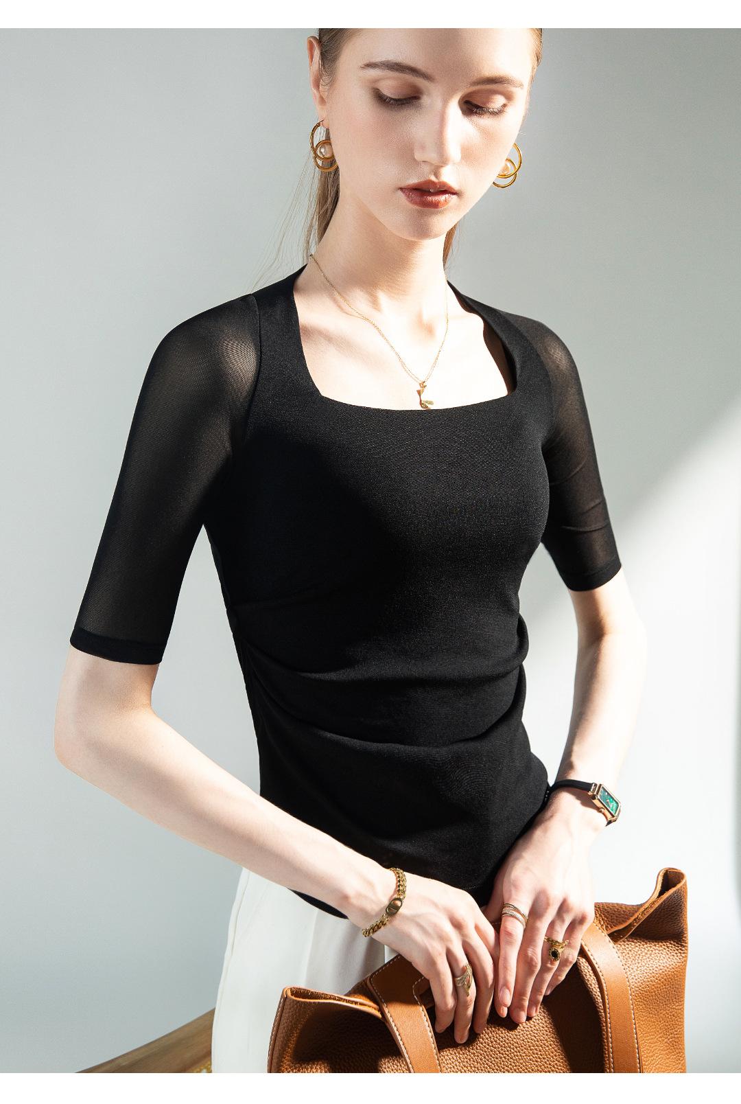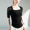 Camisa de media manga con cuello cuadrado retro de principios de otoño, de malla, con cintura estrecha y diseño plisado.