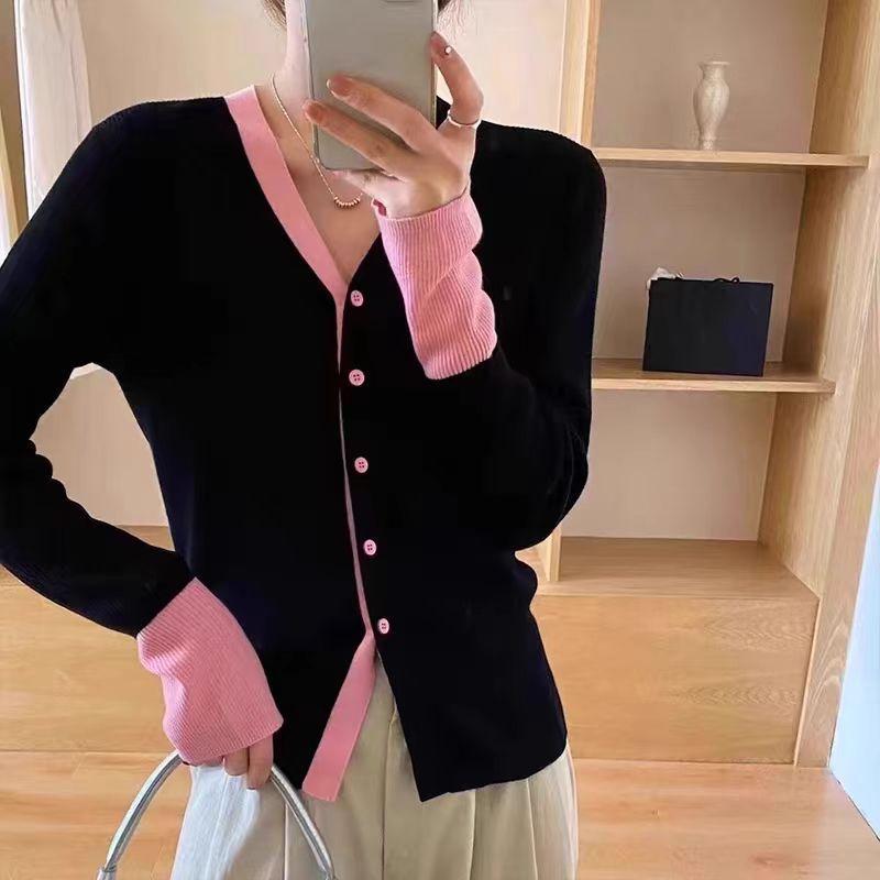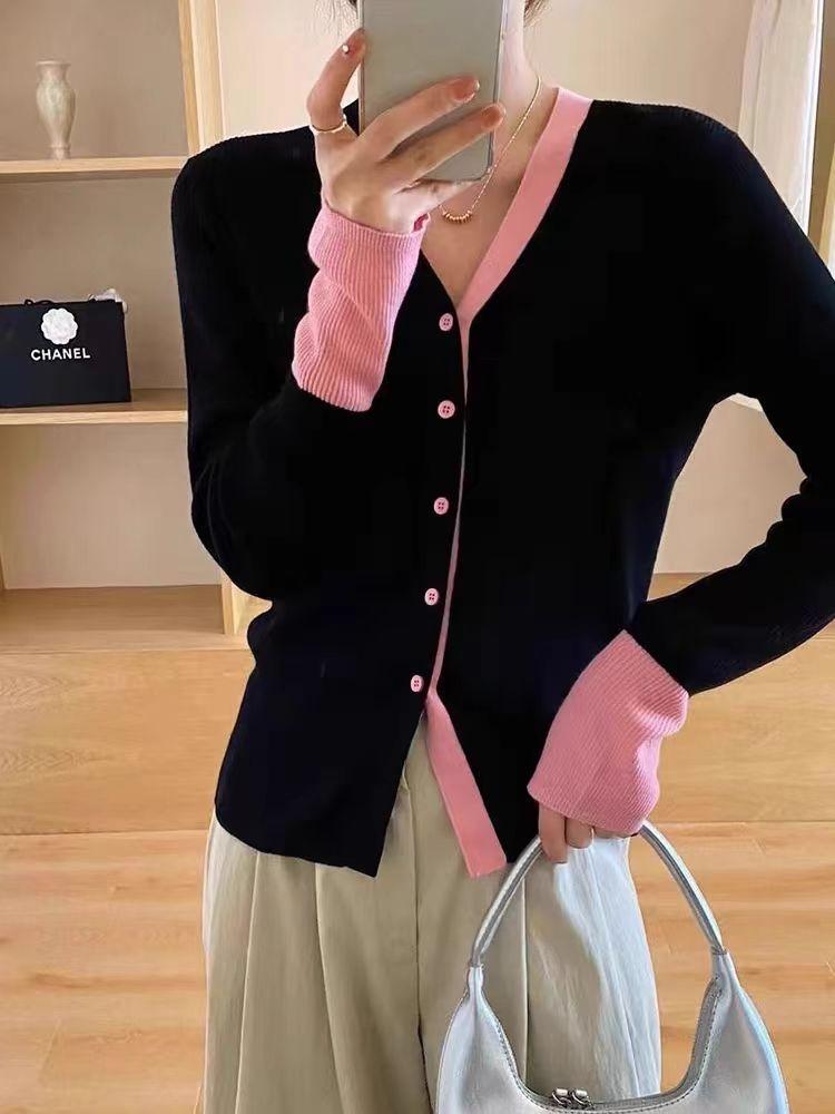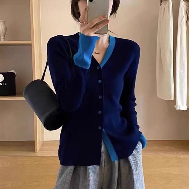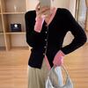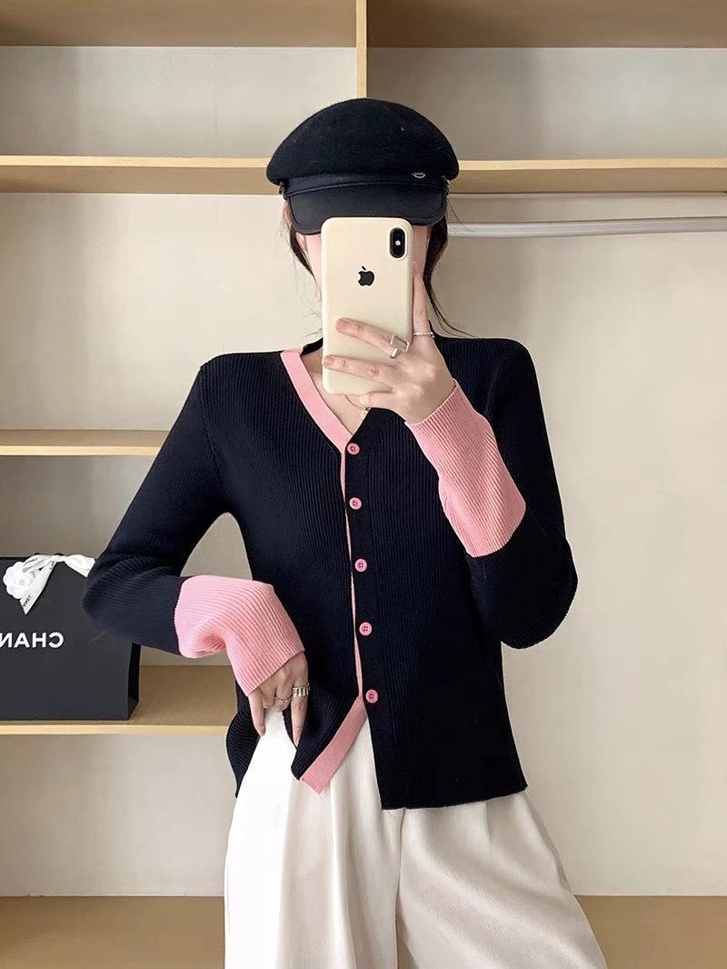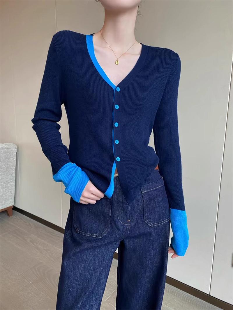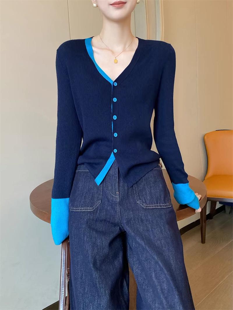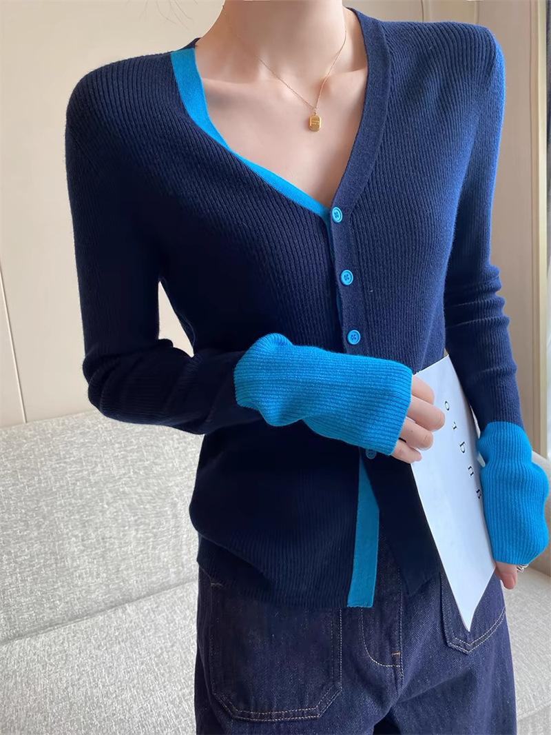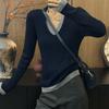 Suéter falso de dos piezas con cuello en V y color de contraste para mujer 2024, nuevo suéter adelgazante de estilo occidental de nicho de principios de primavera
