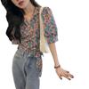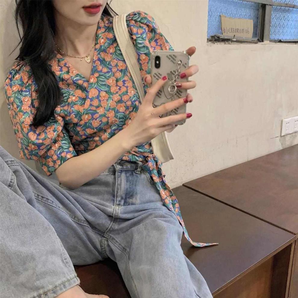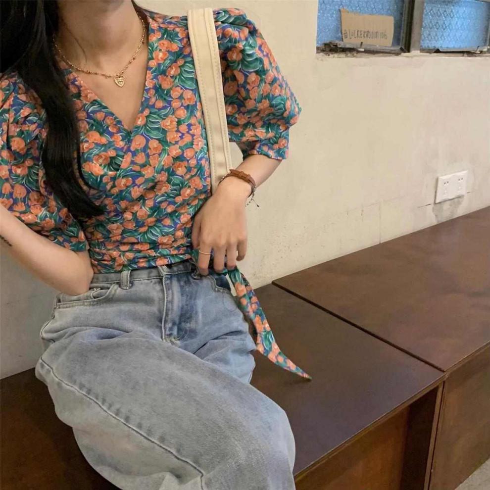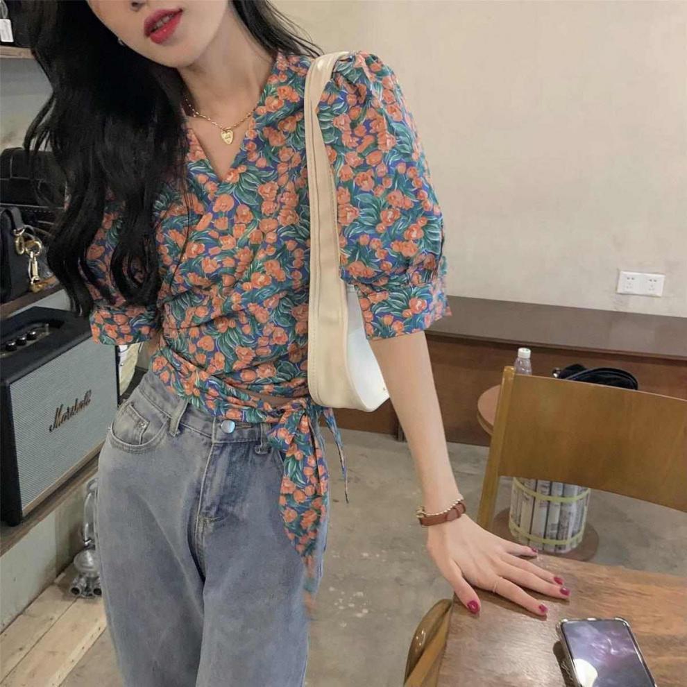 Camisa corta floral para mujer, verano 2023, diseño retro, cuello redondo, dulce Spice Girl, top con cordones