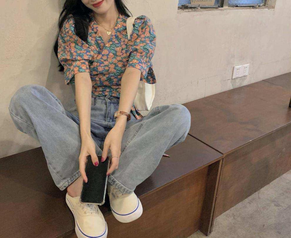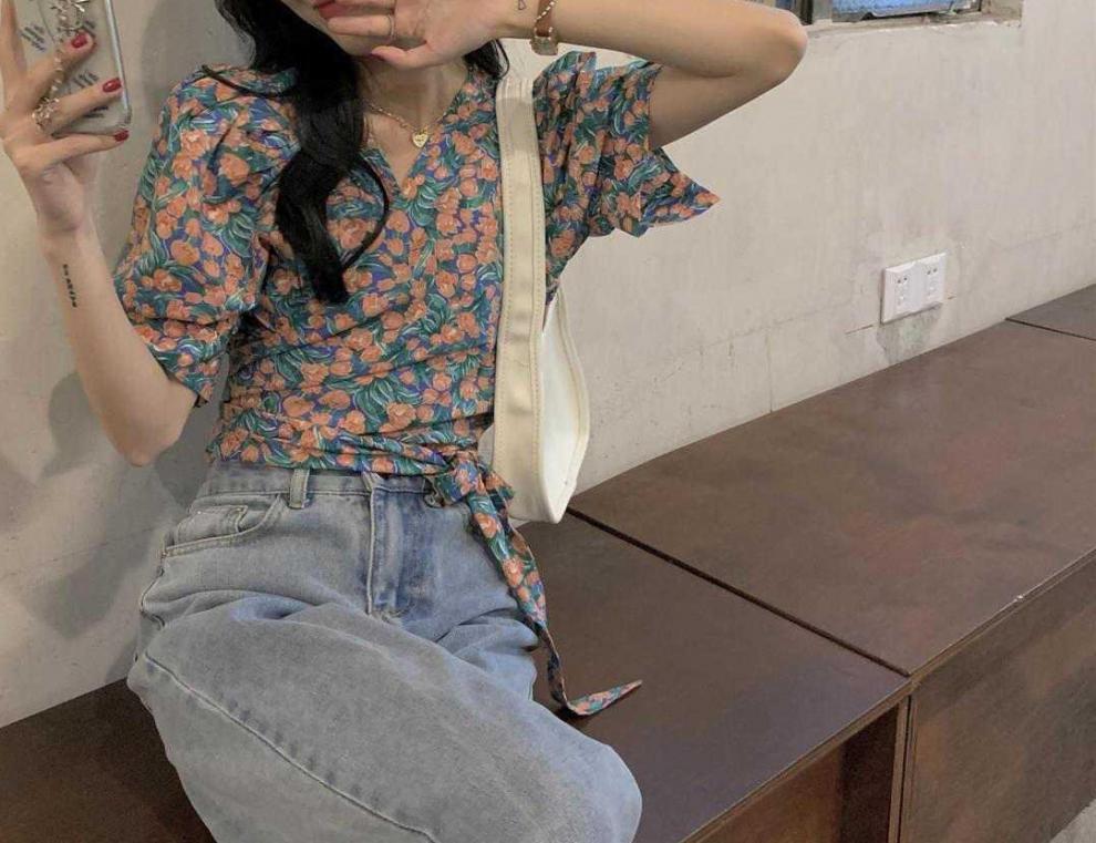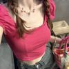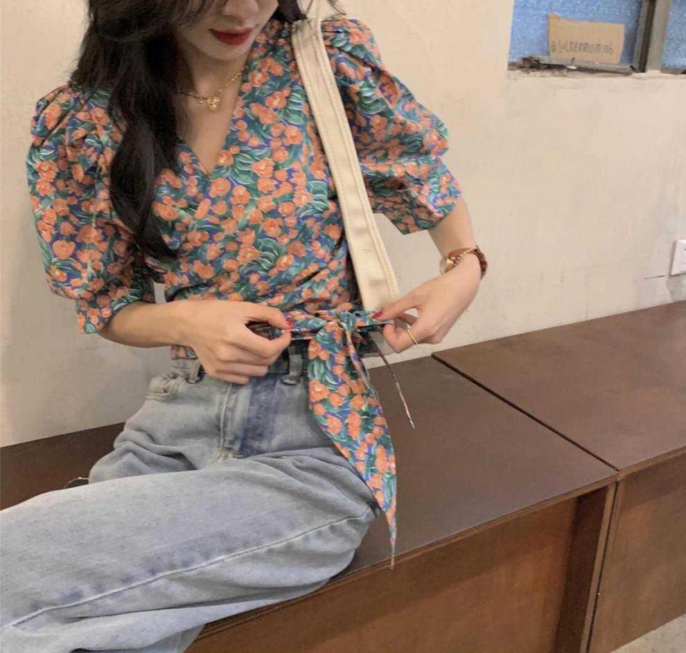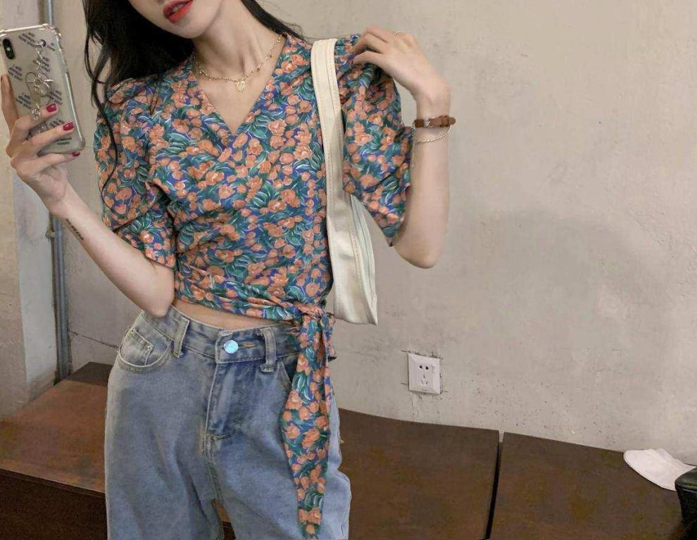 Camisa corta floral para mujer, verano 2023, diseño retro, cuello redondo, dulce Spice Girl, top con cordones