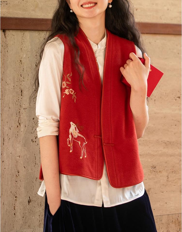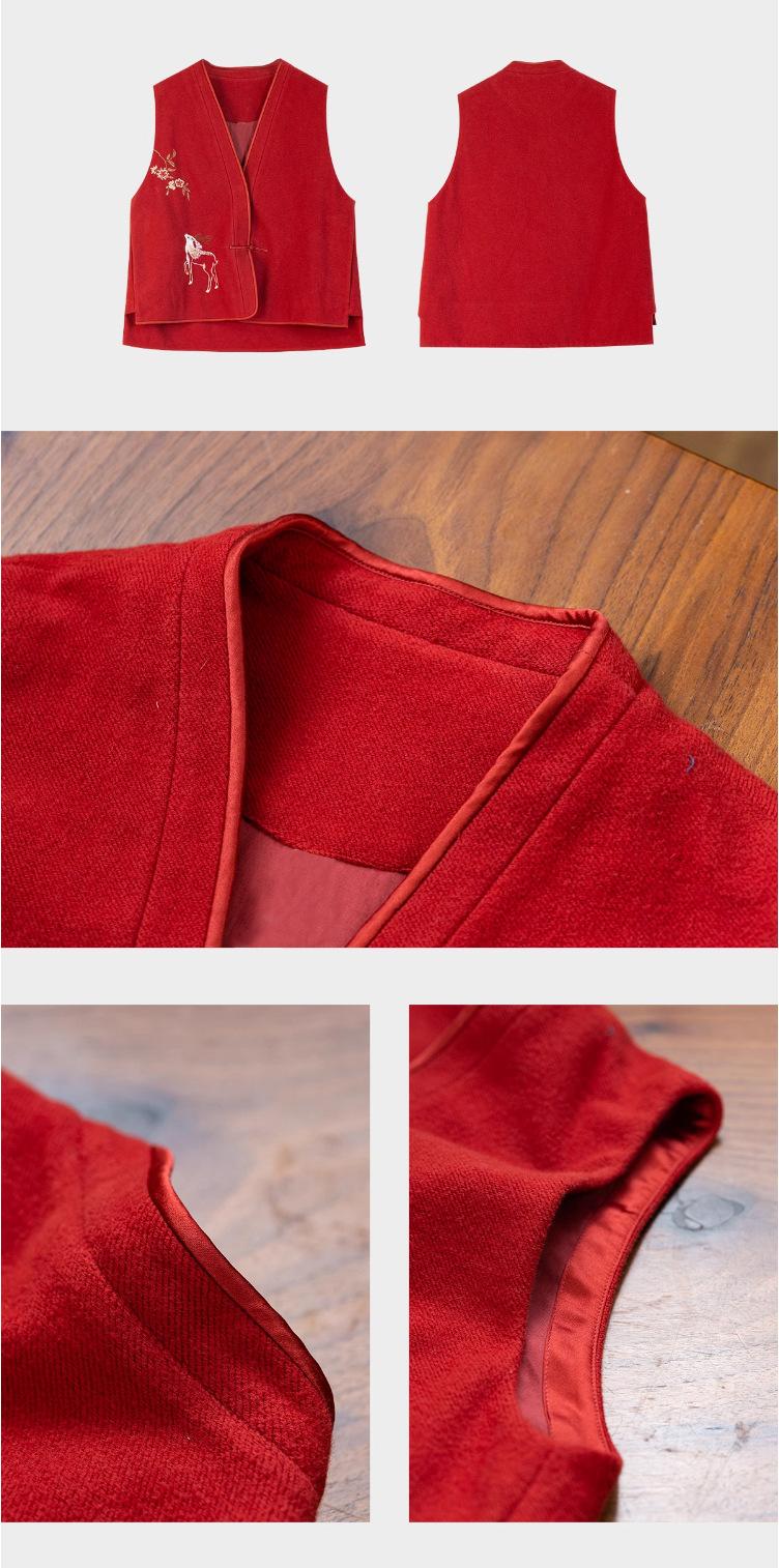 2025 Nuevo Estilo Otoño e Invierno Chaleco Artístico de Punto Bordado de Ciervo Cómodo Algodón Puro Rojo Top Chino sin Mangas