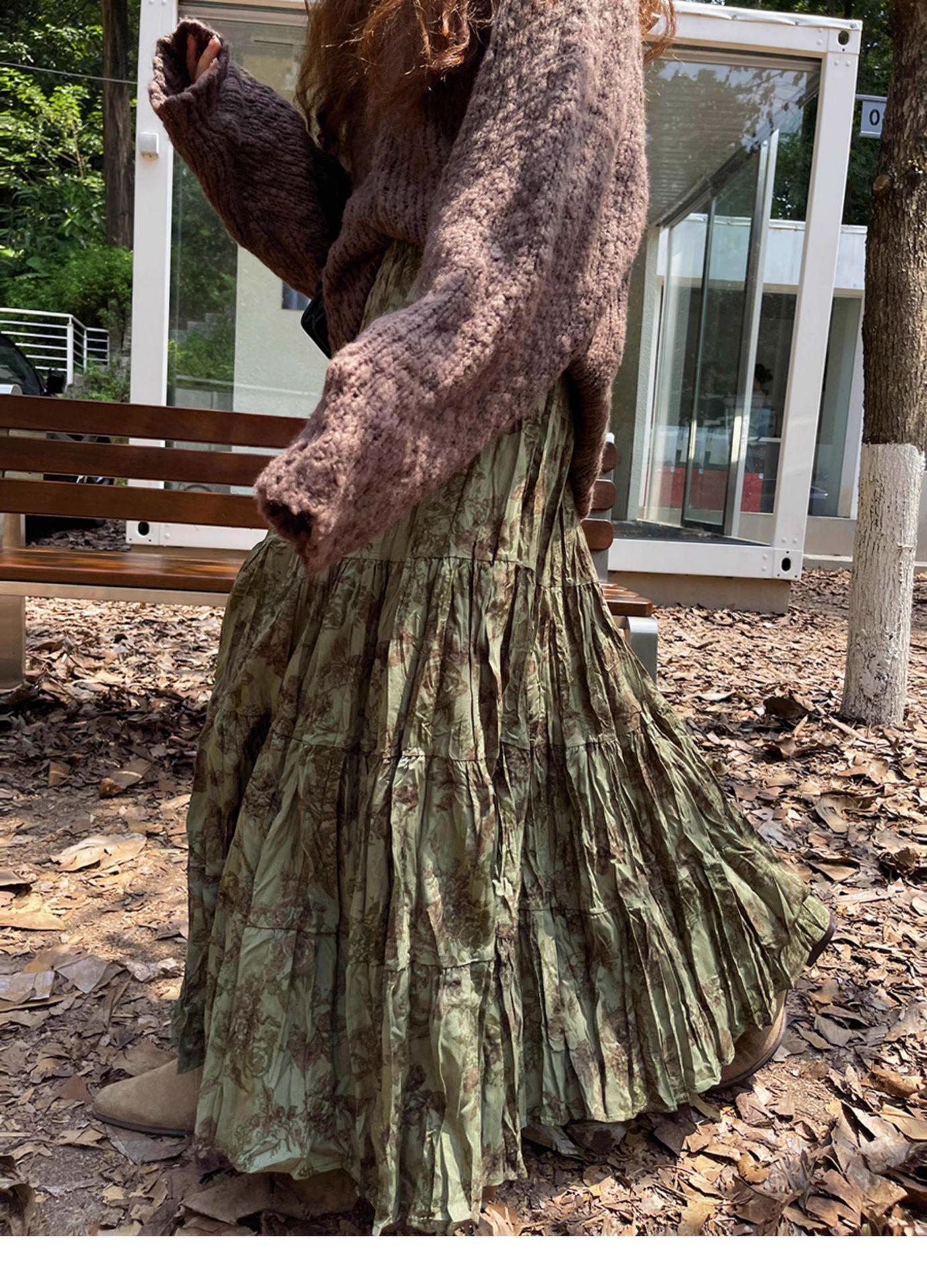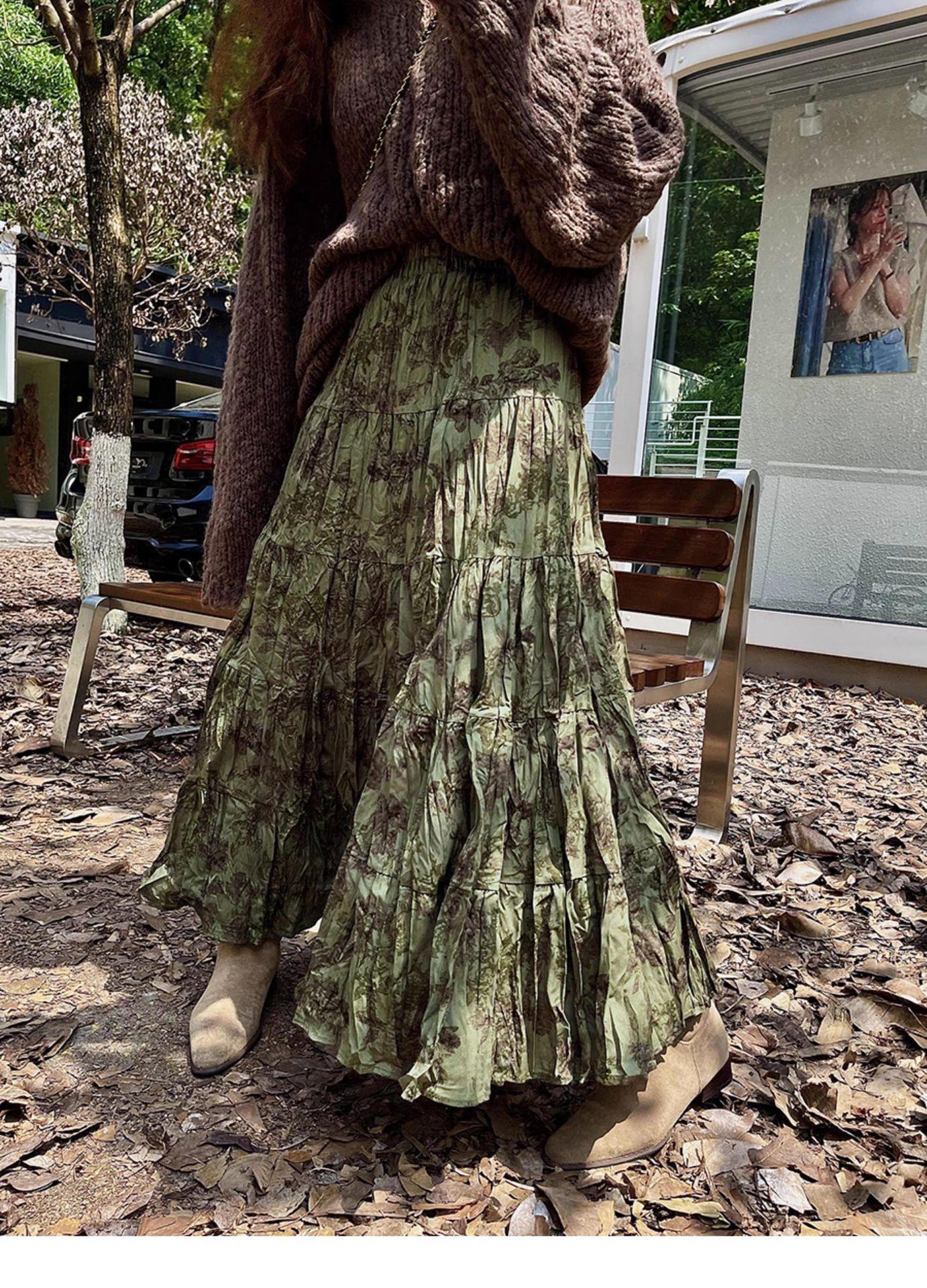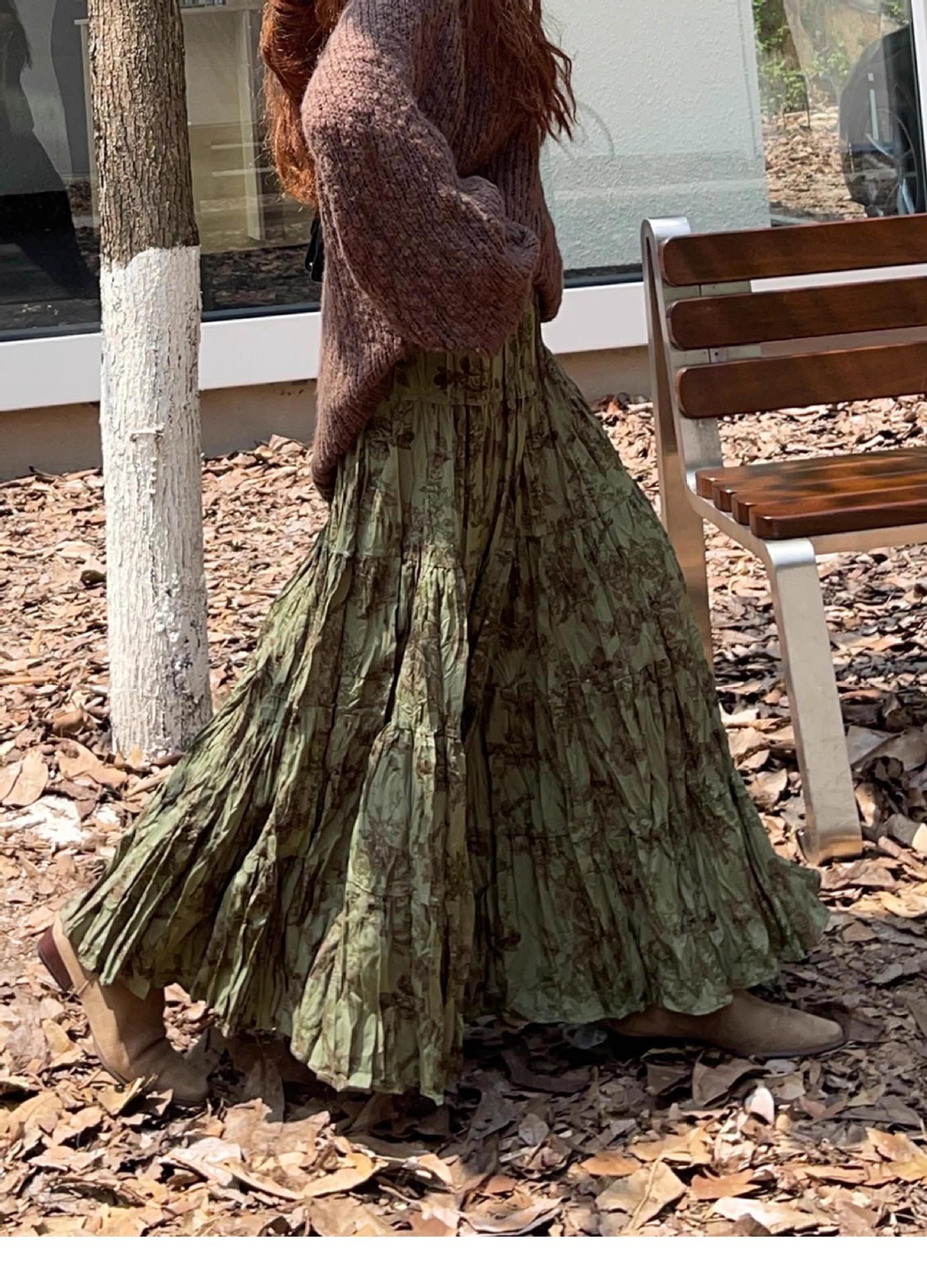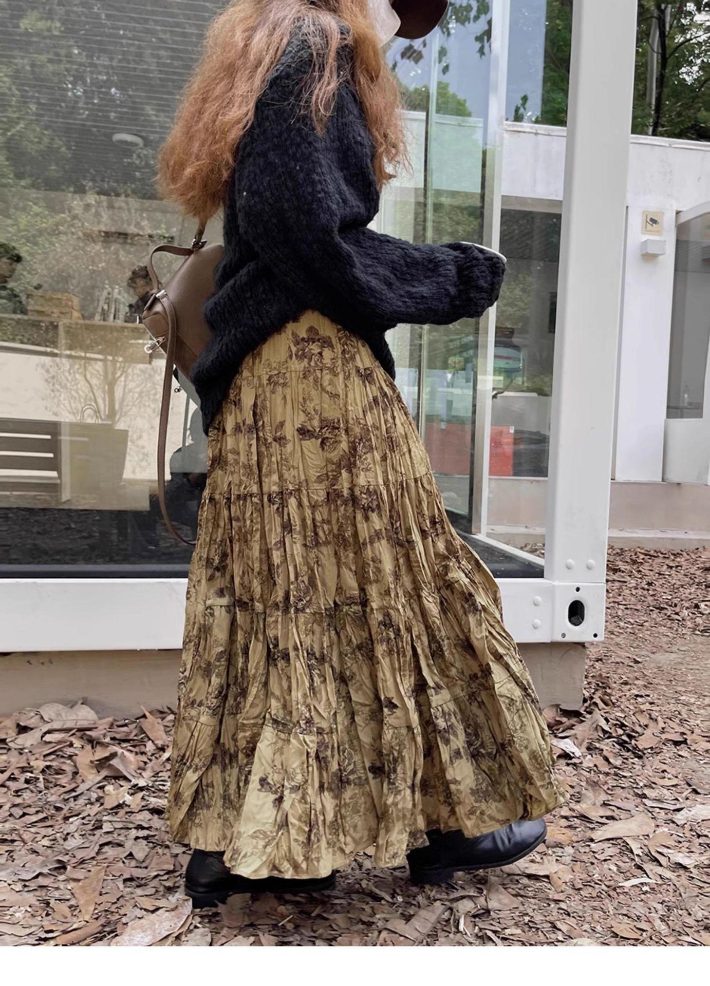 Falda Larga Patchwork de Cintura Alta Estilo Coreano, Falda A-Line Plisada, Falda Floral Vintage, Casual y Versátil para Otoño