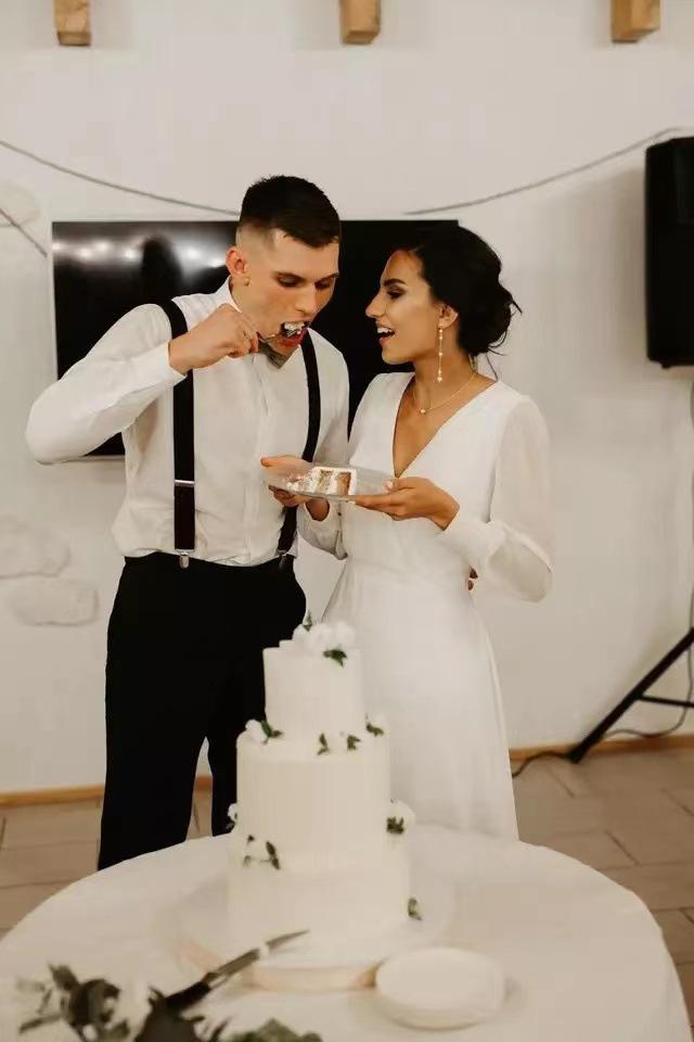 Vestido de Novia Sencillo Serie A Europeo y Americano Chifón Cuello en V Manga Larga Elegante Vestido de Novia Sencillo Fotografía de Viaje Gasa