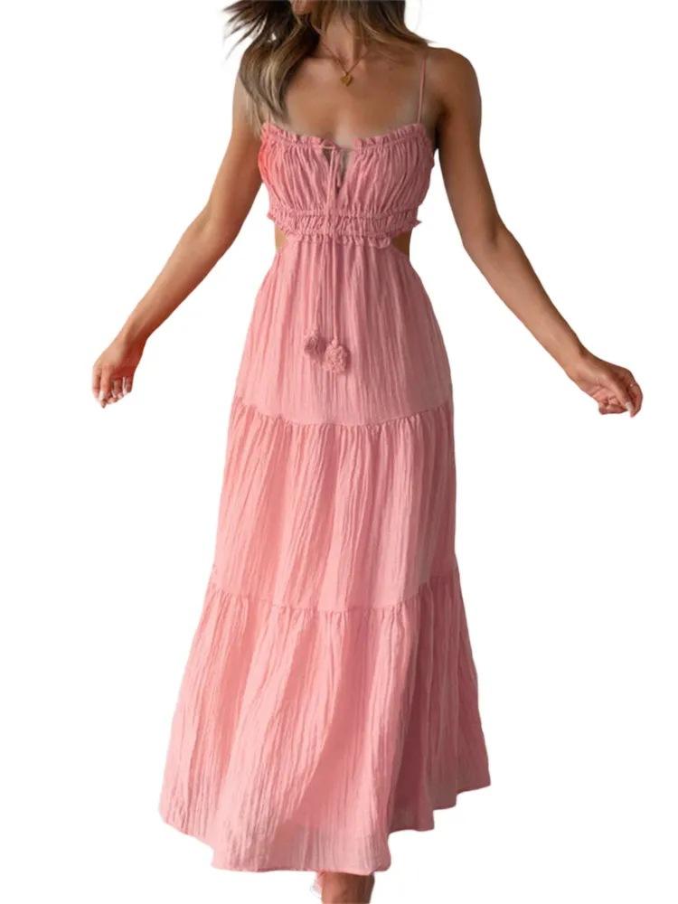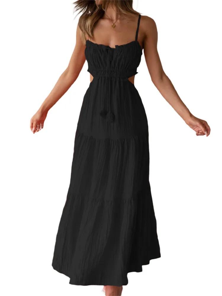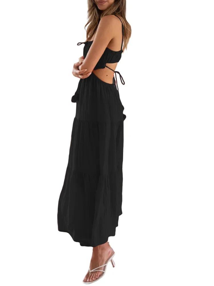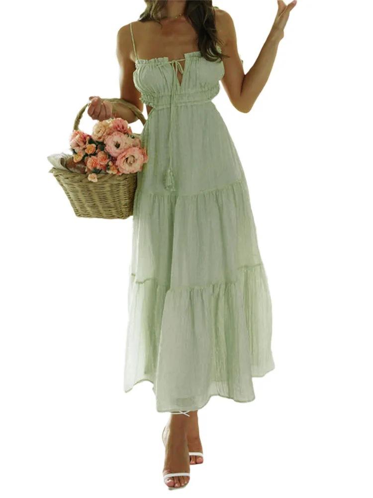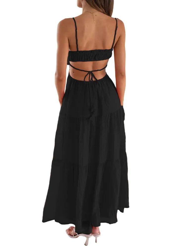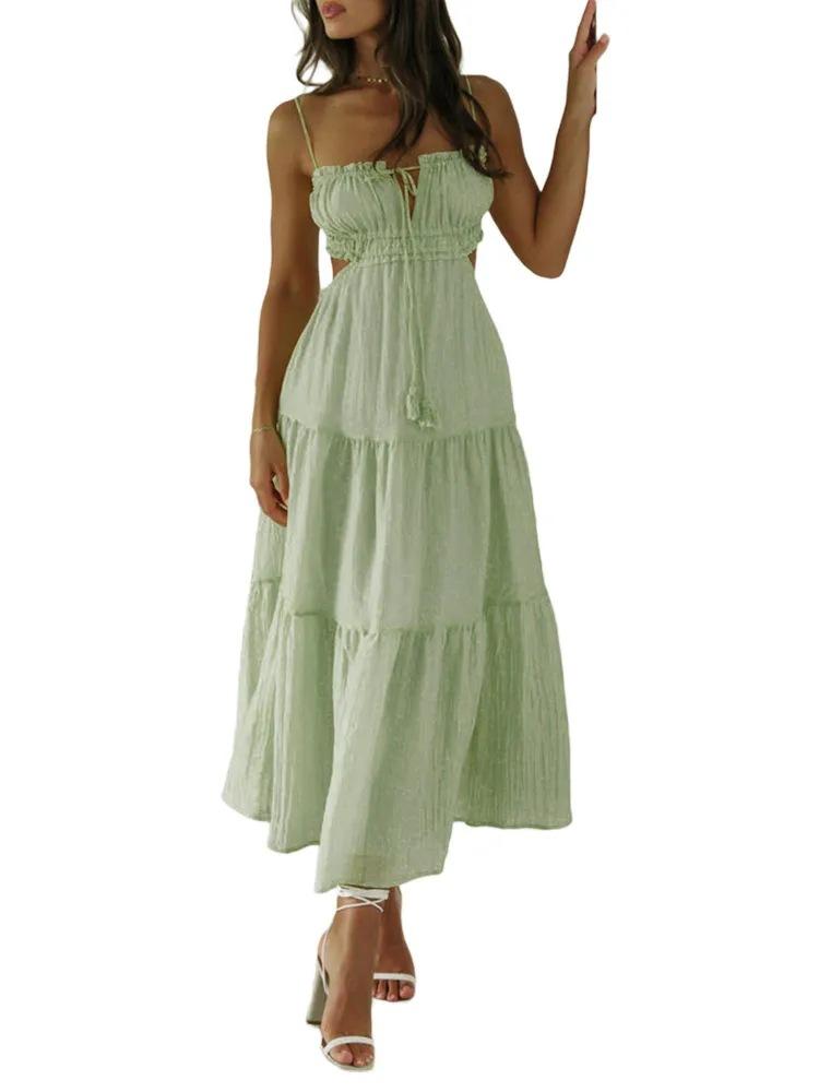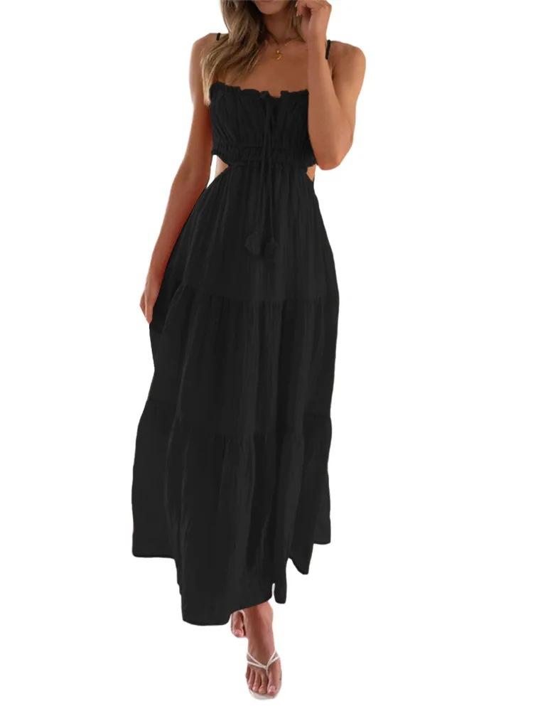 Ropa nueva de verano para mujer, temperamento europeo y americano transfronterizo, tirantes, sexy, hueco, falda larga, espalda descubierta, empalmado, vestido de gran vuelo