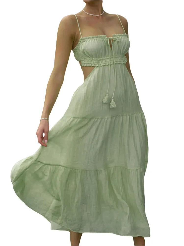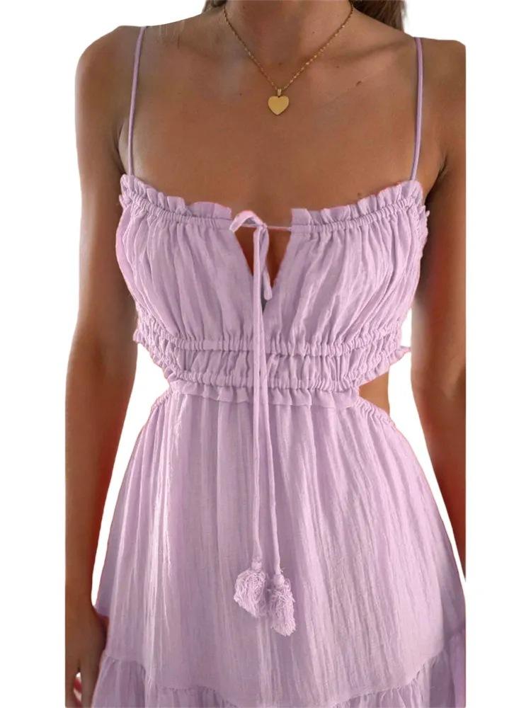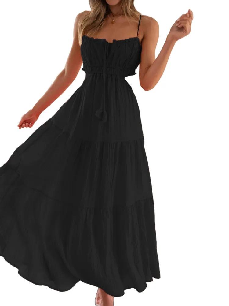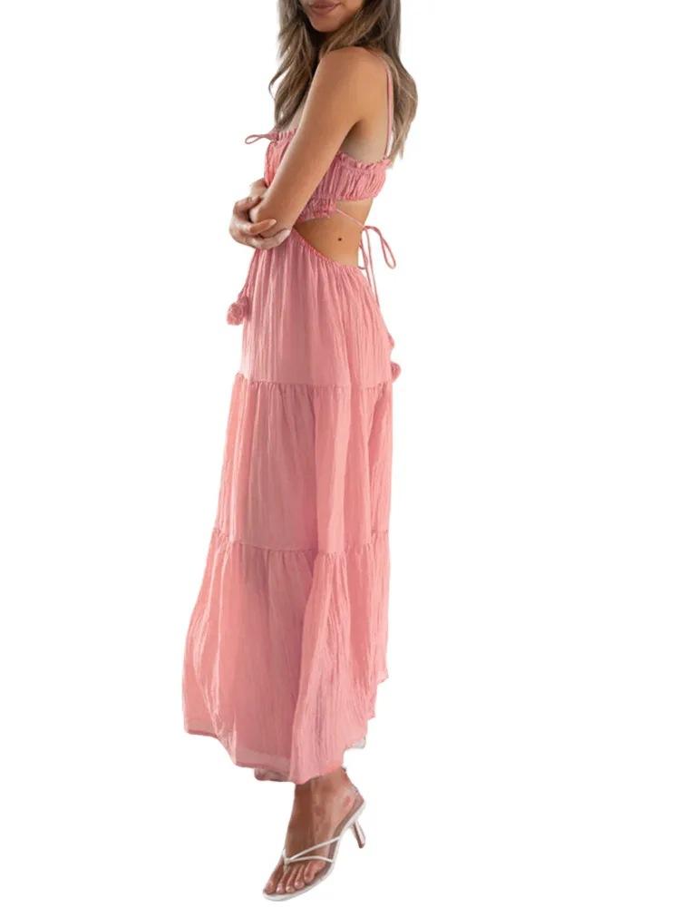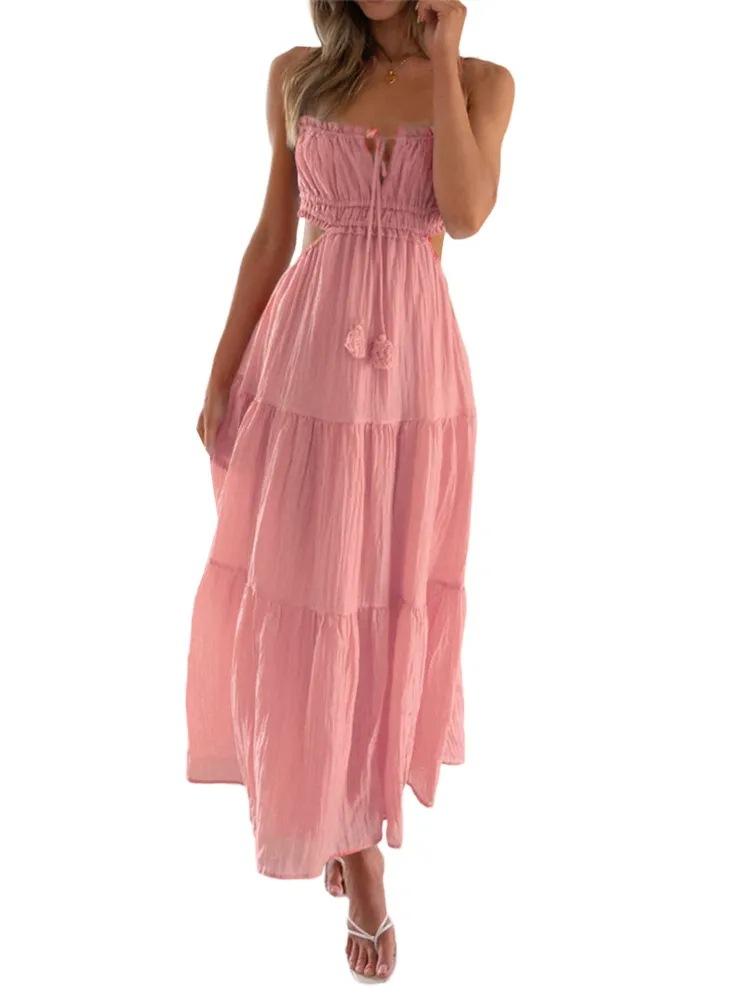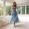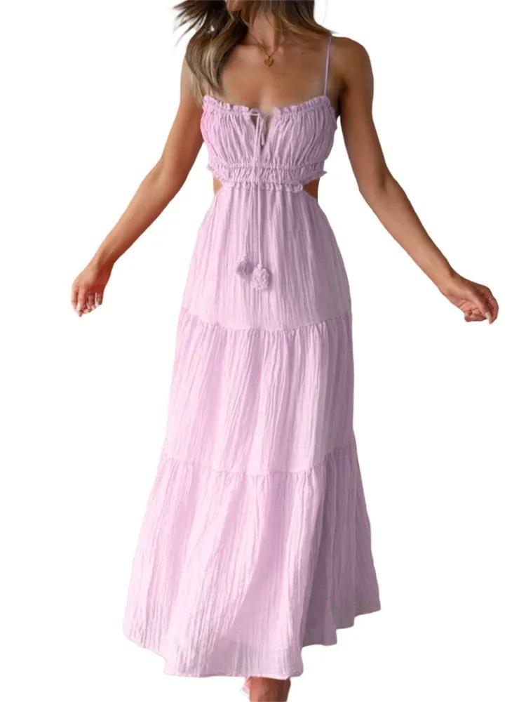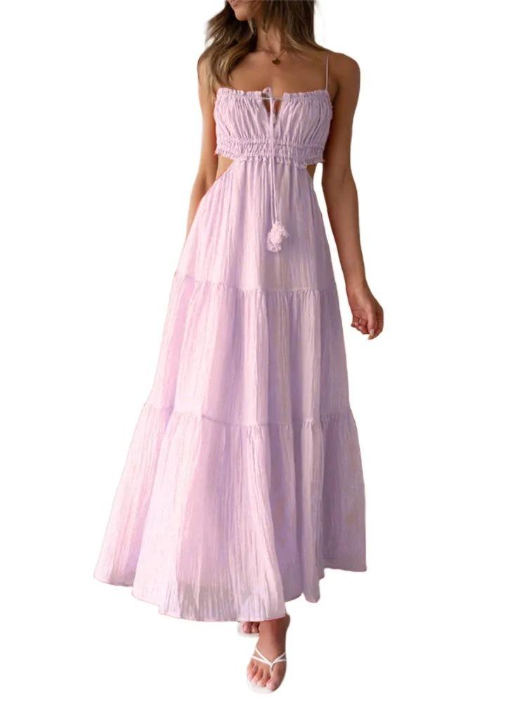 Ropa nueva de verano para mujer, temperamento europeo y americano transfronterizo, tirantes, sexy, hueco, falda larga, espalda descubierta, empalmado, vestido de gran vuelo