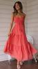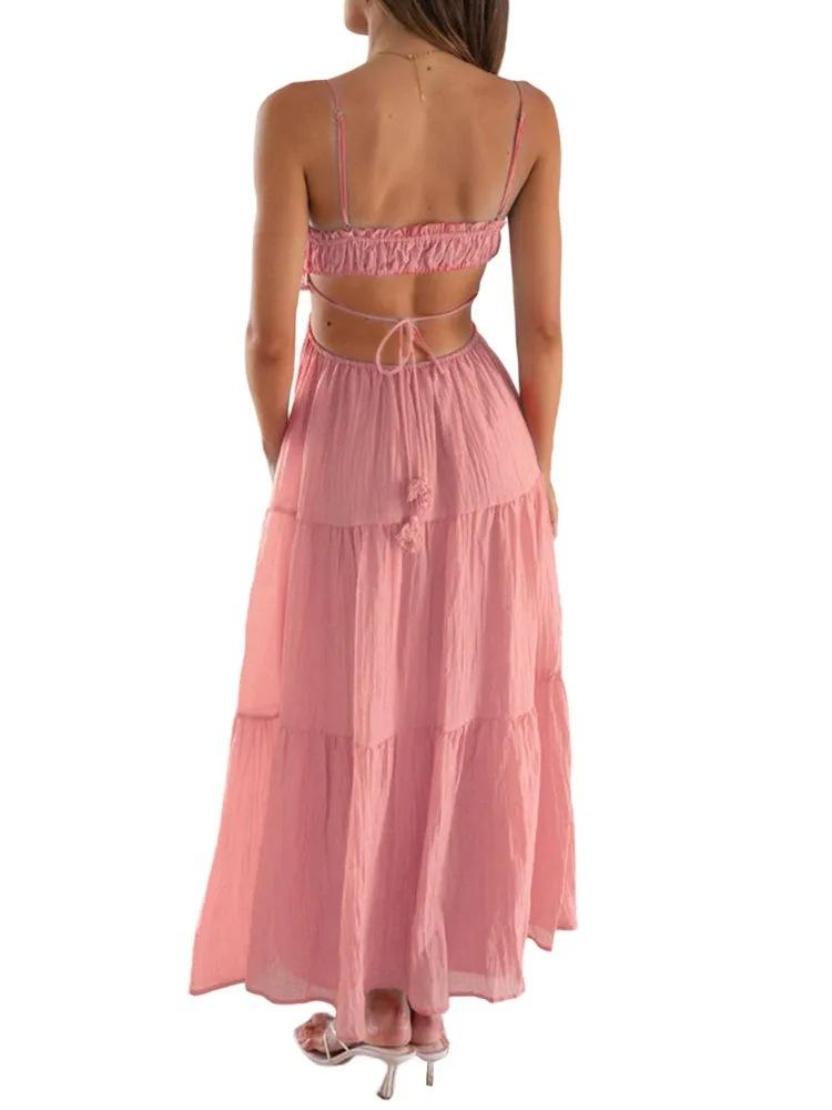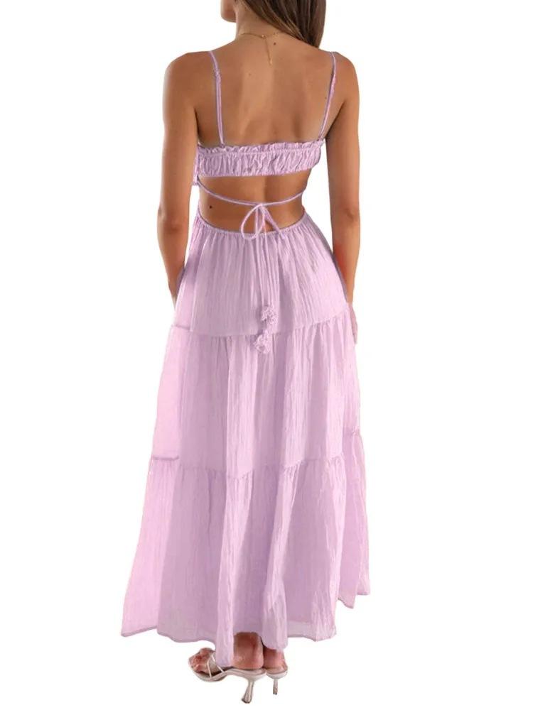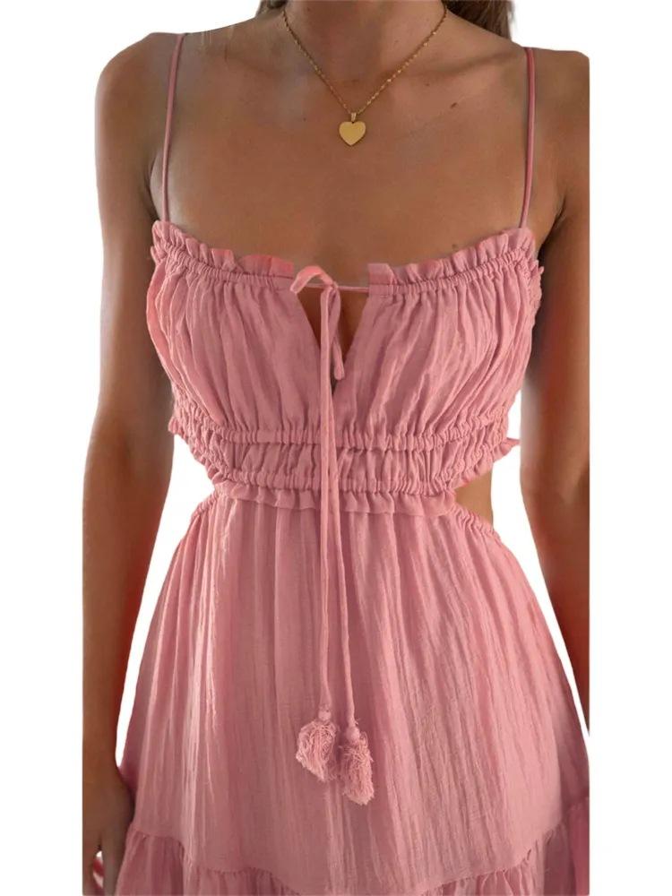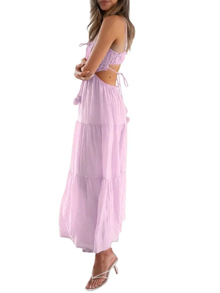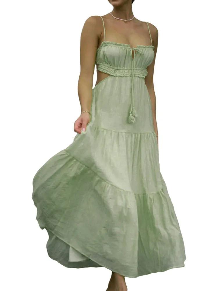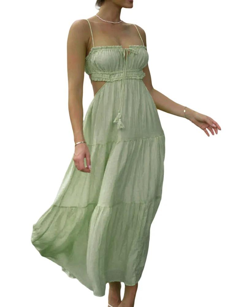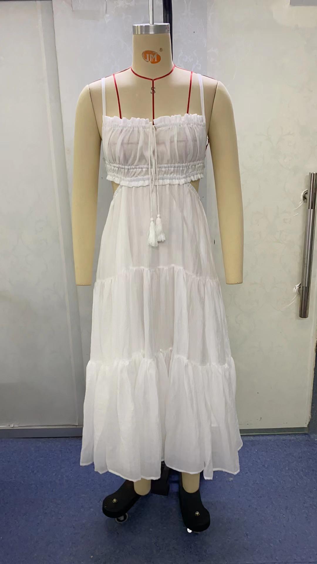 Ropa nueva de verano para mujer, temperamento europeo y americano transfronterizo, tirantes, sexy, hueco, falda larga, espalda descubierta, empalmado, vestido de gran vuelo